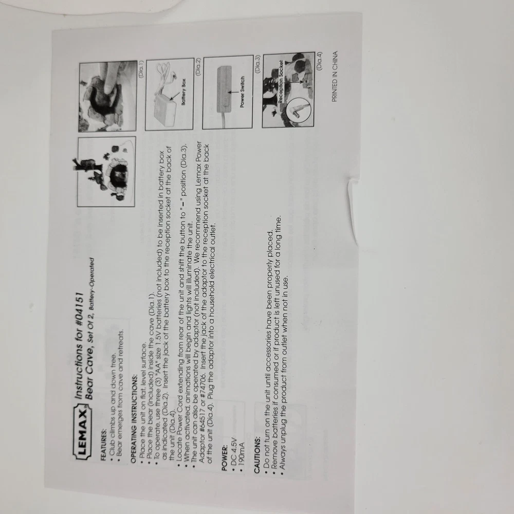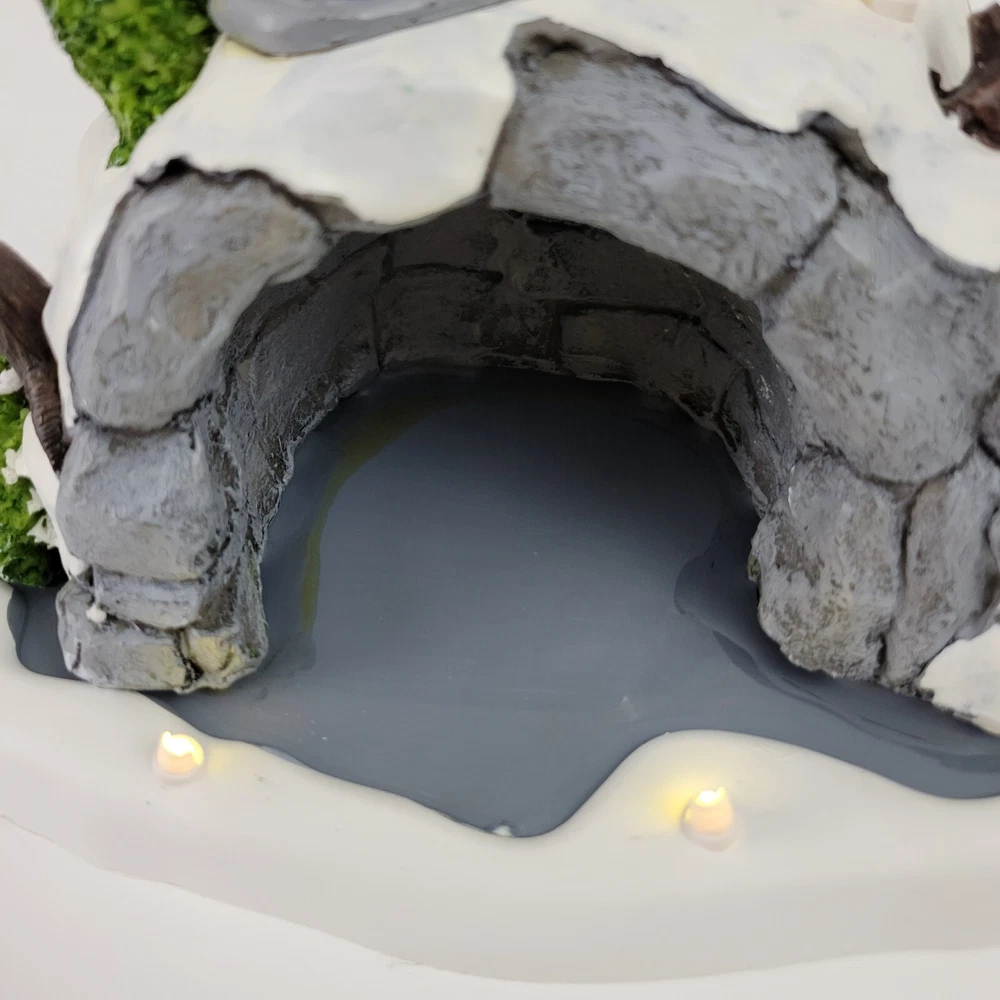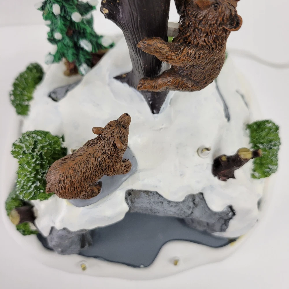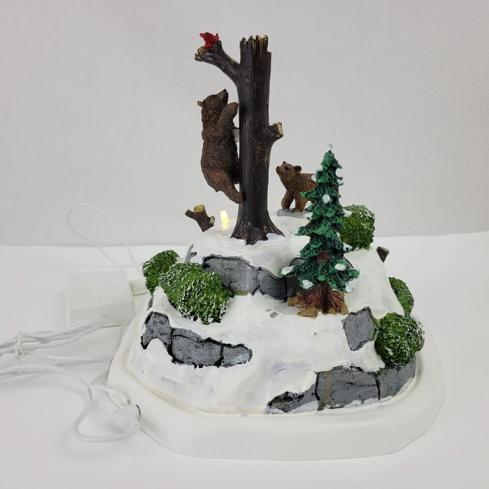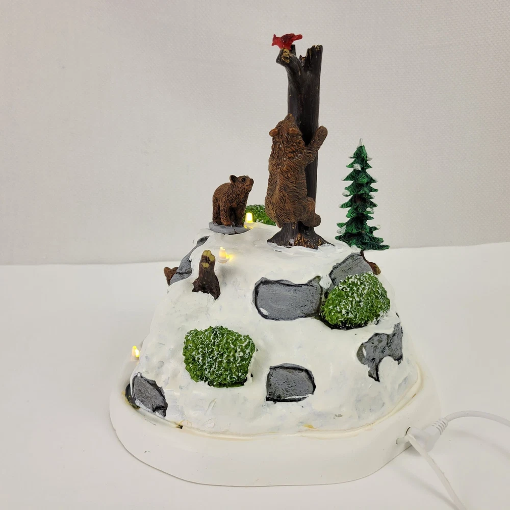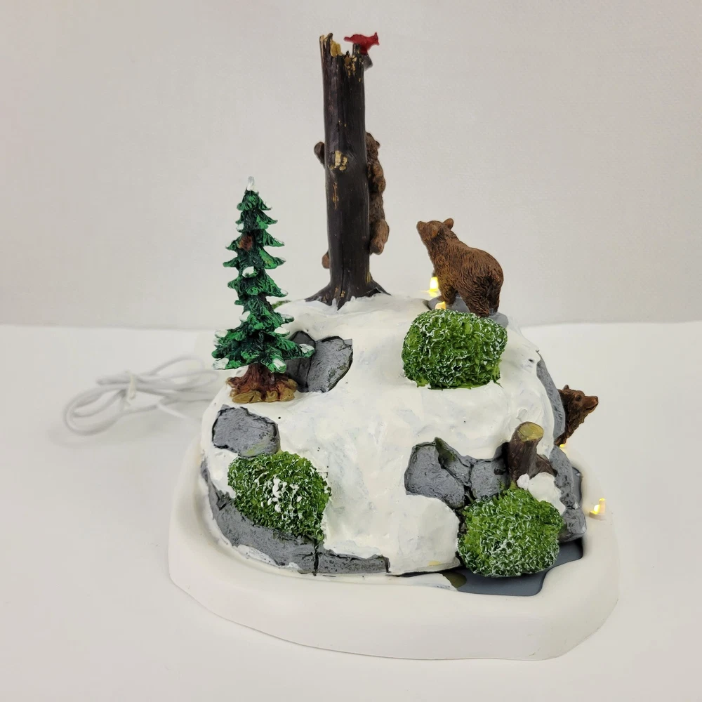 This is a very hard to find retired Lemax lighted and animated Bear Cave. The lights and the two bears move as expected. There do appear to be some missing branches on the pine tree in the background, but otherwise there don't appear to be any chips. There is some discoloration around the base, so please take a close look at the pictures for details. The cave comes in the original foam insert (with strap) and the box. The box has a fair amount of edging and dents so please take a look at those pictures. Included in the box is a battery power box to run the lights and animation. It requires 3 AA batteries (not included.)