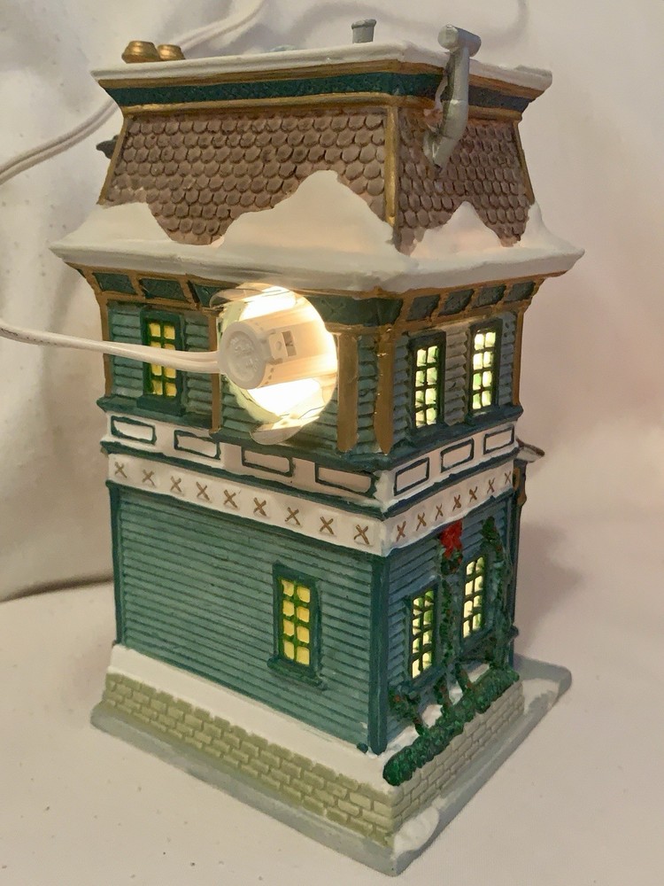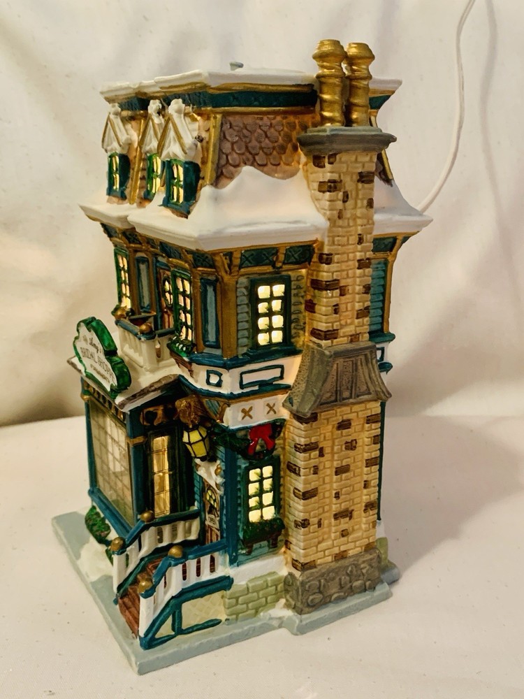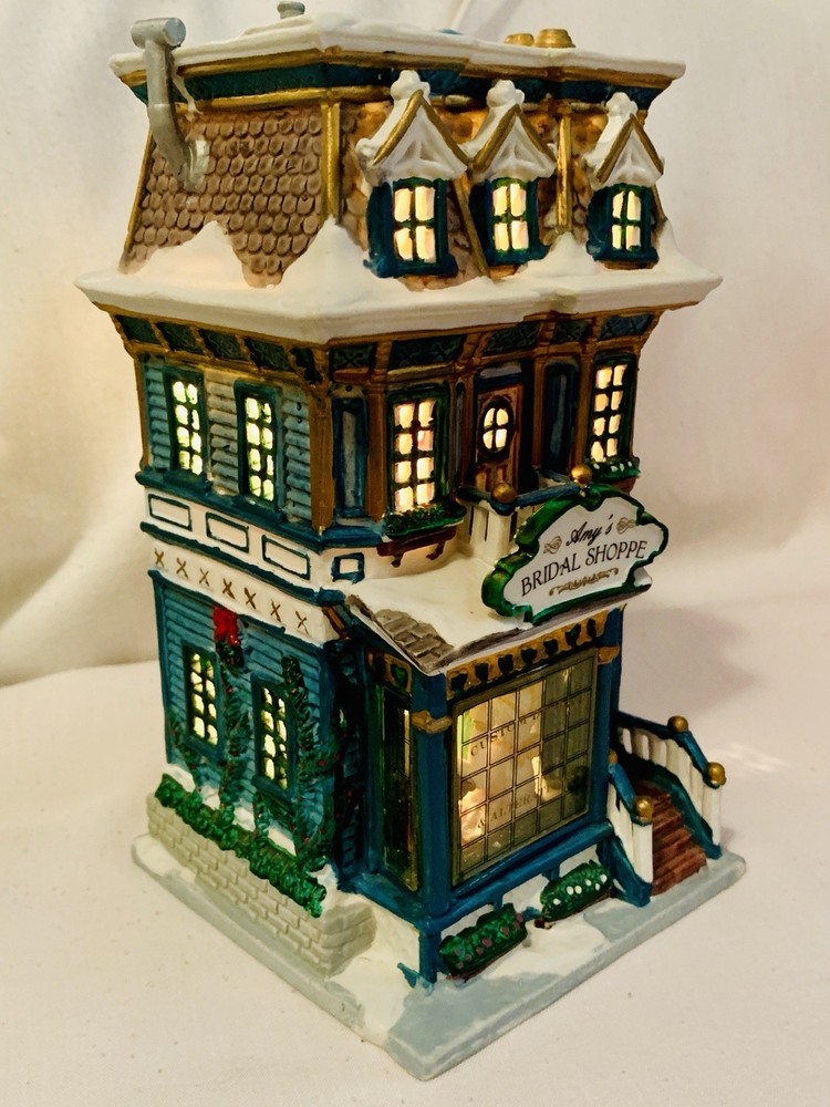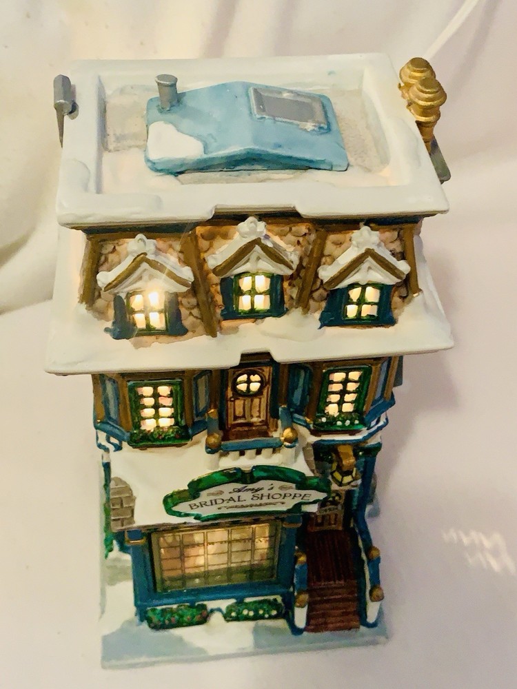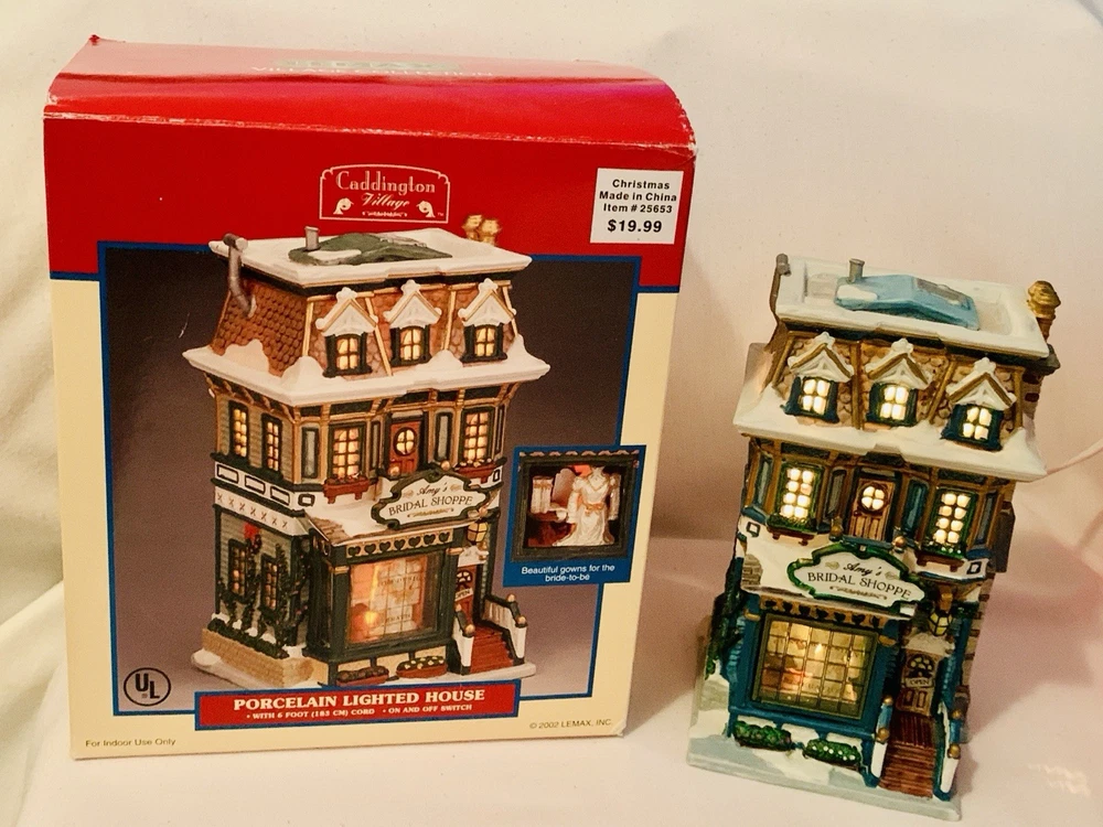 The Lemax Caddington Village Amy's Bridal Shoppe Porcelain Lighted House from 2002 is a beautifully crafted collectible piece perfect for Christmas enthusiasts. Made of high-quality porcelain with a multicolor painted finish, this rectangular-shaped house is part of the Caddington Village collection by Lemax. The illuminated bridal shoppe features intricate details and comes in its original packaging, making it a charming addition to any holiday display. This 21st-century piece captures the essence of American-style seasonal villages and is a must-have for collectors of Lemax products. The porcelain lighted house comes with a 6 foot cord with an on/off switch.
