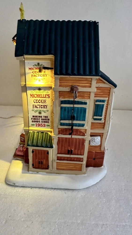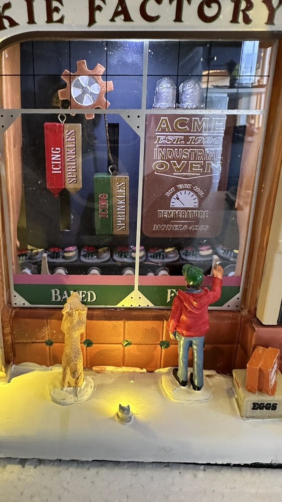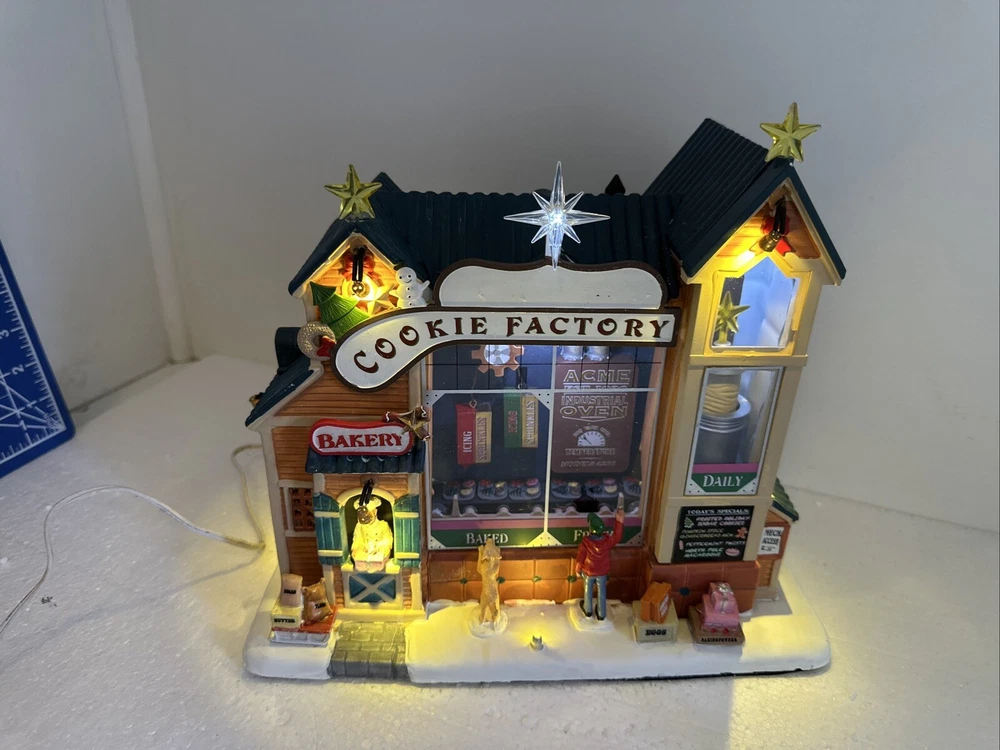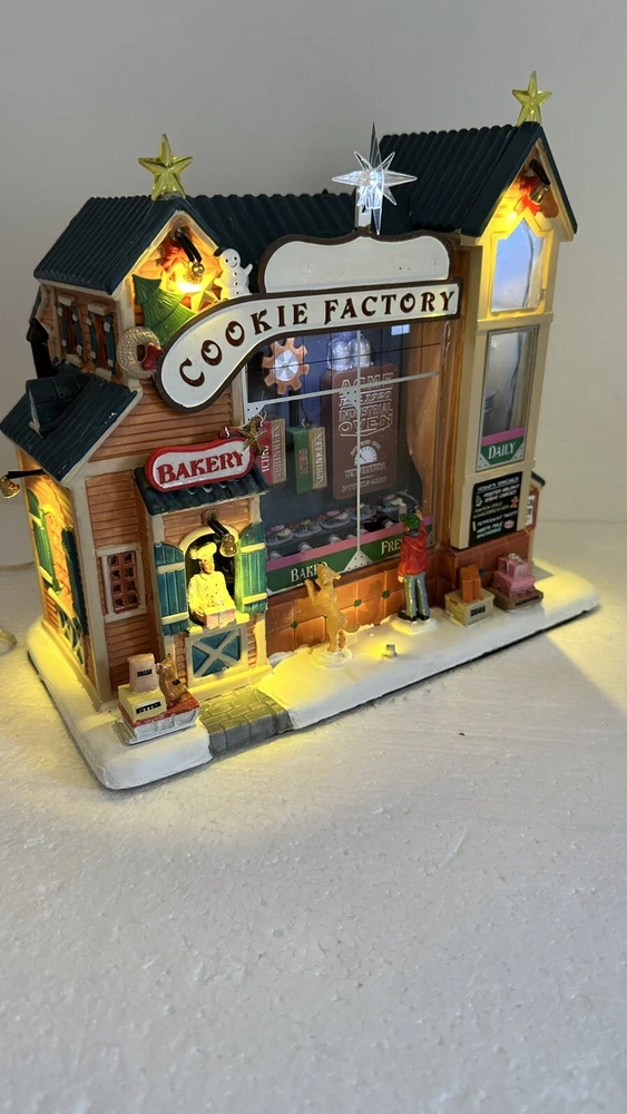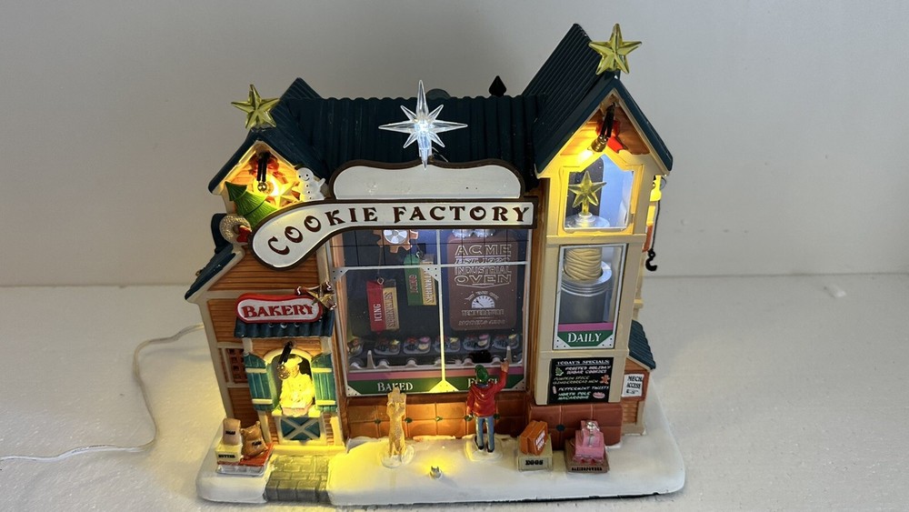All animation and lights work. Comes with LEMAX power adapter! Add a sweet touch to your Christmas decor with this charming Lemax Carole Town Christmas Cookie Factory. This retired piece from the 2013 collection features an asymmetrical design with a mix of ceramic and porcelain materials in a multicolor finish. The house is adorned with festive details and comes with village dioramas or table accents suitable for any room. The Rising Star Christmas Cookies Bakery House is part of the Carole Town Collection and is perfect for collectors or as a gift for teens and adults. This American-style house is easy to care for and can be cleaned with a damp cloth. The item comes in a box and has no additional parts required. Celebrate the holiday season with this charming piece that is sure to delight all who see it.