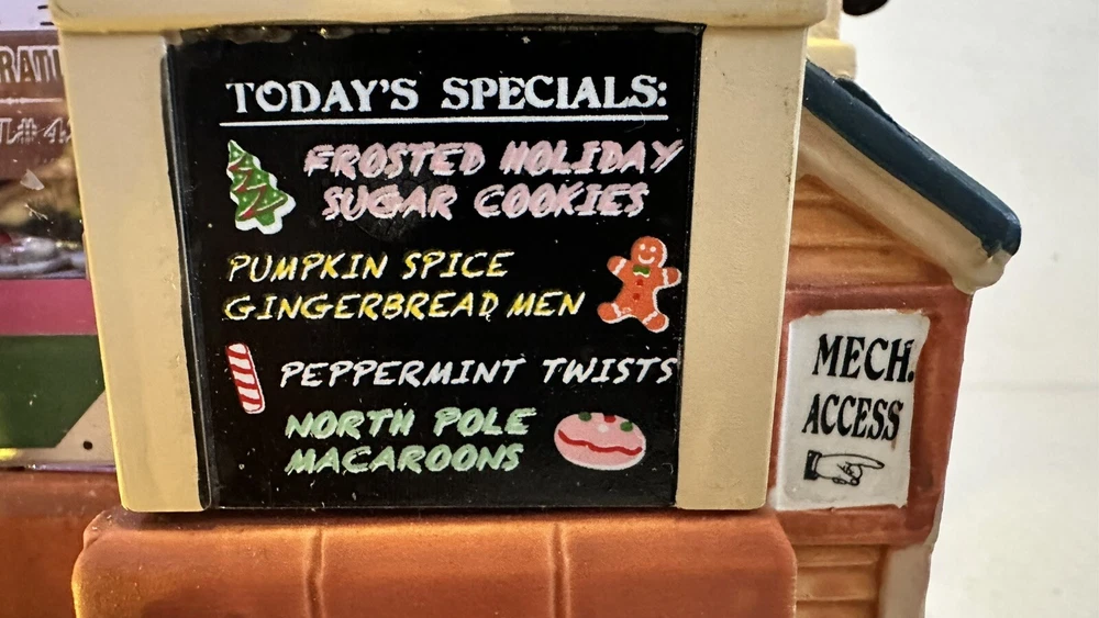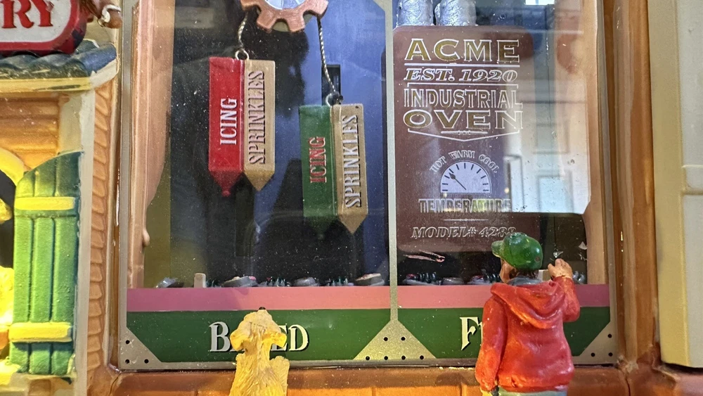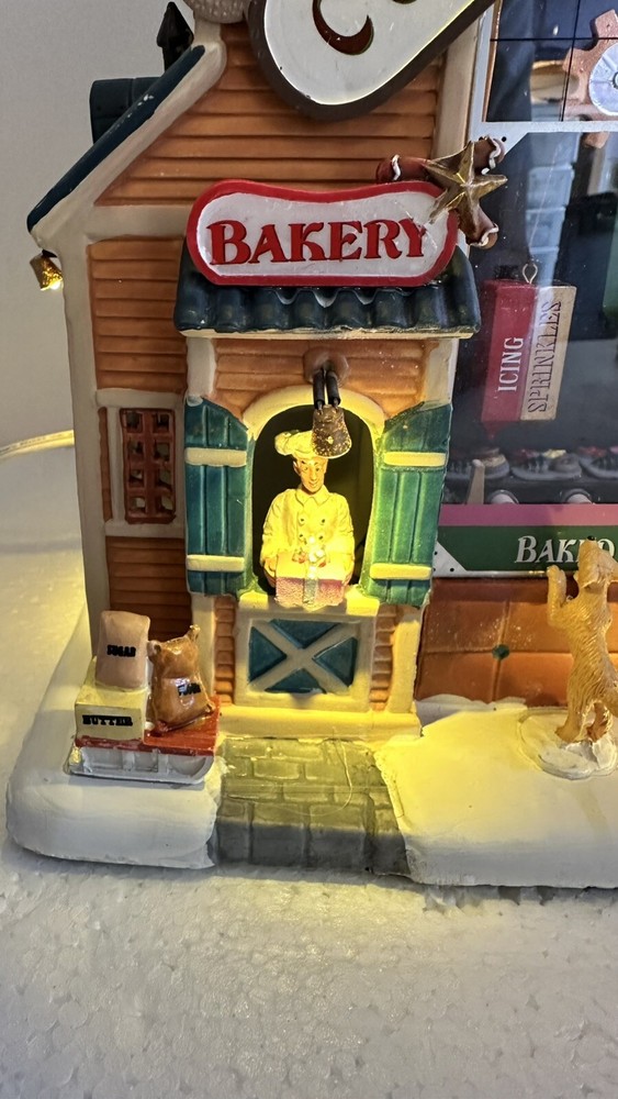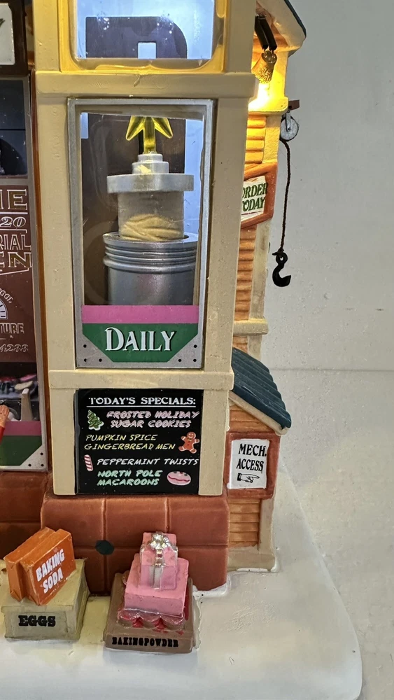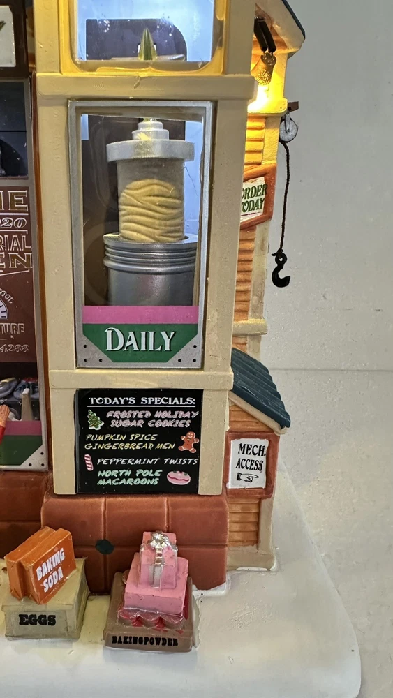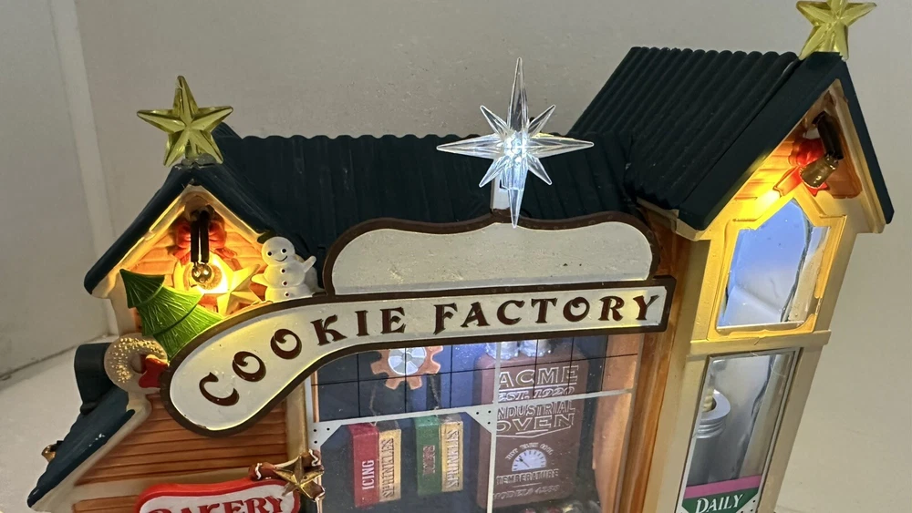 All animation and lights work. Comes with LEMAX power adapter! Add a sweet touch to your Christmas decor with this charming Lemax Carole Town Christmas Cookie Factory. This retired piece from the 2013 collection features an asymmetrical design with a mix of ceramic and porcelain materials in a multicolor finish. The house is adorned with festive details and comes with village dioramas or table accents suitable for any room. The Rising Star Christmas Cookies Bakery House is part of the Carole Town Collection and is perfect for collectors or as a gift for teens and adults. This American-style house is easy to care for and can be cleaned with a damp cloth. The item comes in a box and has no additional parts required. Celebrate the holiday season with this charming piece that is sure to delight all who see it.