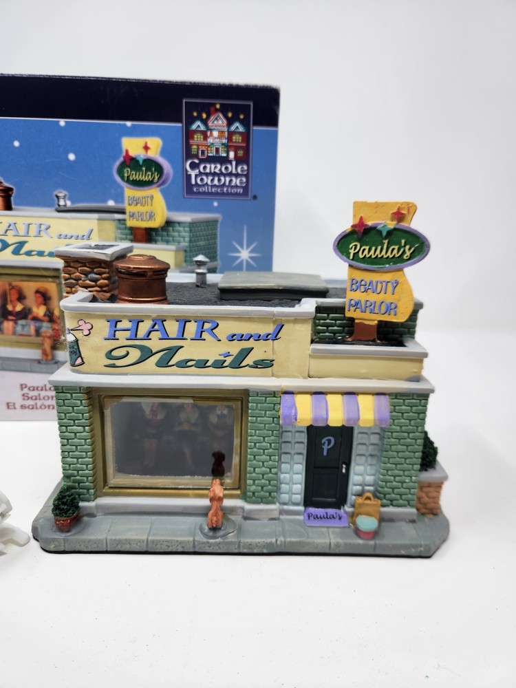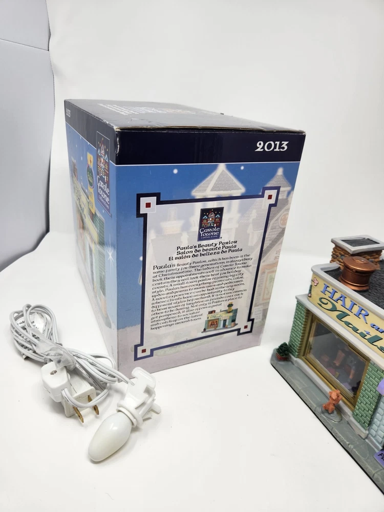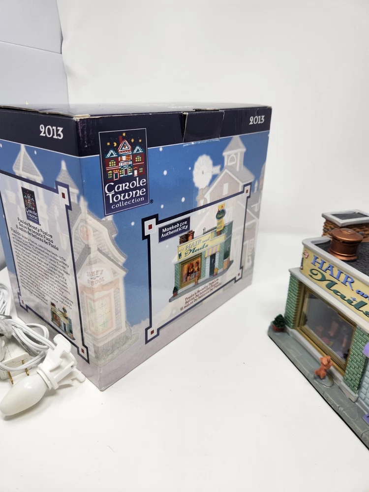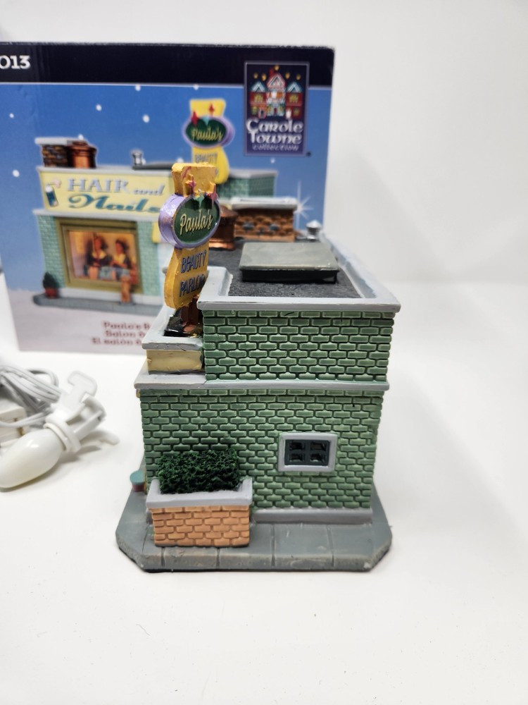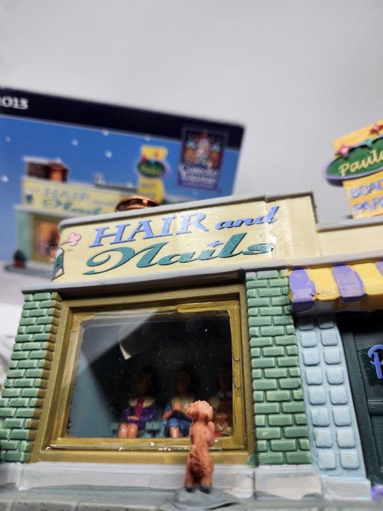 The product is a Lemax Carole Towne Paulas Beauty Parlor figurine from 2013, featuring a rectangular shape and multicolor design. This ceramic and porcelain Christmas village piece depicts a beauty parlor setting with illuminated features, suitable for display in any room. It comes in its original box, although the piece has some damage. The item is perfect for teens, adults, and kids alike to add to their seasonal decorations. Missing bush on corner. Sign is loose dog is loose and bucket is loose. Box in good condition with some damage