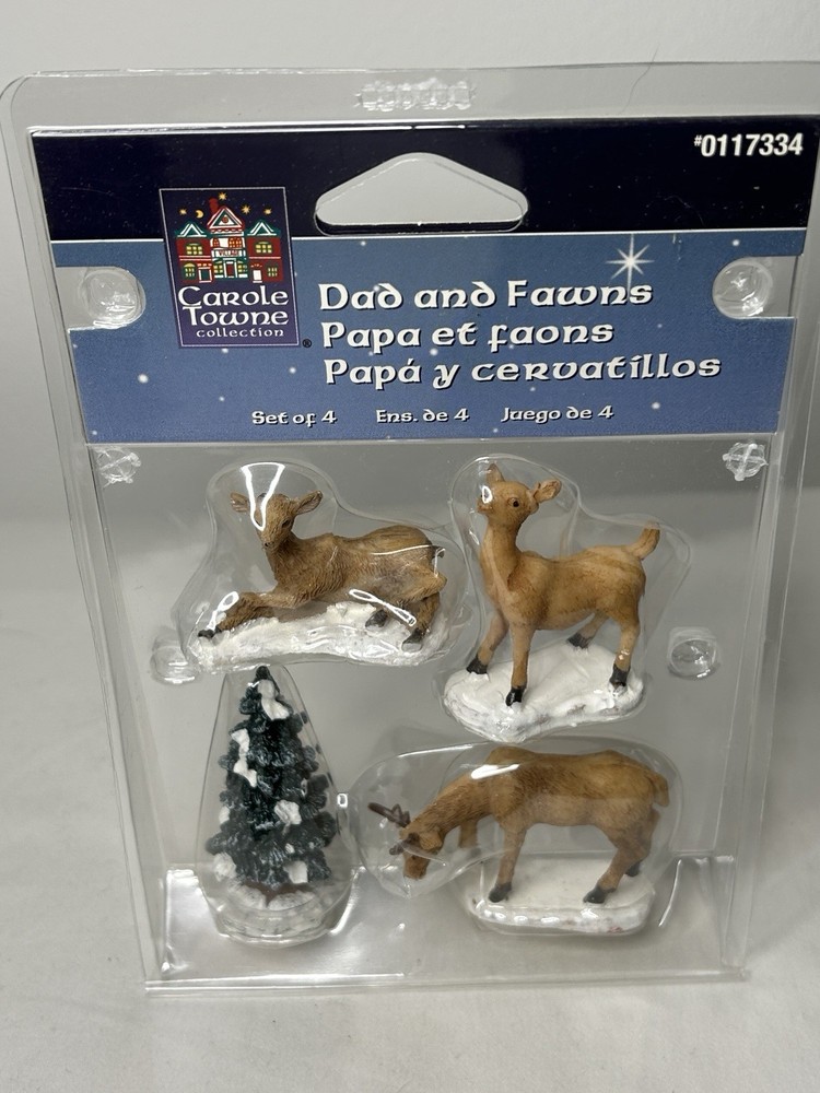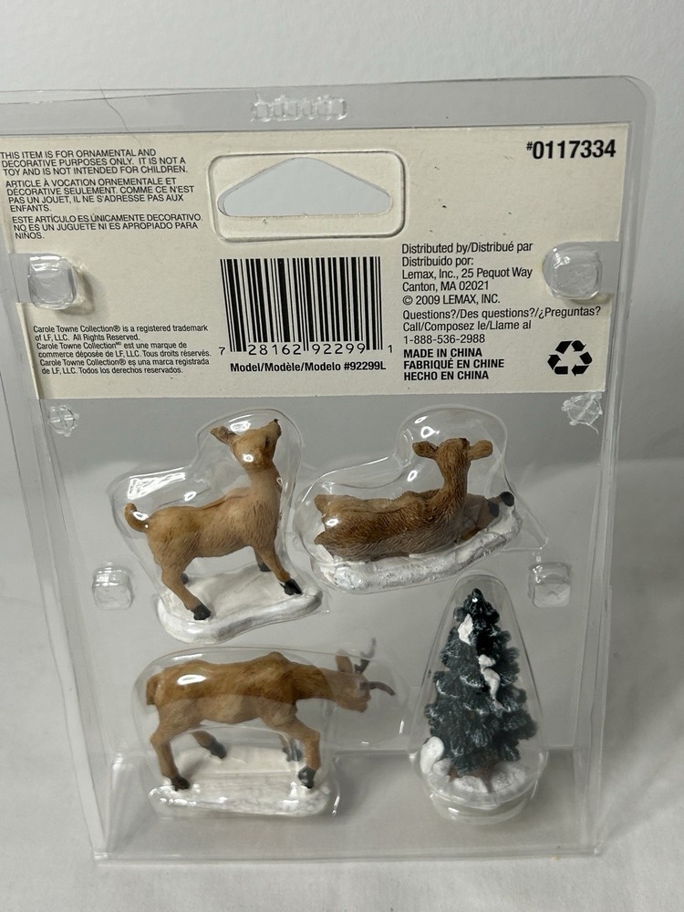 This set of three Carole Towne Collection by Lemax offers a charming, whimsical woodland animals, a father and fawn figurines, and a street clock that brings a touch of animation to any seasonal display. Each piece is meticulously crafted with attention to detail, showcasing a delightful blend of animals, trees, and clock motifs that embody the spirit of the outdoors.Ideal for collectors and holiday enthusiasts alike, these figurines and clock are sure to enhance your festive decorations with their quaint charm and timeless design. Whether displayed on a mantel, in a village setting, or as part of a train collection, these pieces from the Lemax Carole Towne Collection add a touch of magic to any setting. All New-In-Package - all packages in mint condition.