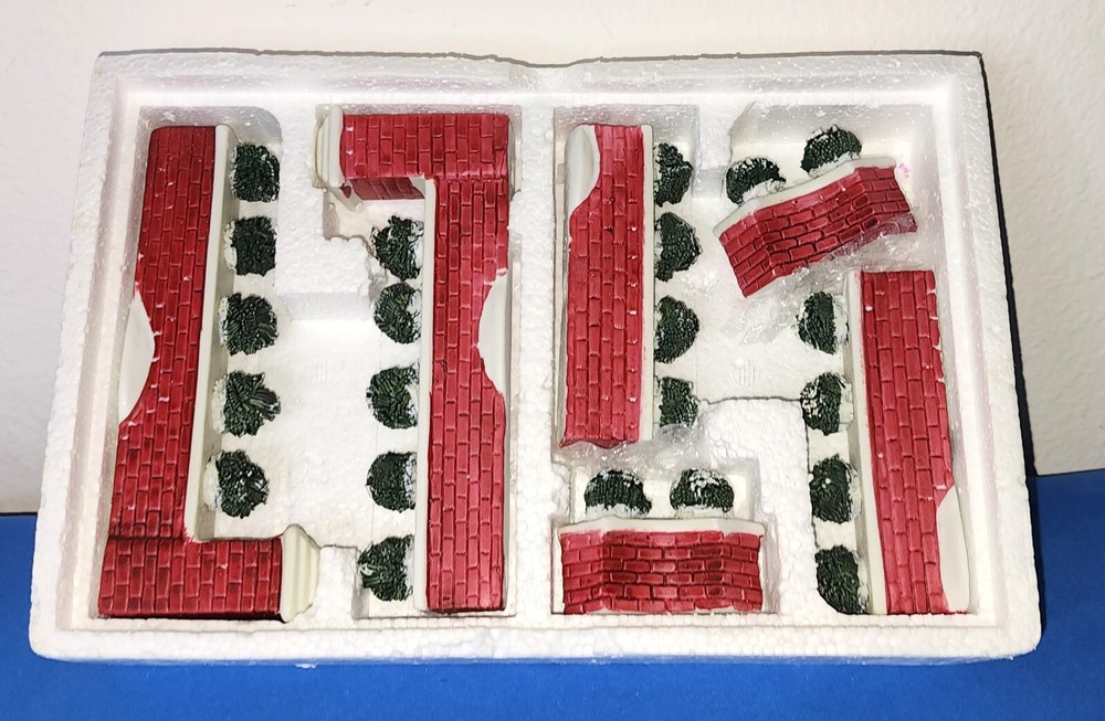 6 Piece Lemax Christmas Village Brick Wall Set, Snow & Bushes Porcelain Very Good Condition Each side of wall is approximately 7" Long