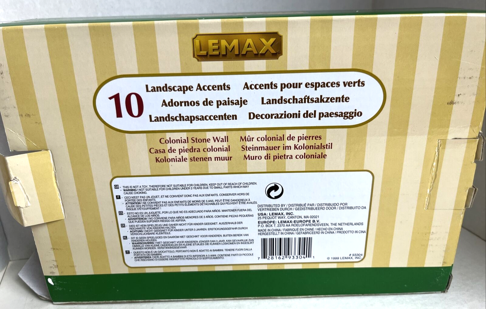 Subject:LandscapeCollection:LEMAXDepartment:AdultsOccasion:ChristmasCharacter Family:Colonial Stone WallPackaging:BoxYear Manufactured:1999gtin13:728162933041Suitable For:Christmas VillageRoom:Any RoomSeller Notes:“Great condition, comes with box”Number in Pack:10Material:ResinStyle:ColonialTime Period Manufactured:1990-1999Type:Christmas VillageTheme:SeasonalBrand:LemaxEra:Late 20th Century (1970-1999)UPC:728162933041Features:Boxed, Multi-Part