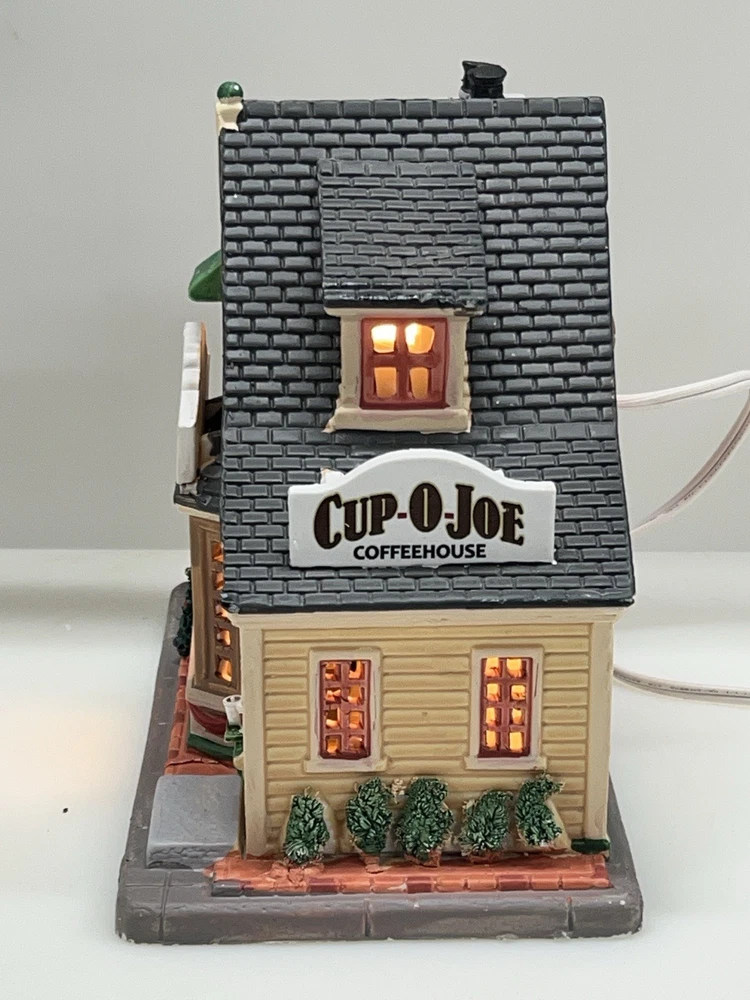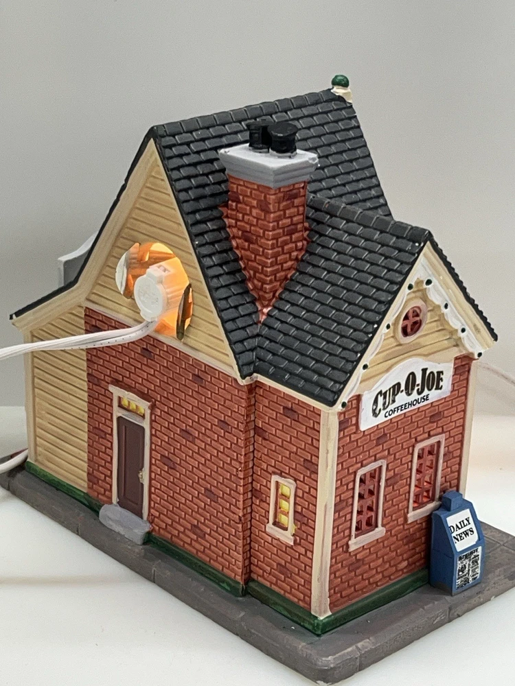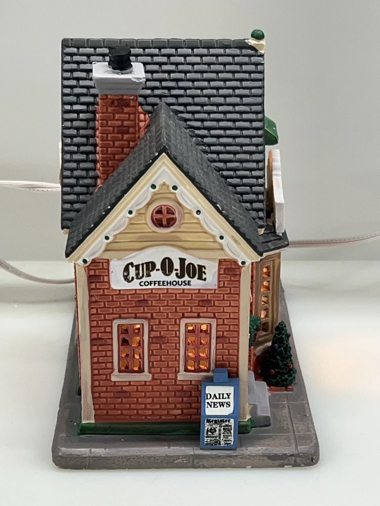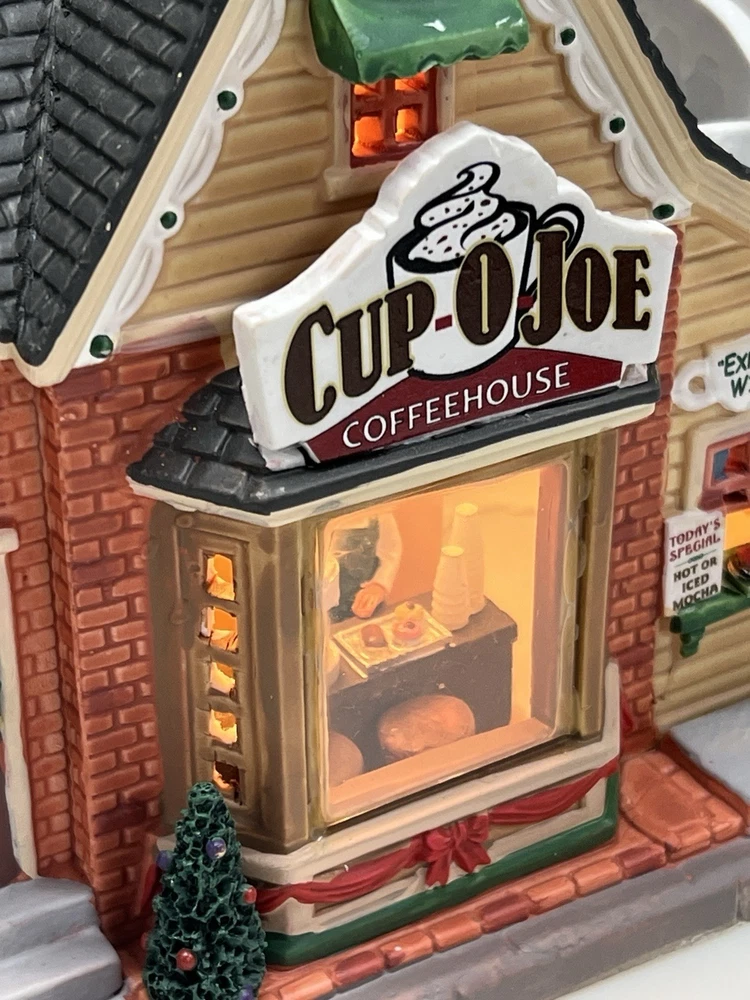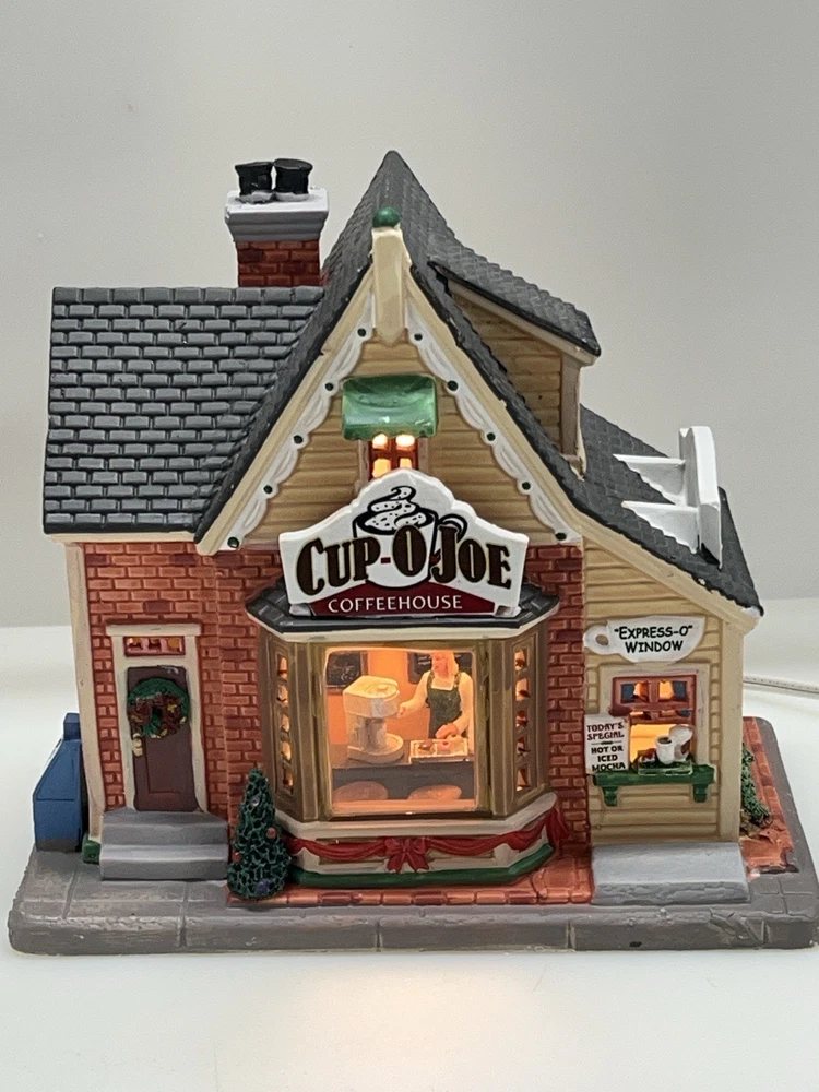 Add a cozy and vibrant touch to your Christmas decor with the Lemax Cup O Joe Porcelain Lighted Coffee House. This charming piece from the 2013 Seasons Collection paints a quaint picture of a beloved coffeehouse, complete with intricate hand-painted details and a warm, inviting glow. The asymmetrical structure, standing at 7 inches in height and measuring 8 inches in length with a width of 4.75 inches, is meticulously crafted from porcelain, showcasing a delightful multicolored finish that captures the essence of festive spirit. Designed to be a standout addition to any room, the Coffee House is fully functional with a lighted feature that creates a captivating ambiance. It comes in its original packaging, ensuring it's a retired collectible that's ready to display. With no additional parts required, this traditional-style piece makes a delightful gift or a cherished collectible for those who appreciate the whimsical charm of seasonal villages. Perfect pristine condition! Looks like new ! Includes all clean original packaging including cord & light .