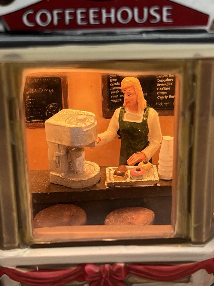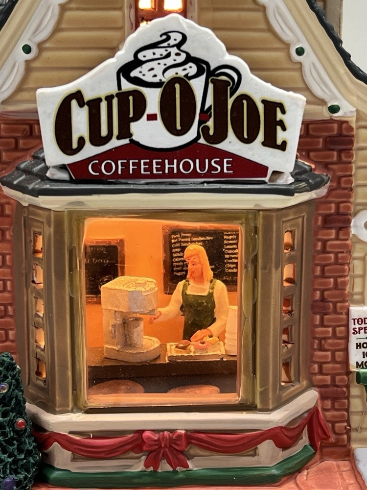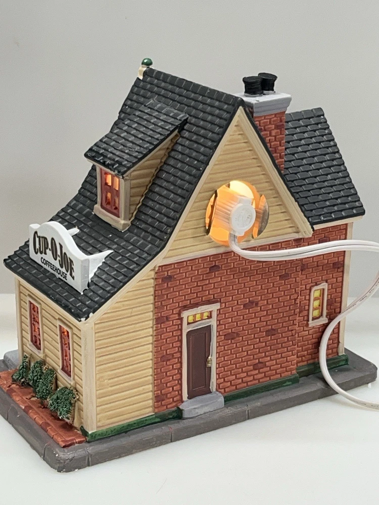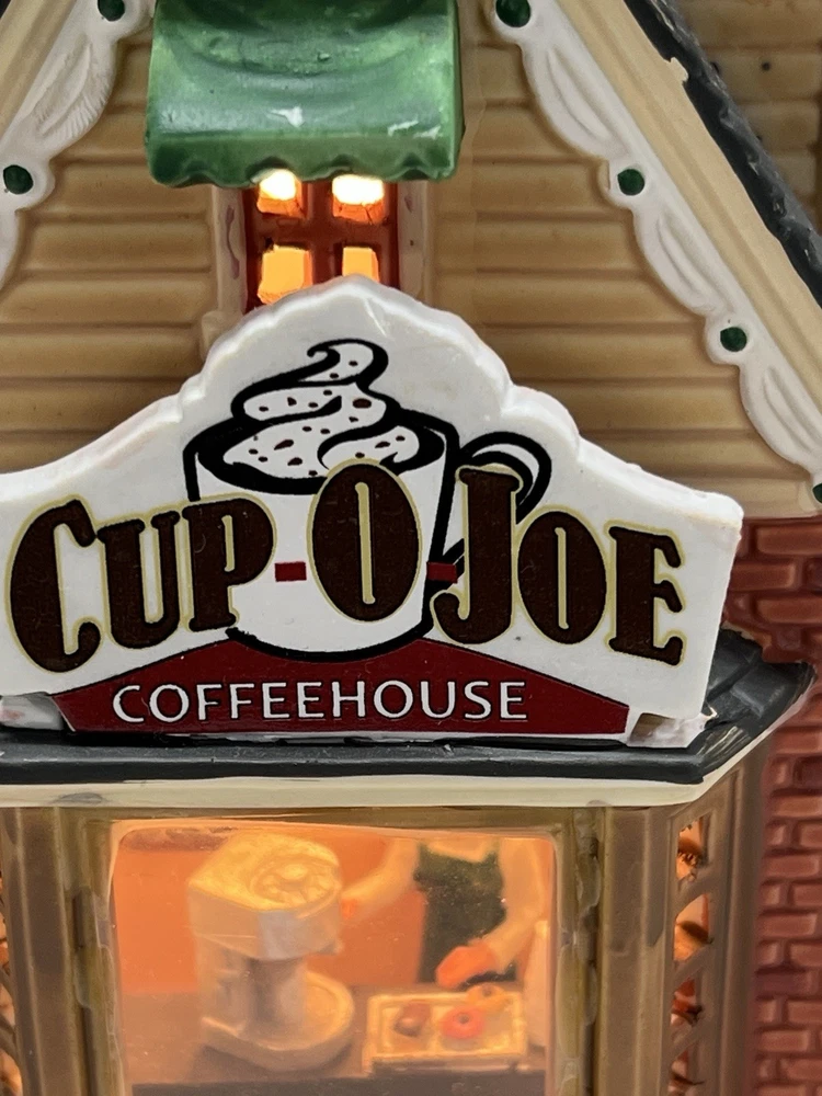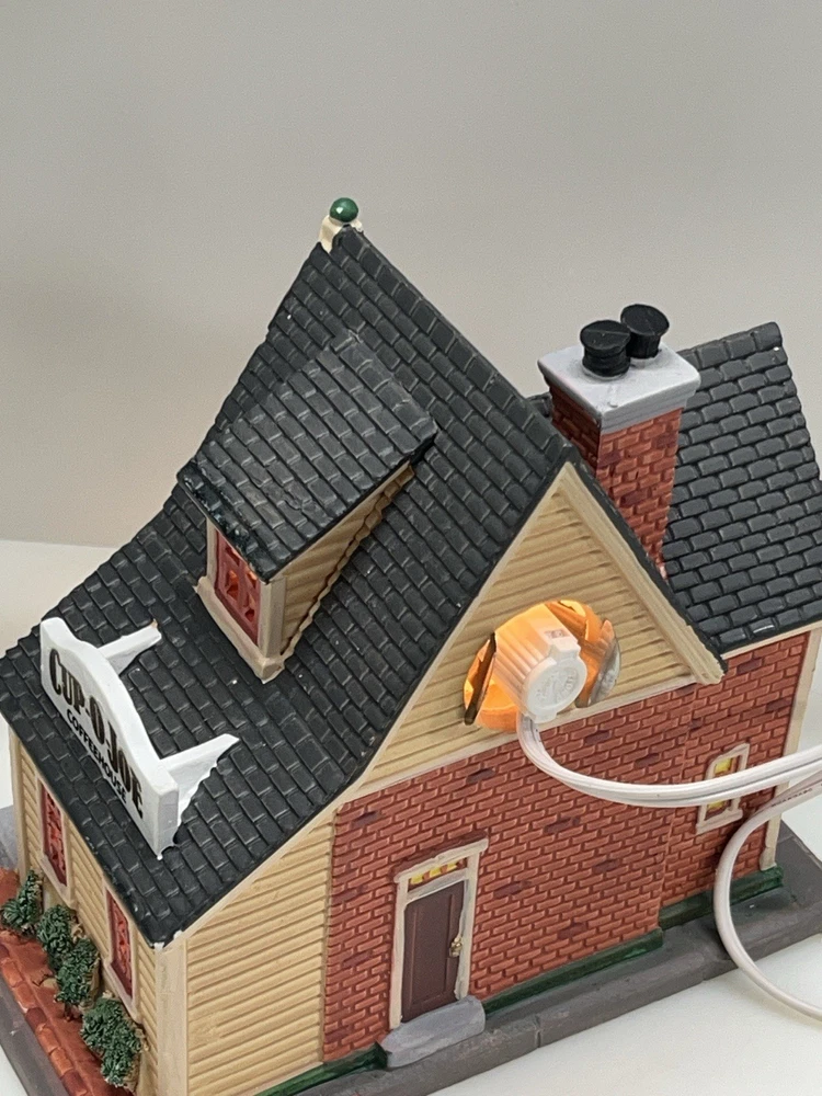Add a cozy and vibrant touch to your Christmas decor with the Lemax Cup O Joe Porcelain Lighted Coffee House. This charming piece from the 2013 Seasons Collection paints a quaint picture of a beloved coffeehouse, complete with intricate hand-painted details and a warm, inviting glow. The asymmetrical structure, standing at 7 inches in height and measuring 8 inches in length with a width of 4.75 inches, is meticulously crafted from porcelain, showcasing a delightful multicolored finish that captures the essence of festive spirit. Designed to be a standout addition to any room, the Coffee House is fully functional with a lighted feature that creates a captivating ambiance. It comes in its original packaging, ensuring it's a retired collectible that's ready to display. With no additional parts required, this traditional-style piece makes a delightful gift or a cherished collectible for those who appreciate the whimsical charm of seasonal villages. Perfect pristine condition! Looks like new ! Includes all clean original packaging including cord & light .