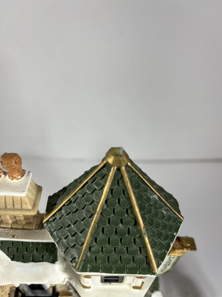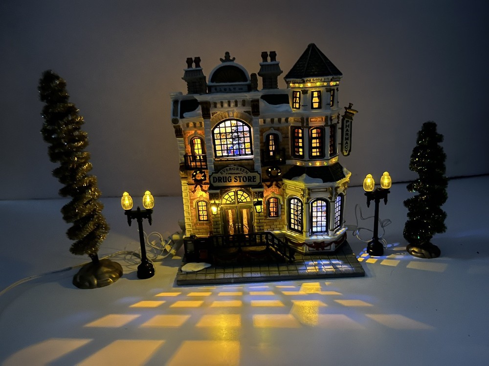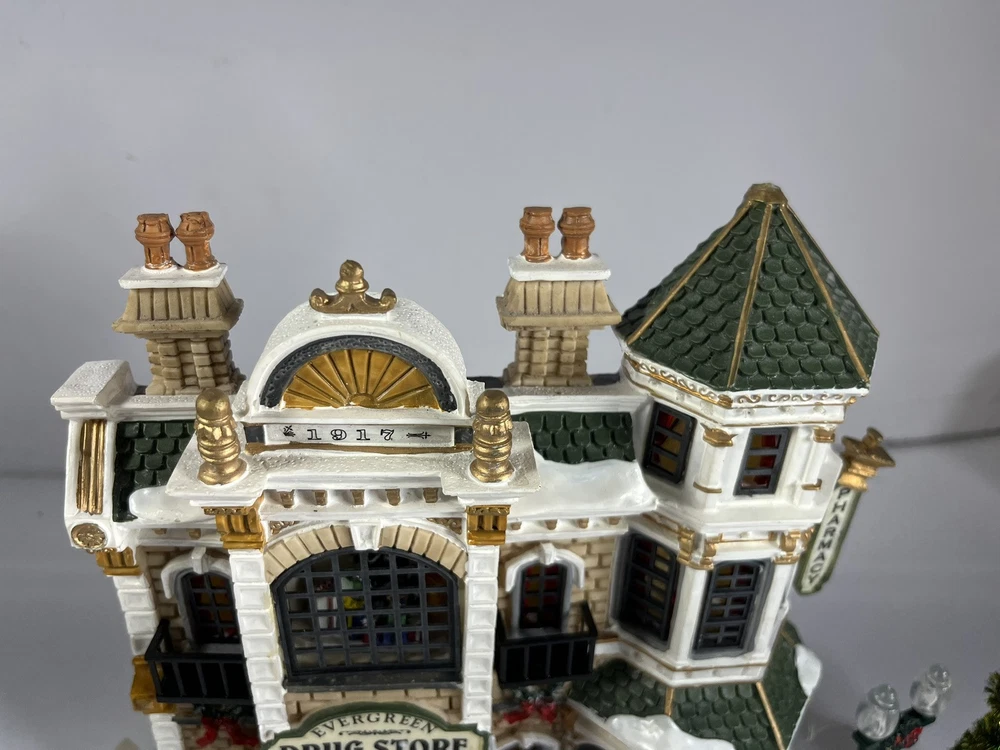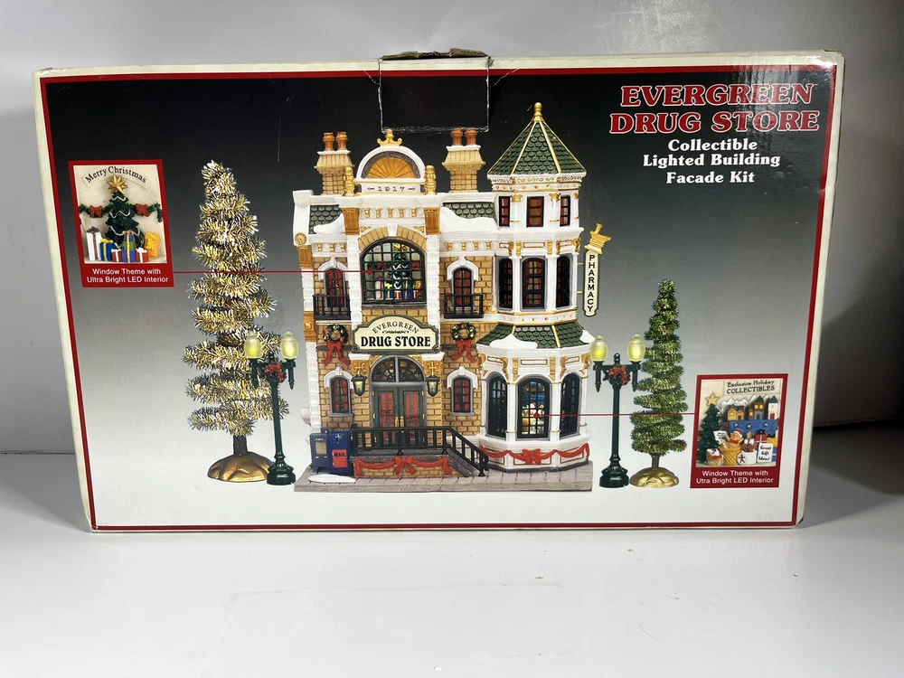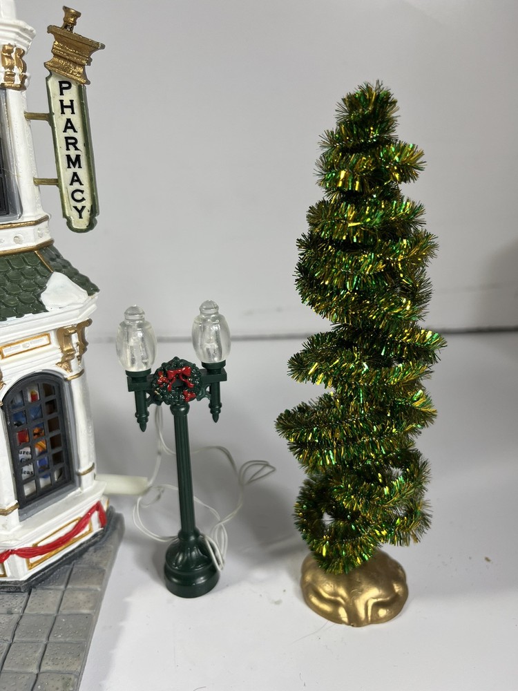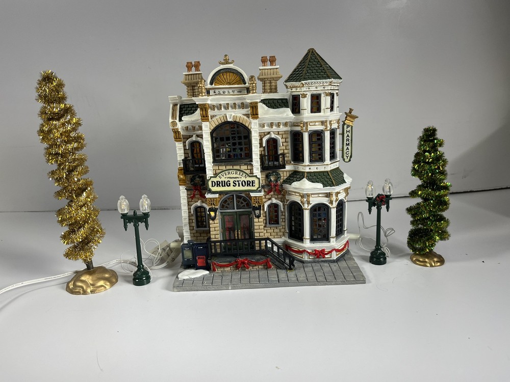 Lemax Essex Street Facade Evergreen Drug Store Fiber Optic BONUS Trees/lightpost NOTE: one lightpost is missing the wreath and a bo All is broken off and missing from the roof peak, see closeup photo. Comes in original box, lights work great and it does come with an AC adapter