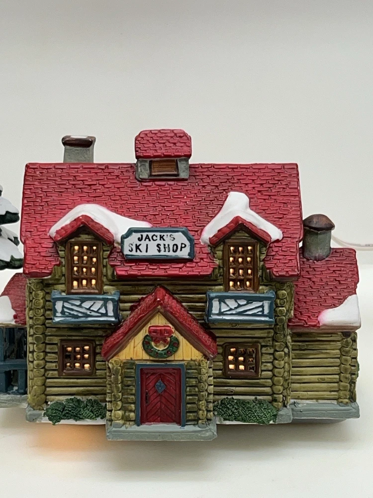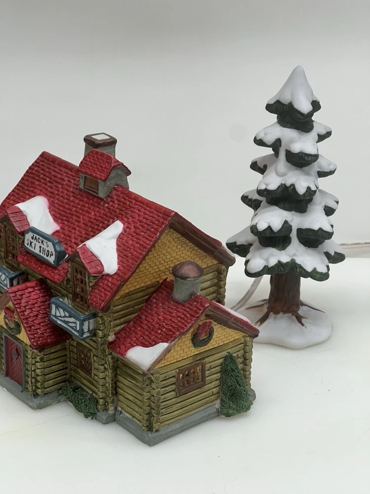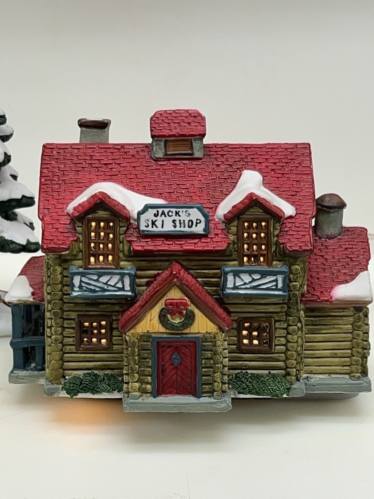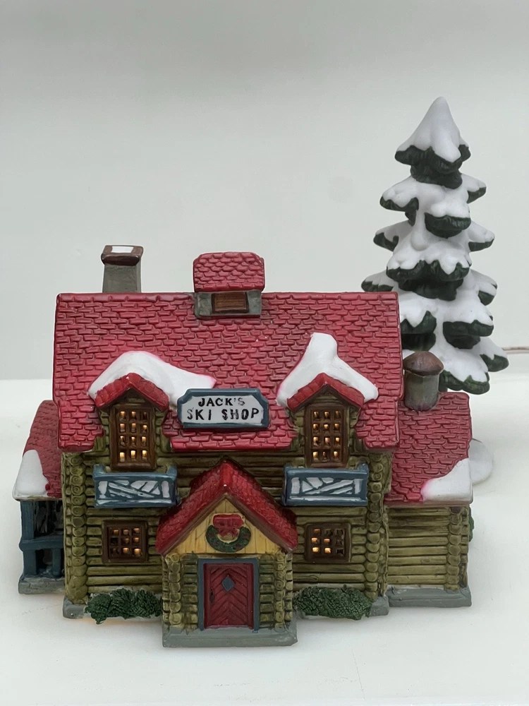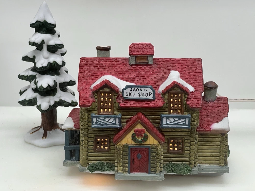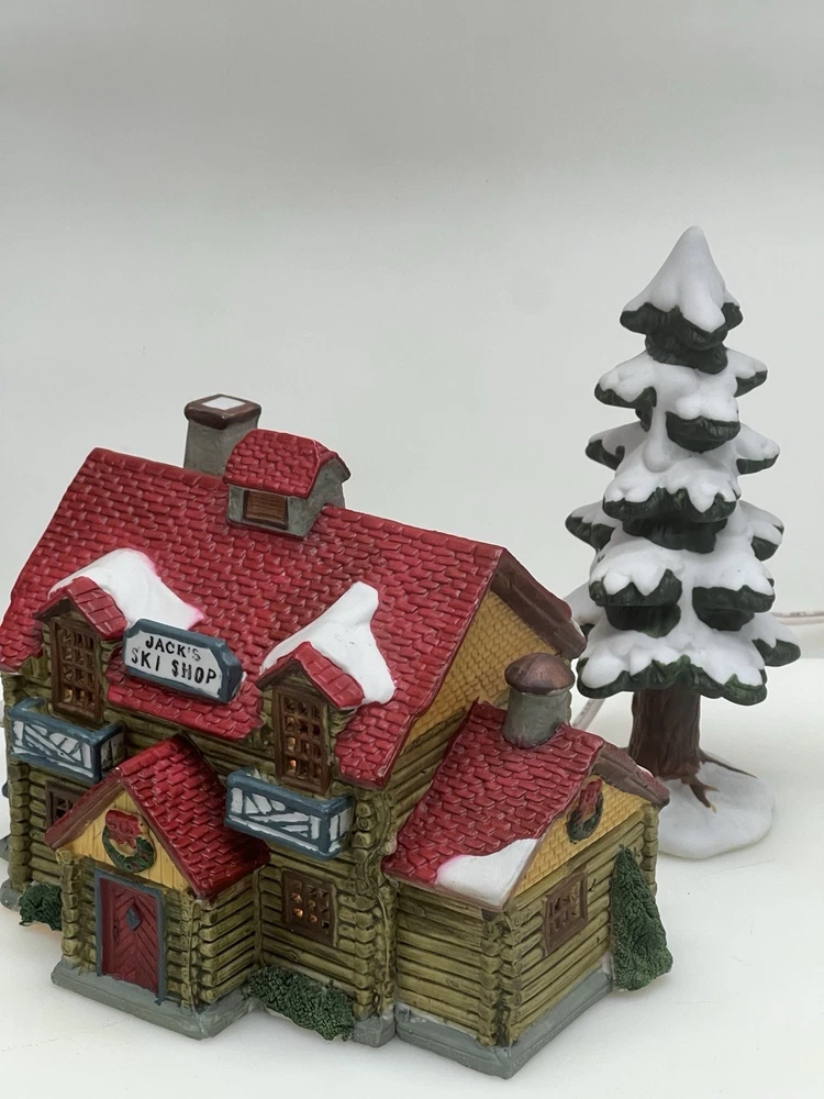 The Lemax Hearthside Village "Jack's Ski Shop" set of two retired 1995 pieces is a charming addition to any holiday or seasonal village display. This painted, illuminated ski house feature whimsical designs and are hand-painted with vibrant multicolor finishes. Made of porcelain and measuring 7 inches in length and 5 inches in height, these collectibles are perfect for adults and fit any room in the house during the winter season. With a nostalgic theme from the late 20th century, these pieces are a delightful and unique addition to your holiday decor collection. Perfect condition . Includes porcelain tree. Comes with all clean original packaging including cord and light. SouthCt