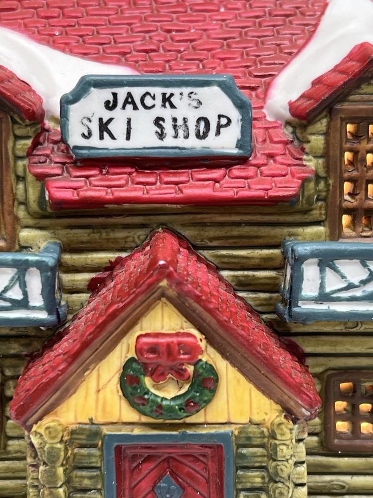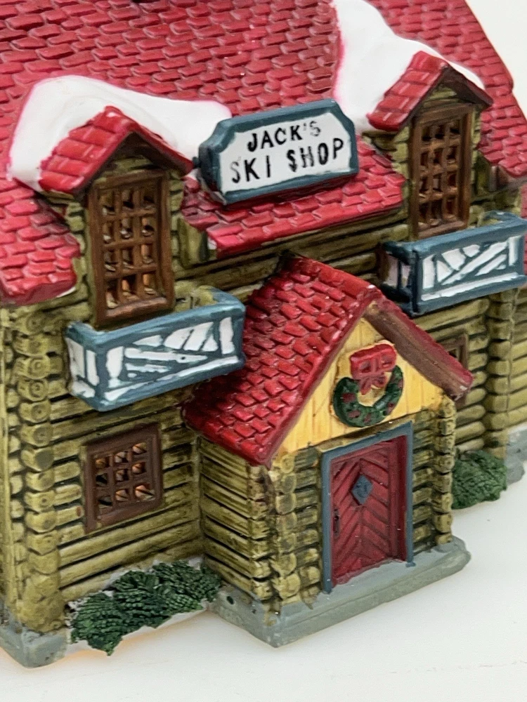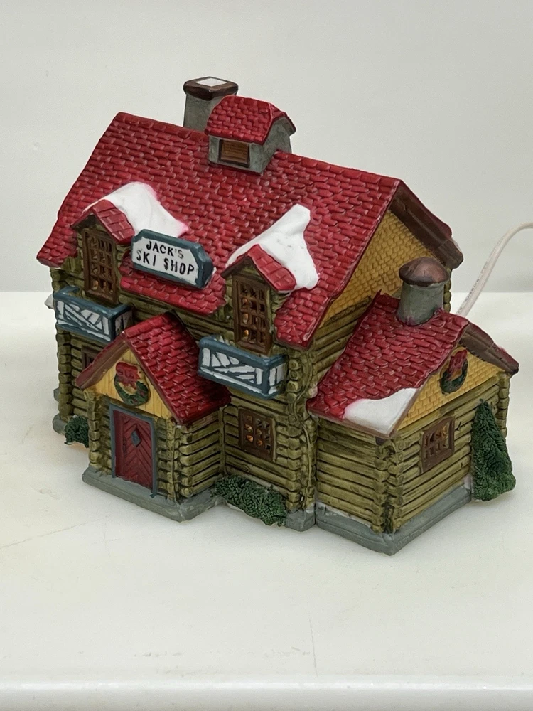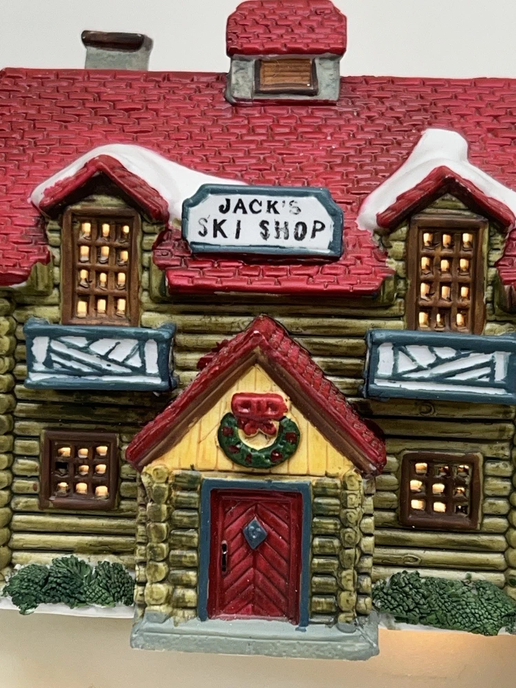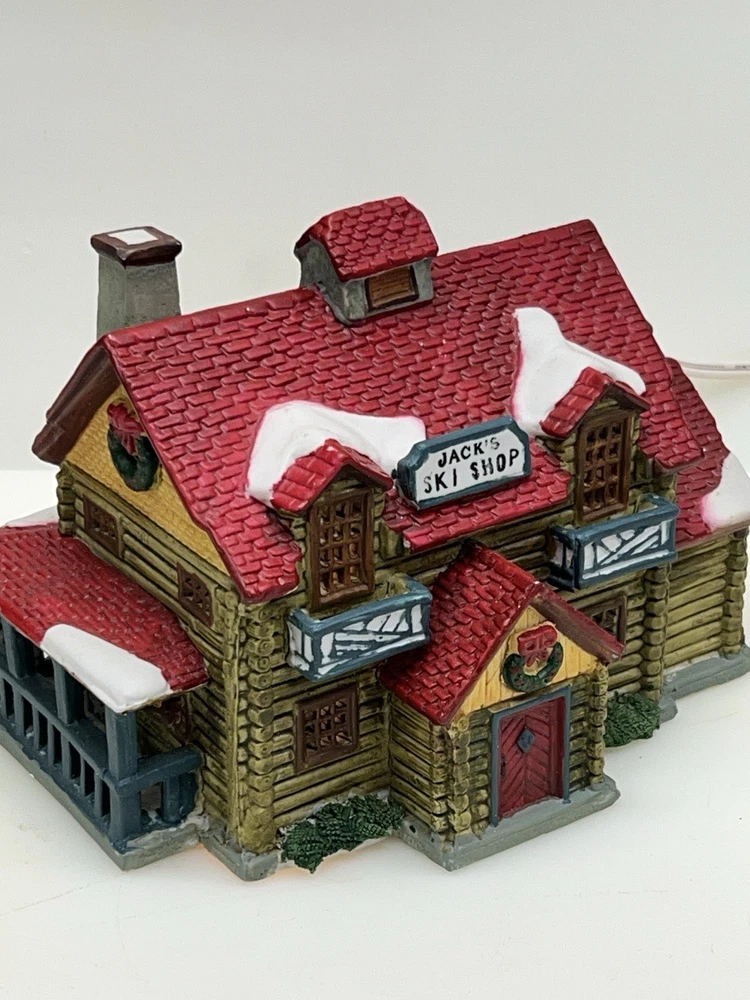 The Lemax Hearthside Village "Jack's Ski Shop" set of two retired 1995 pieces is a charming addition to any holiday or seasonal village display. This painted, illuminated ski house feature whimsical designs and are hand-painted with vibrant multicolor finishes. Made of porcelain and measuring 7 inches in length and 5 inches in height, these collectibles are perfect for adults and fit any room in the house during the winter season. With a nostalgic theme from the late 20th century, these pieces are a delightful and unique addition to your holiday decor collection. Perfect condition . Includes porcelain tree. Comes with all clean original packaging including cord and light. SouthCt