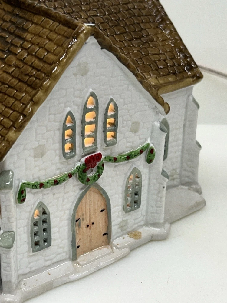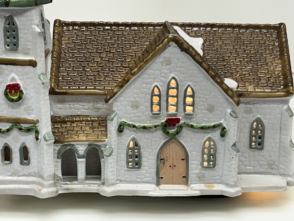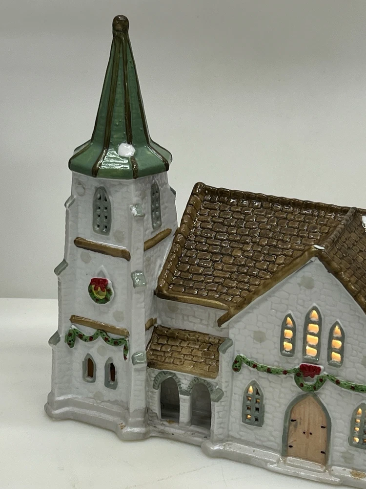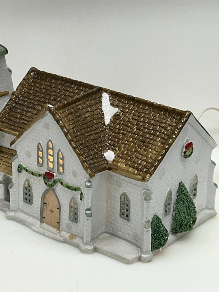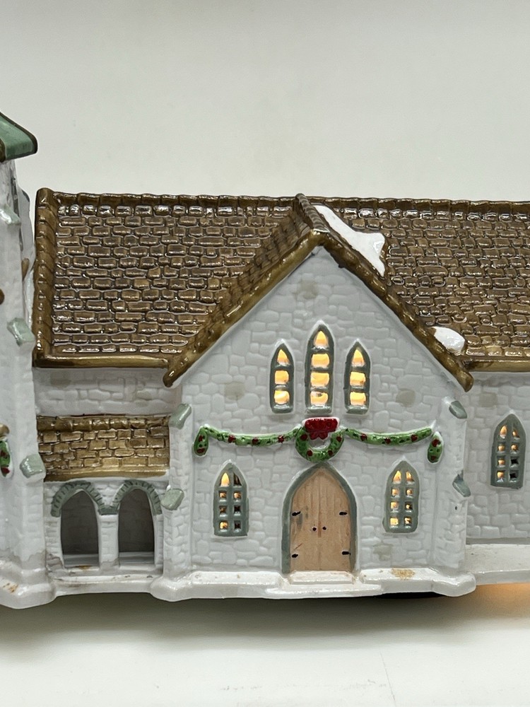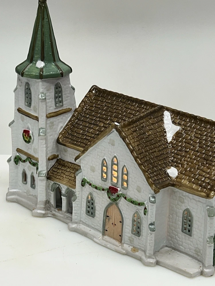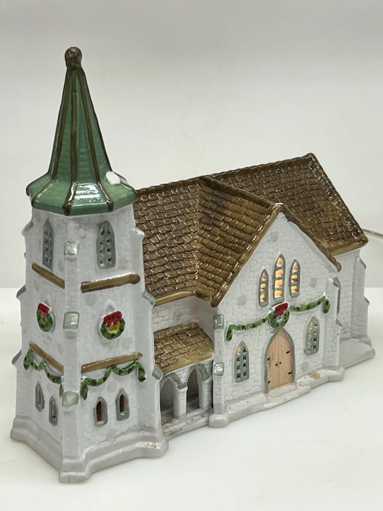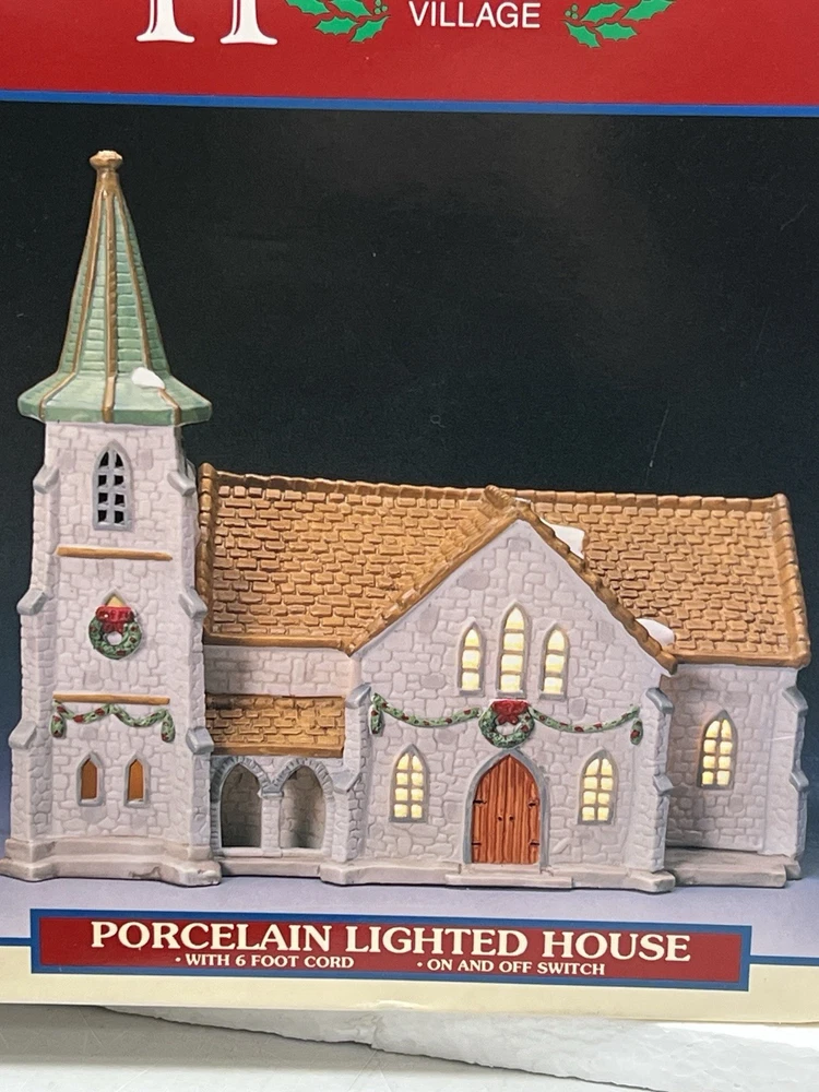 The Lemax Hearthside Village Porcelain CHURCH Christmas Village House Vintage 1992 is a beautifully crafted collectible piece perfect for any Christmas village display. This medium-sized, hand-painted cathedral features illuminated windows and is part of the retired Hearthside Village collection. Made of porcelain and showcasing a traditional style with a multicolor finish, this vintage building from 1992 is a charming addition to any seasonal decor. Perfect for adults and suitable for indoor use, this vintage piece from China is a must-have for collectors of Christmas villages. 1992 !! Excellent condition . Comes with all original packaging including the cord and light SouthCt