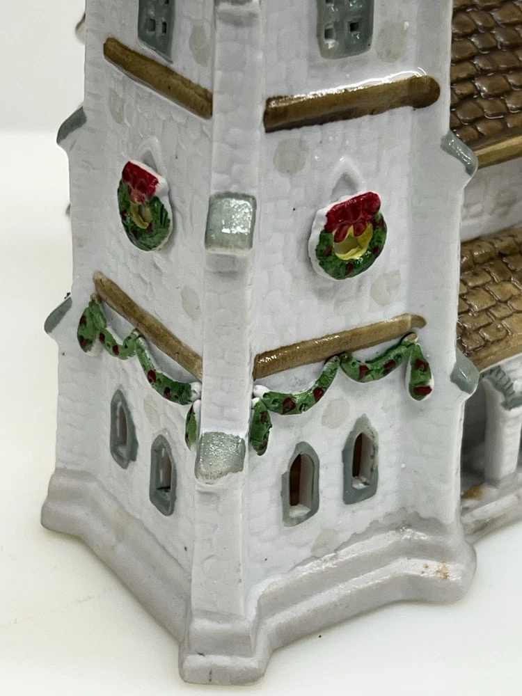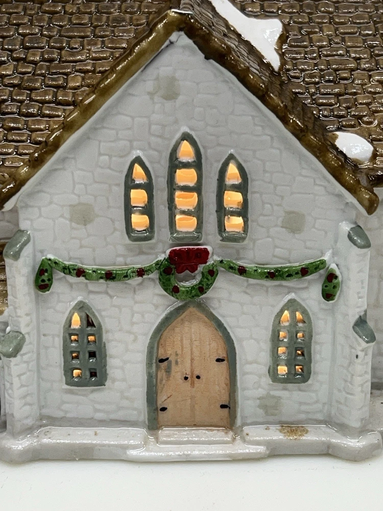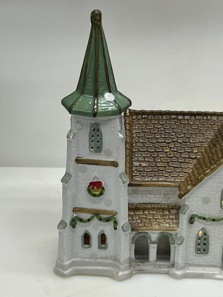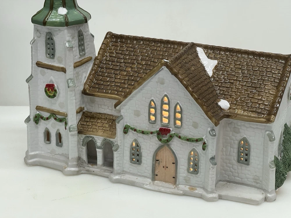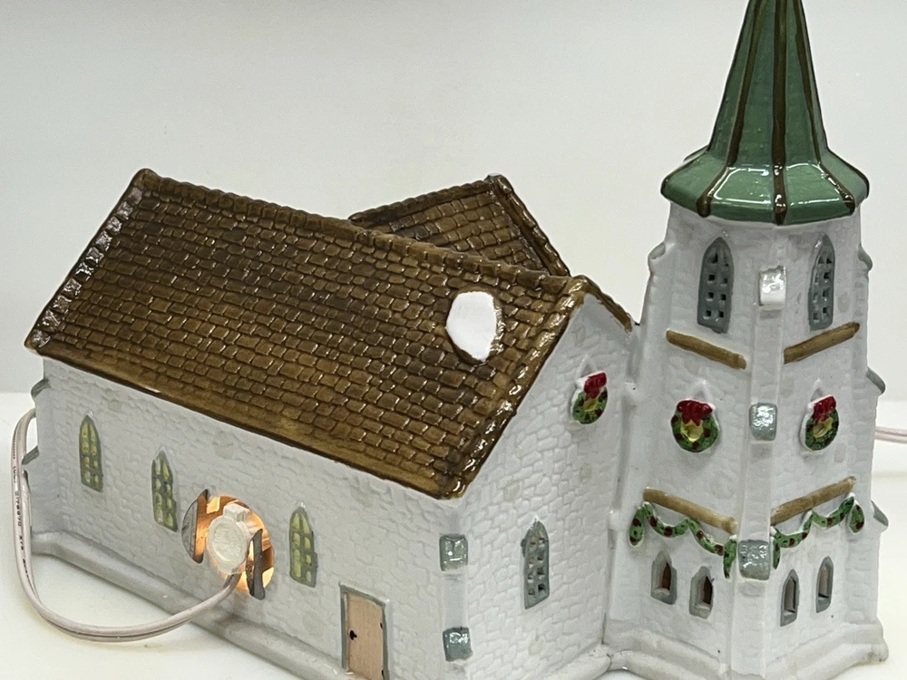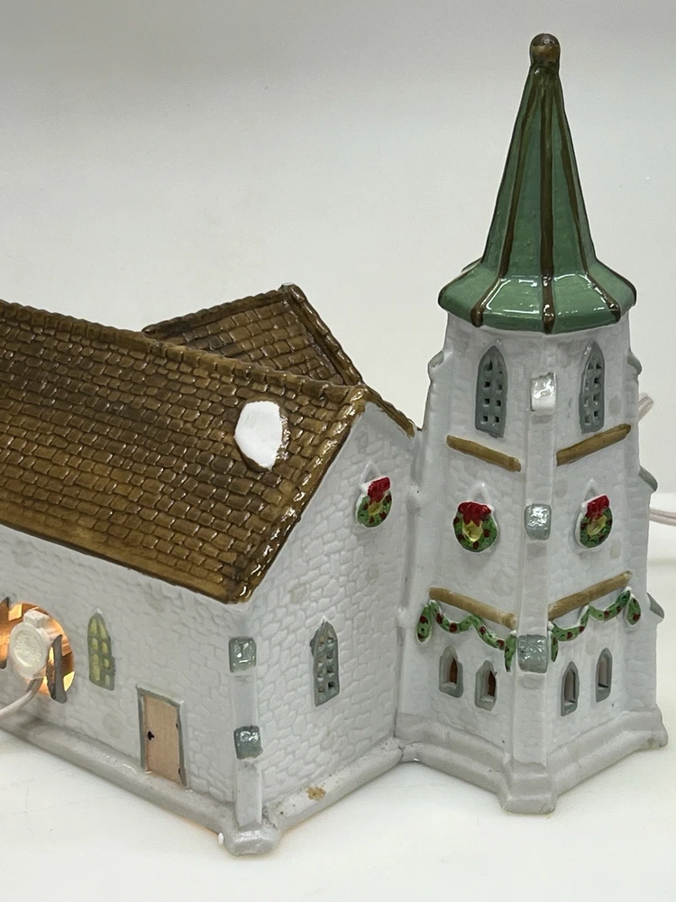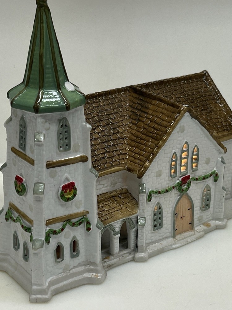 The Lemax Hearthside Village Porcelain CHURCH Christmas Village House Vintage 1992 is a beautifully crafted collectible piece perfect for any Christmas village display. This medium-sized, hand-painted cathedral features illuminated windows and is part of the retired Hearthside Village collection. Made of porcelain and showcasing a traditional style with a multicolor finish, this vintage building from 1992 is a charming addition to any seasonal decor. Perfect for adults and suitable for indoor use, this vintage piece from China is a must-have for collectors of Christmas villages. 1992 !! Excellent condition . Comes with all original packaging including the cord and light SouthCt