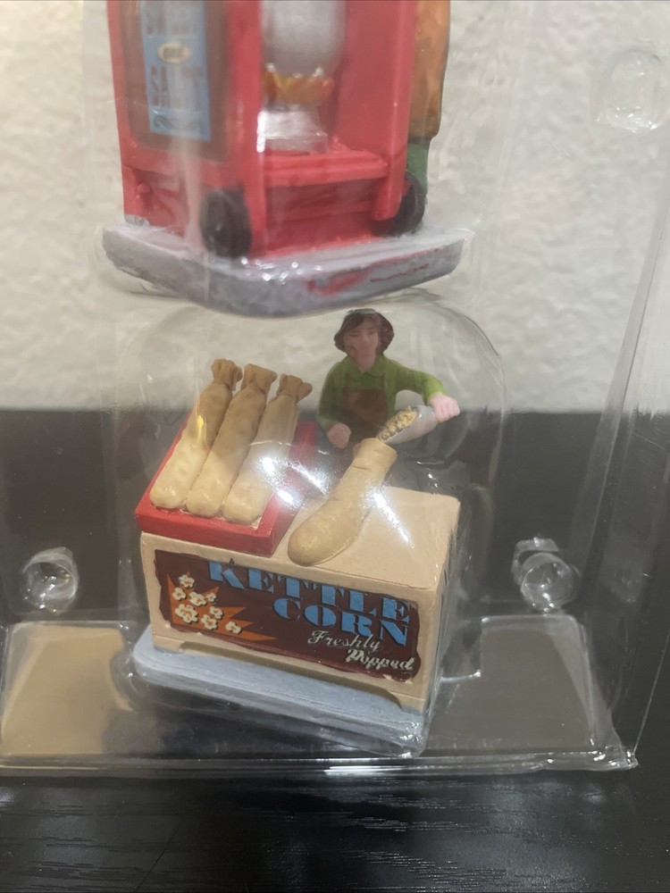The Lemax KETTLE CORN STAND is a 2-piece Holiday Village Carnival Train Accent Set perfect for adding a festive touch to your holiday décor. Made of resin and featuring a colorful multicolor design, this set includes a train subject with a unique carnival theme. The item is part of the Lemax brand's Carnival Figurines series and is a part of the Snow Village collection, making it a charming addition to any room in your home. With excellent packaging and never removed from its original package, this set is a collectible item that captures the spirit of a carnival, fair, or amusement park atmosphere.