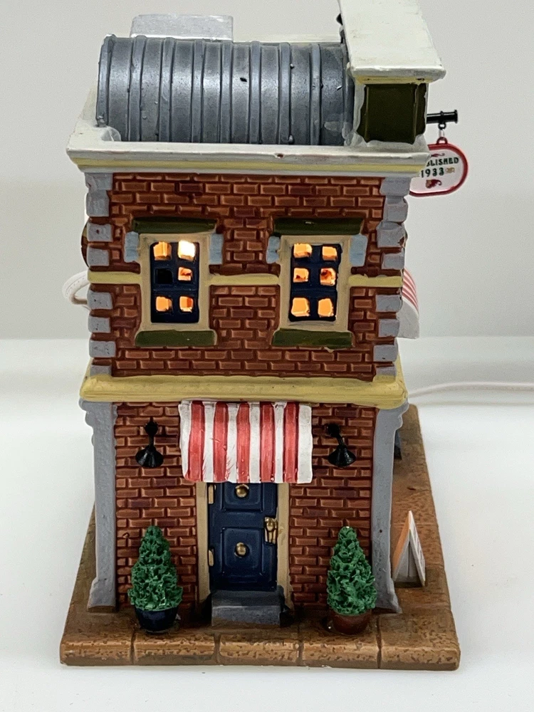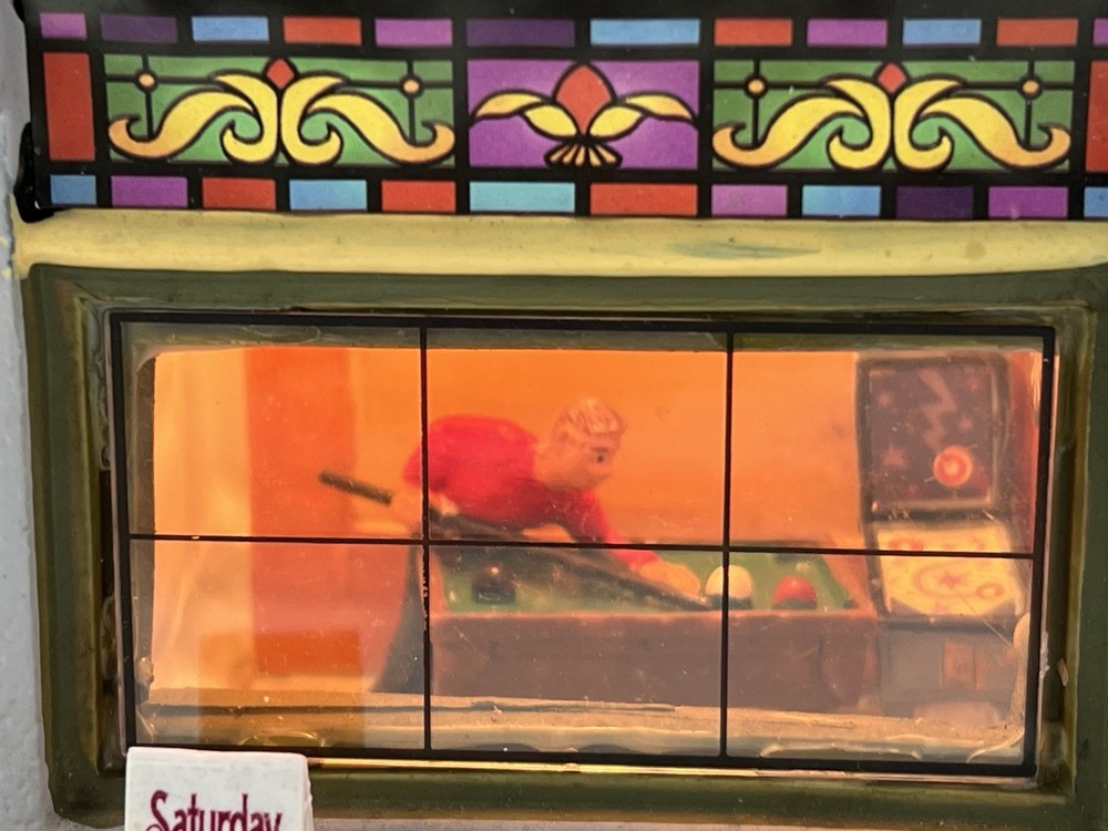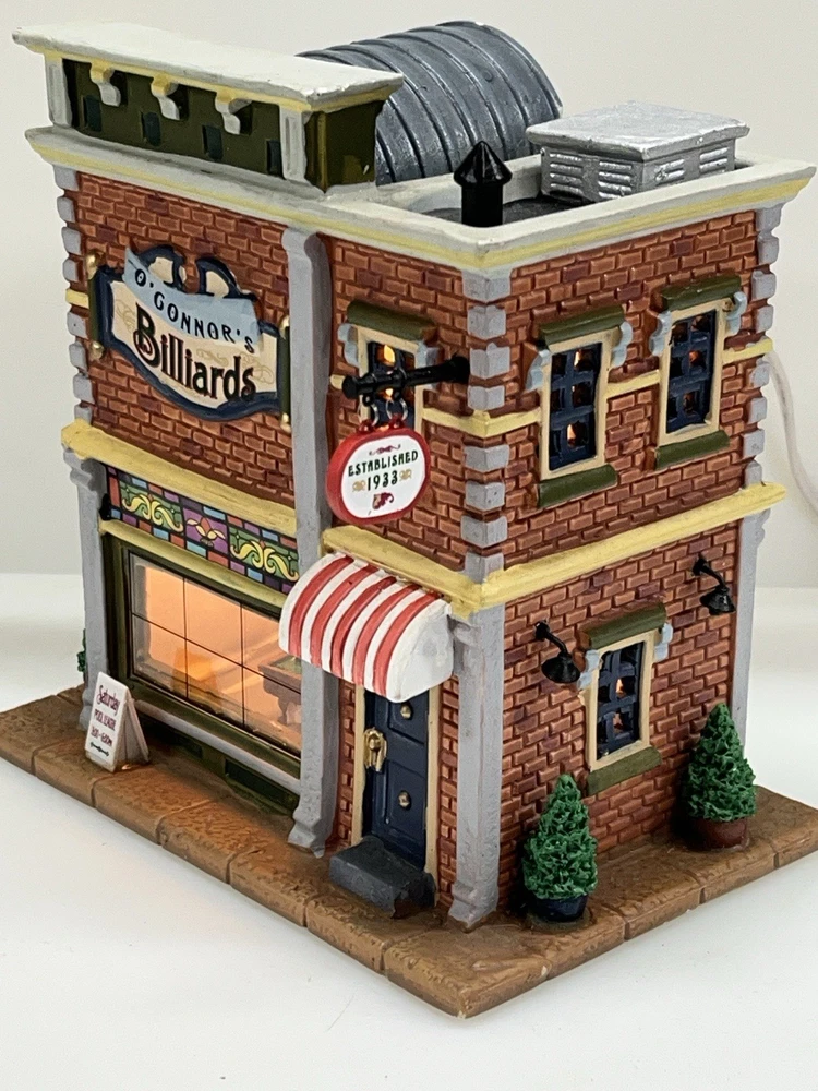 Add a touch of whimsy to your holiday display with this charming Lemax O’Connors Billiards piece from the 2012 collection. This asymmetrical, medium-sized porcelain house is beautifully painted with a delightful Billiards Hall pattern, complete with colorful characters and a festive atmosphere. The house measures 7 inches in length, 6-3/4 inches in height, and 5 inches in width, making it perfect for any room or village display. This original, retired piece is part of the Lemax O’Connor's Billiards collection and features a light and sign that add to the overall charm of the house. The house is suitable for all occasions and is perfect for adults who love American-style decorations. Don't miss out on the chance to add this unique and rare piece to your collection. Absolutely incredible condition. Includes all original packaging including light & cord . Just a beautiful piece .
