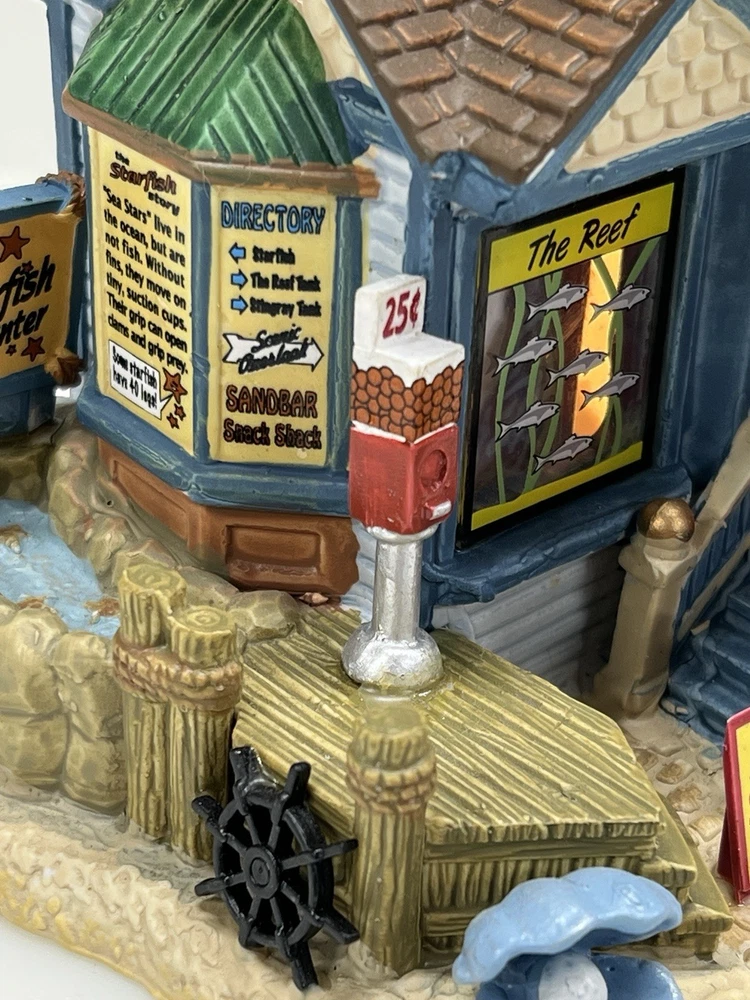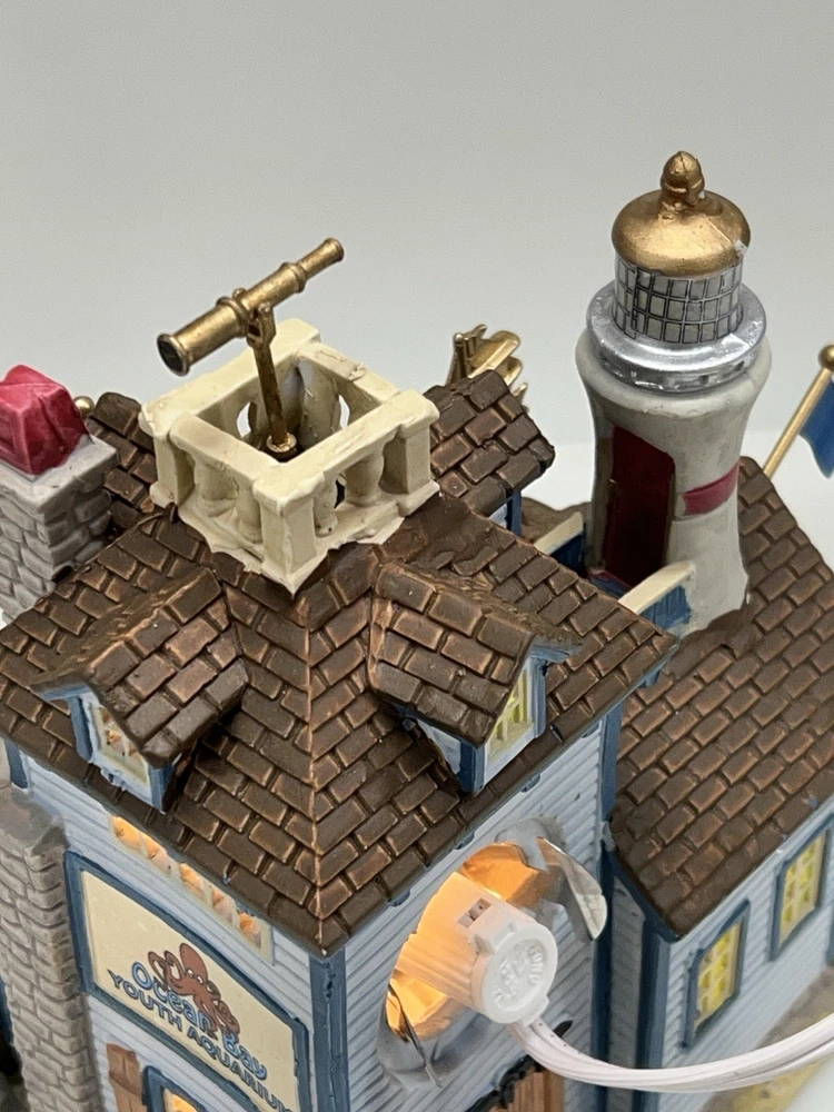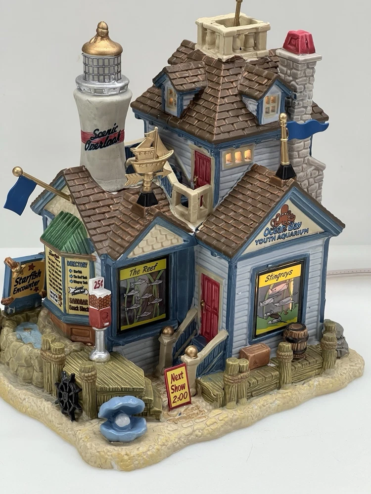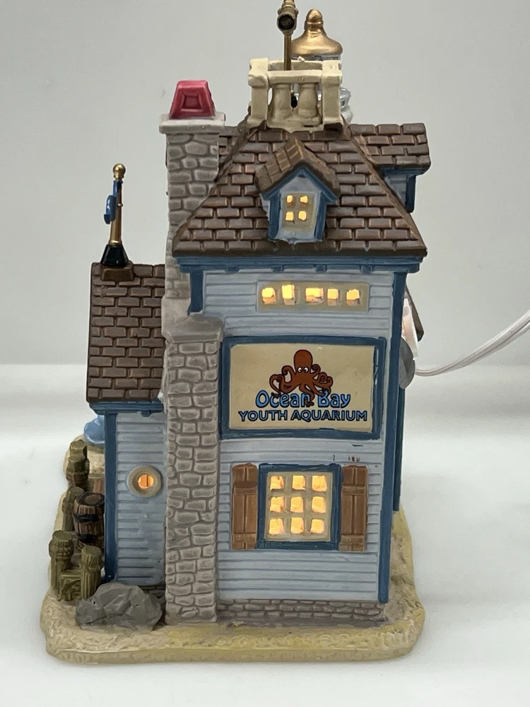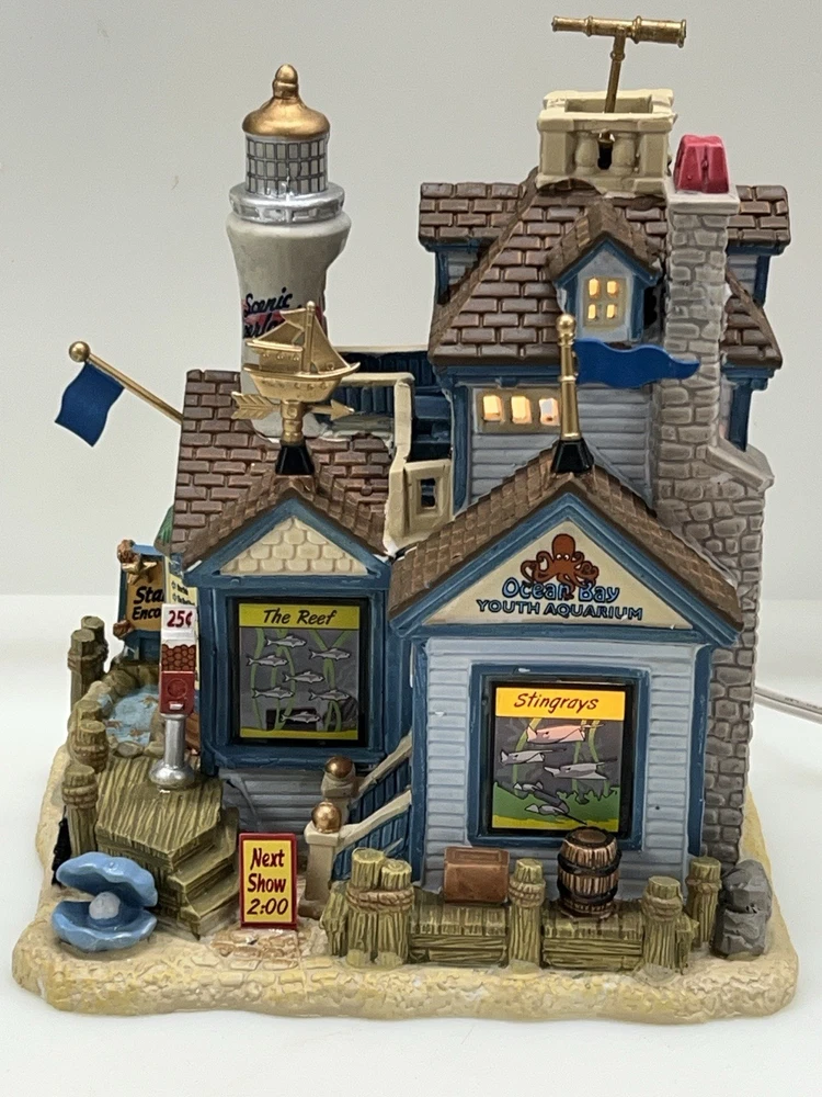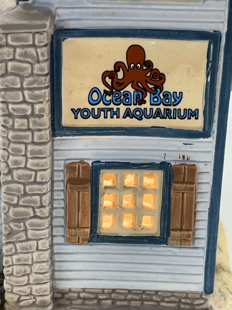 The Lemax "Ocean Bay Youth Aquarium" 2017 is a rare piece with a cord and light, perfect for adding a whimsical touch to your holiday decor. This asymmetrical ceramic and porcelain village display features an illuminated and retired American-style Christmas house in a nautical theme. The medium-sized aquarium piece, measuring 7" in length, 8" in height, and 5" in width, is part of the Ocean Bay Youth Aquarium collection and is sure to delight collectors of holiday villages and houses. Made in China during the 21st century, this original piece is a unique addition to any room during the Christmas season. Excellent condition with original box , cord & light ! Extremely rare item seldom seen!