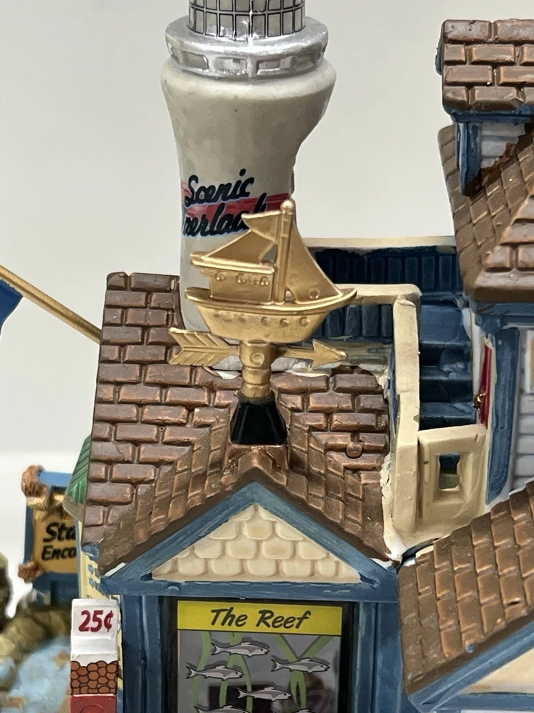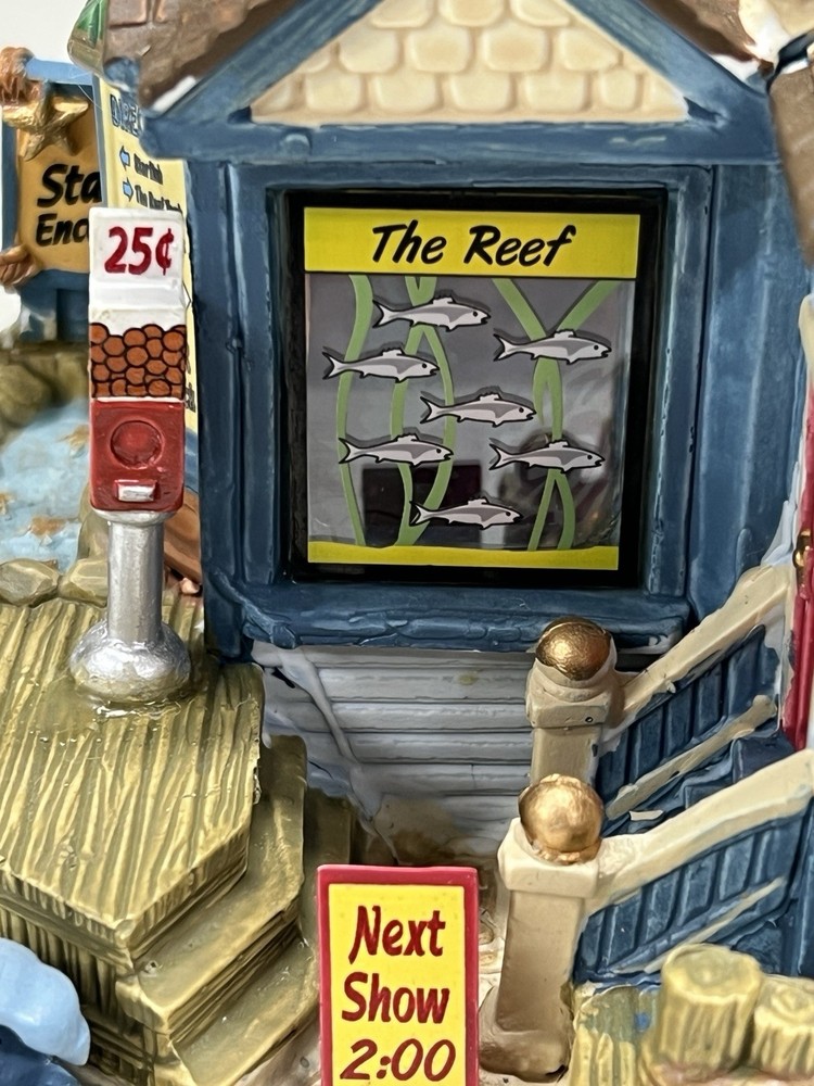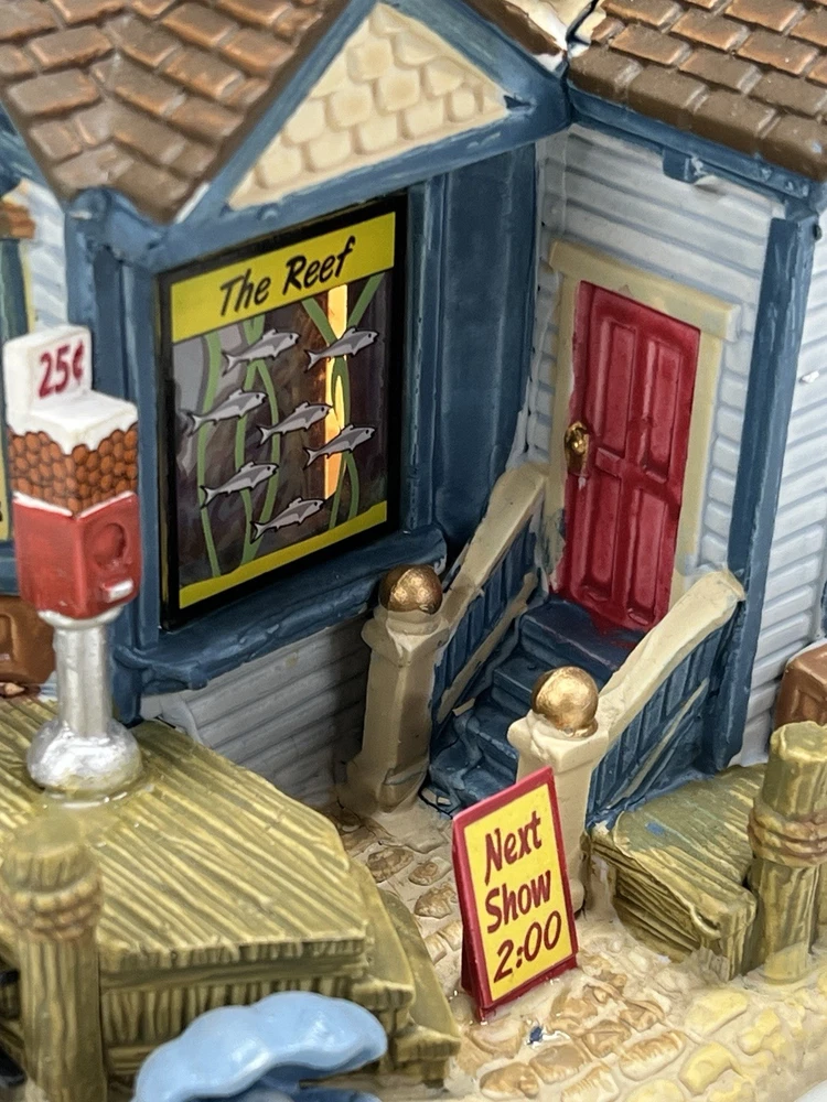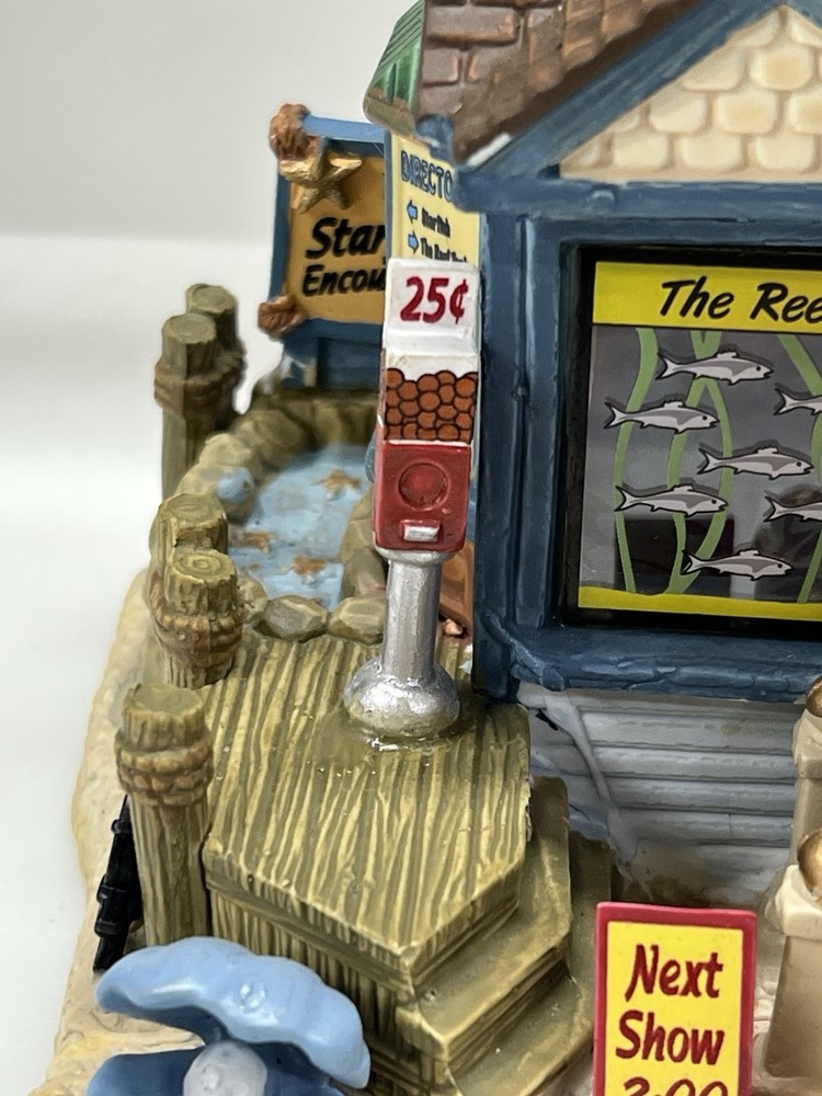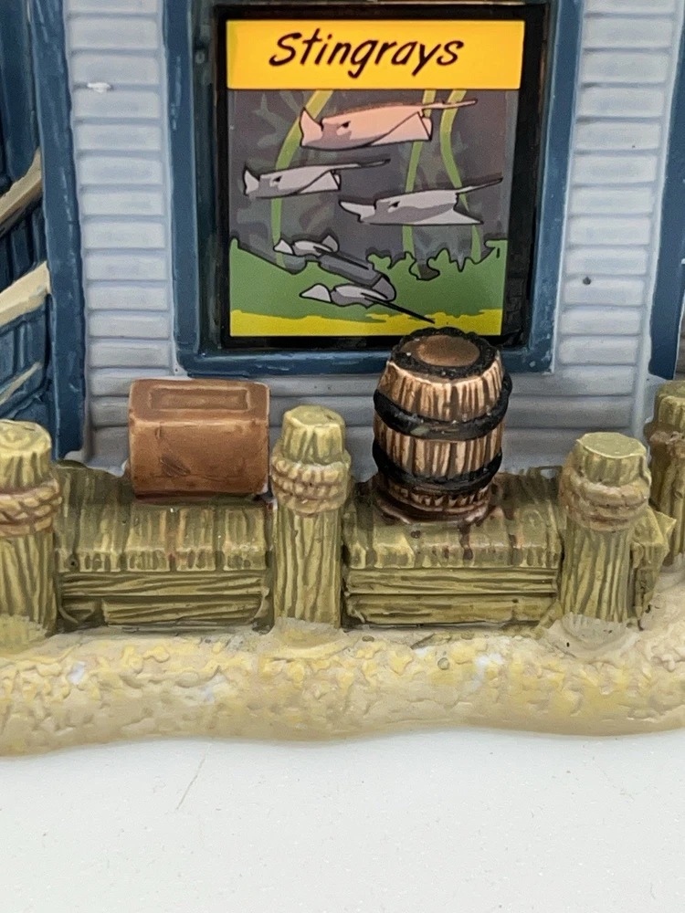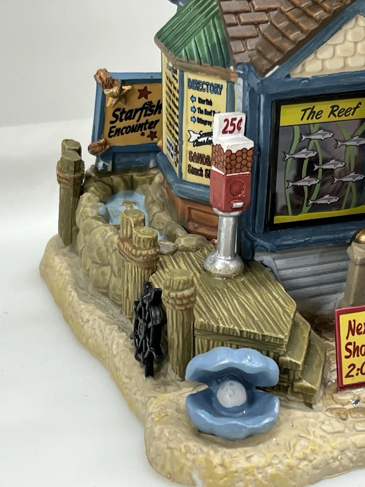 The Lemax "Ocean Bay Youth Aquarium" 2017 is a rare piece with a cord and light, perfect for adding a whimsical touch to your holiday decor. This asymmetrical ceramic and porcelain village display features an illuminated and retired American-style Christmas house in a nautical theme. The medium-sized aquarium piece, measuring 7" in length, 8" in height, and 5" in width, is part of the Ocean Bay Youth Aquarium collection and is sure to delight collectors of holiday villages and houses. Made in China during the 21st century, this original piece is a unique addition to any room during the Christmas season. Excellent condition with original box , cord & light ! Extremely rare item seldom seen!