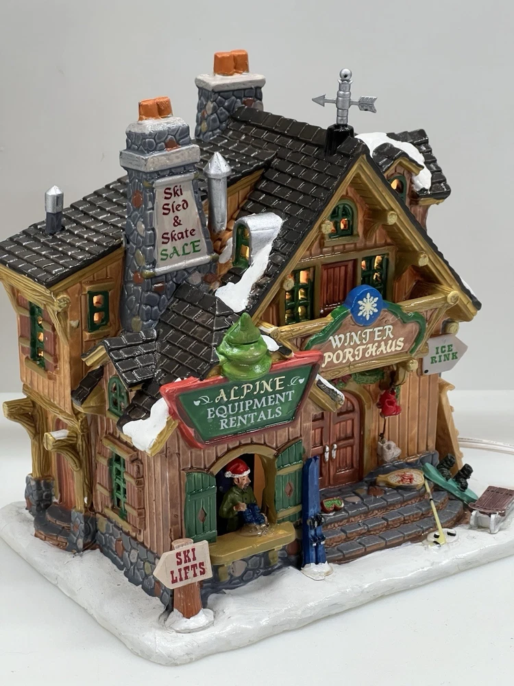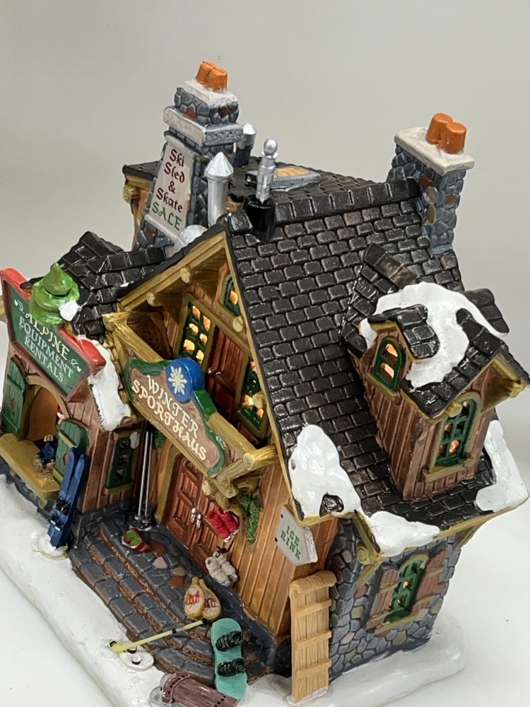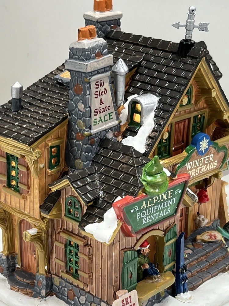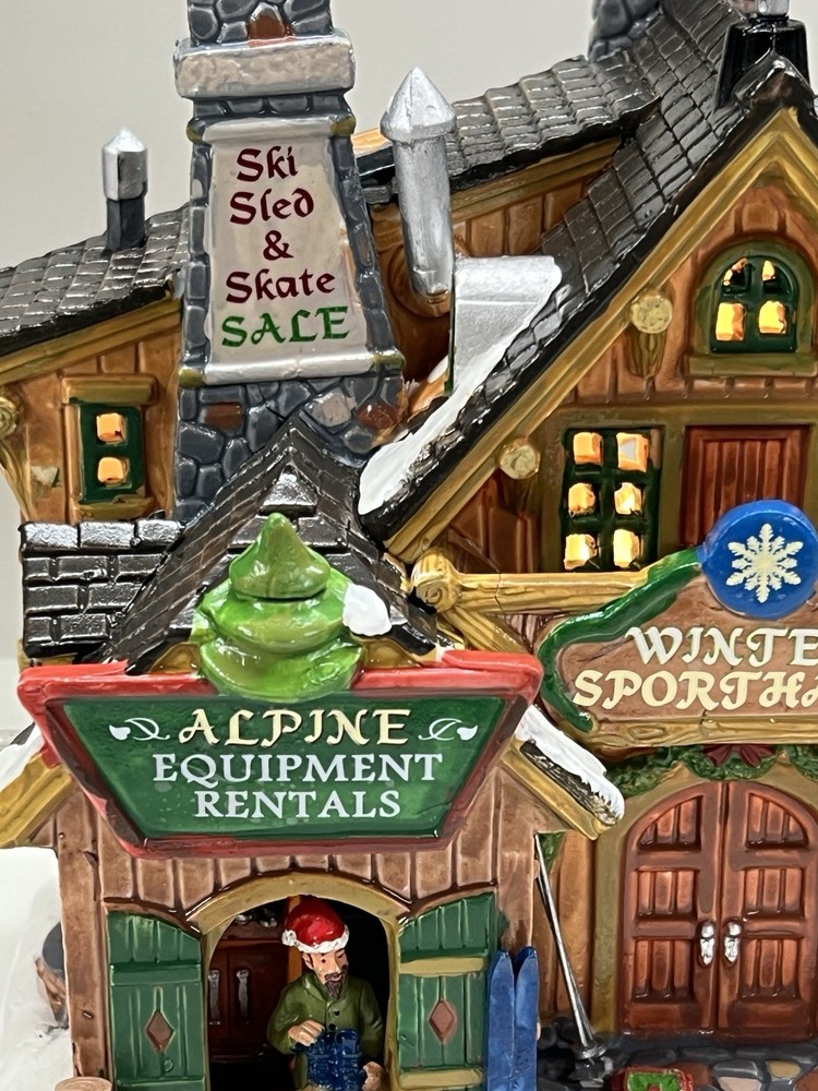 The Lemax Winter Sporthaus Alpine Equipment Rental 25369 is a medium-sized, asymmetrical lodge-style building designed for village display. Hand-painted with a whimsical ski lodge pattern, this illuminated Christmas village house features a 3D effect and comes boxed as a rare find from 2012. Perfect for adults, this multicolored porcelain building is part of the Lemax collection and is suitable for any room in the house, adding a touch of seasonal, advertising, novelty, and sports-themed charm. Absolutely perfect pristine condition. Rare item seldom seen for sale . Includes all original packaging including weather vane, cord & light with clean packaging. Beautiful piece !