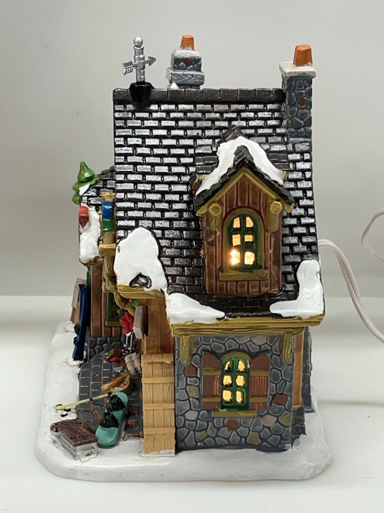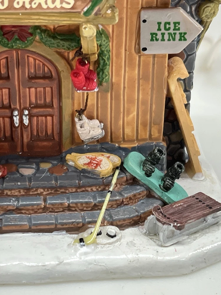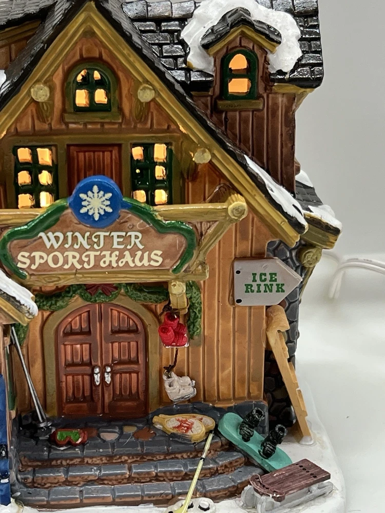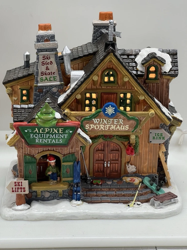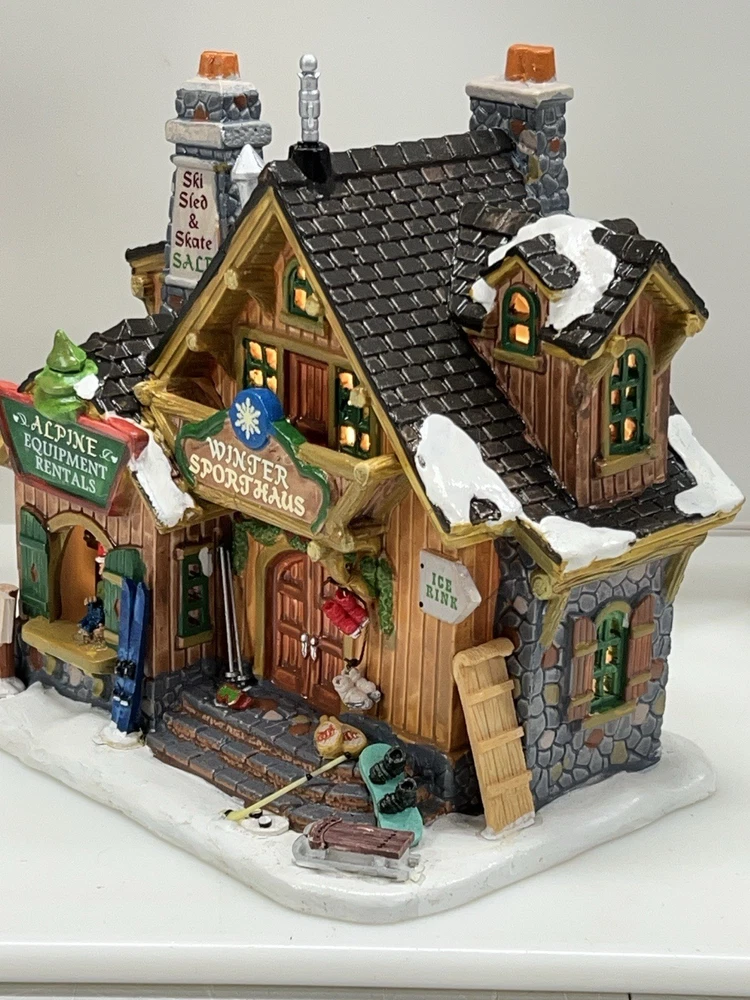 The Lemax Winter Sporthaus Alpine Equipment Rental 25369 is a medium-sized, asymmetrical lodge-style building designed for village display. Hand-painted with a whimsical ski lodge pattern, this illuminated Christmas village house features a 3D effect and comes boxed as a rare find from 2012. Perfect for adults, this multicolored porcelain building is part of the Lemax collection and is suitable for any room in the house, adding a touch of seasonal, advertising, novelty, and sports-themed charm. Absolutely perfect pristine condition. Rare item seldom seen for sale . Includes all original packaging including weather vane, cord & light with clean packaging. Beautiful piece !