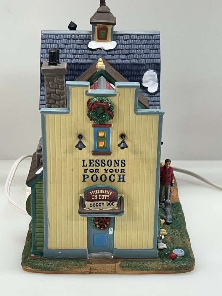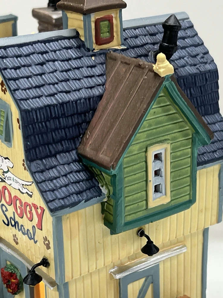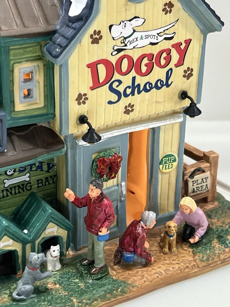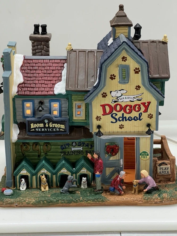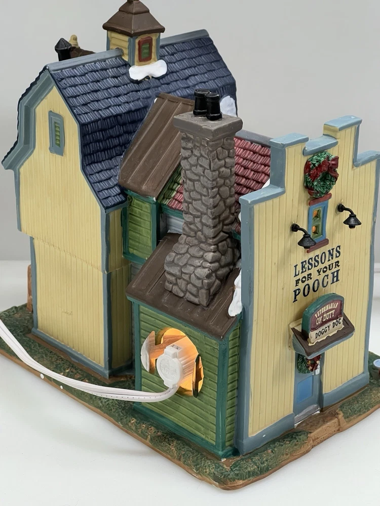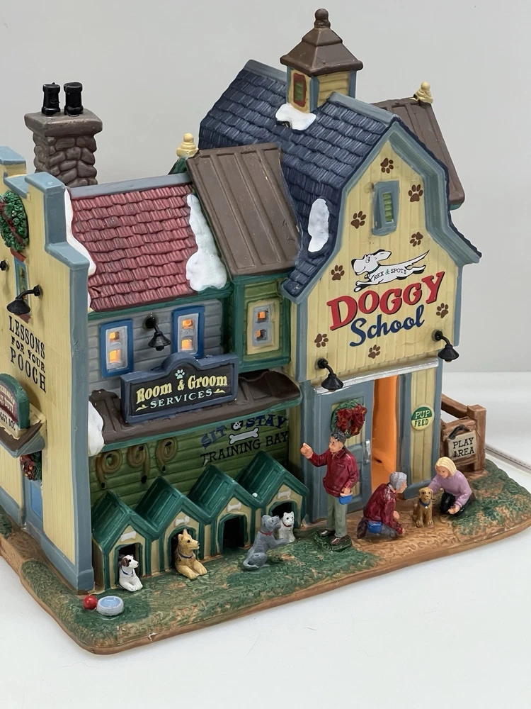 This rare and retired Lemax Christmas Village piece from 2016 features the whimsical "Rex and Spot Doggy School" pattern, perfect for any room and suitable for a village display. The medium-sized porcelain building measures 8 inches in length and height, and 6 inches in width, with intricate details and multicolor design. The item is an original and authentic Lemax product, part of the Carillon Decorative Products collection, and manufactured in China. It would make a great addition to any collection or a thoughtful gift for dog lovers. Absolutely incredible detail ! Pristine condition! RARE! Comes with all original packaging including cord & light .
