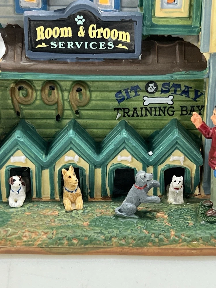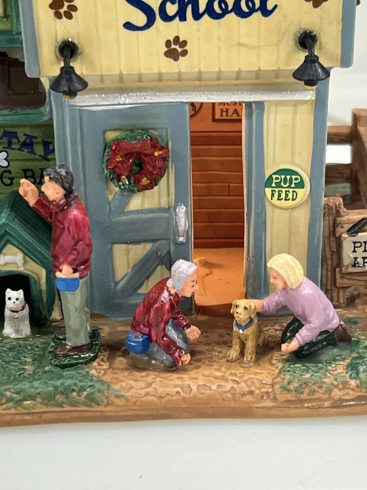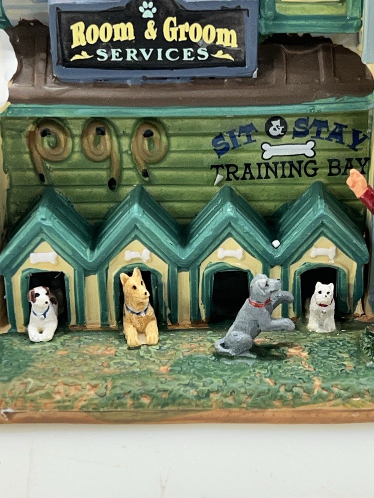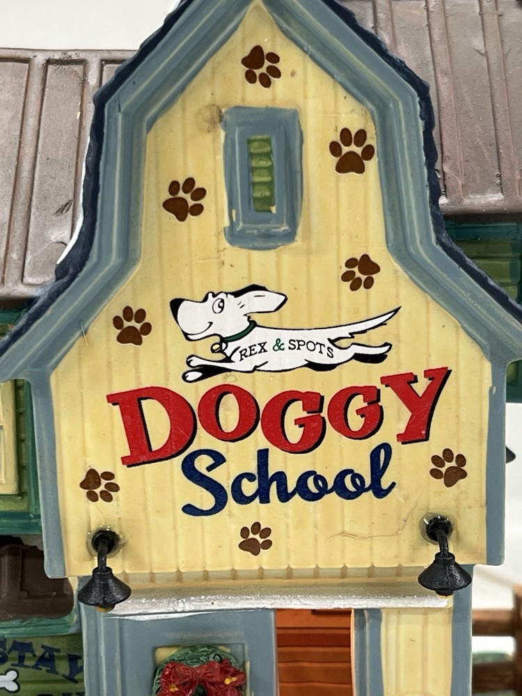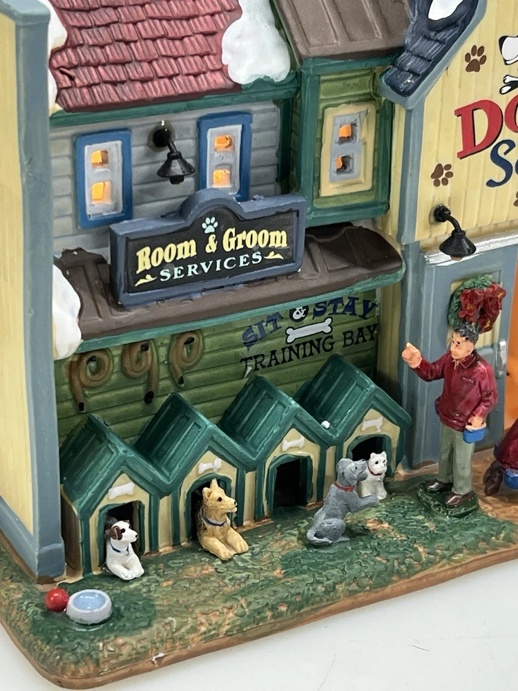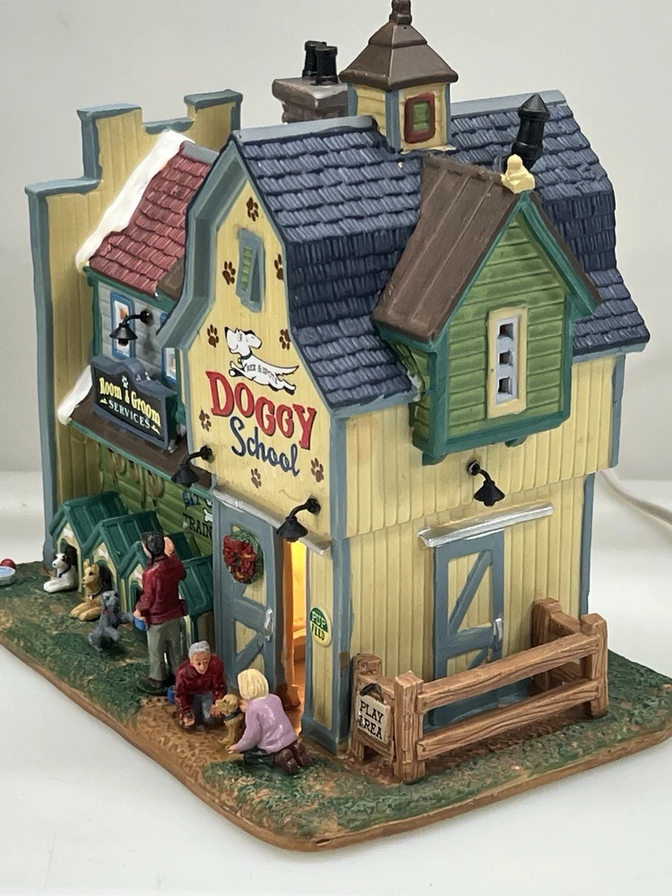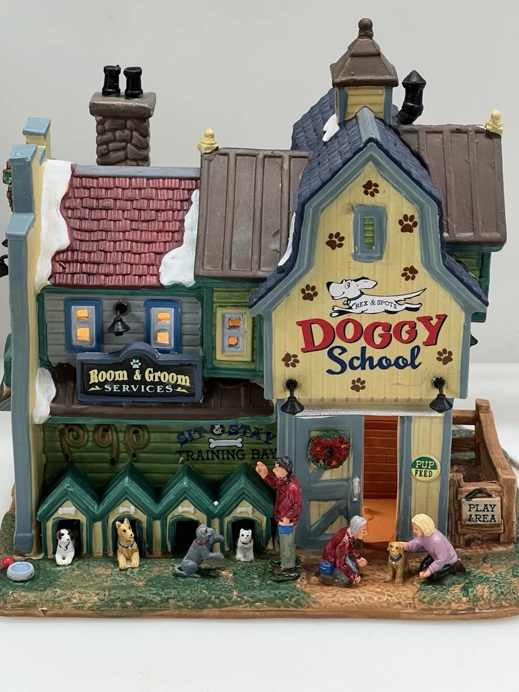 This rare and retired Lemax Christmas Village piece from 2016 features the whimsical "Rex and Spot Doggy School" pattern, perfect for any room and suitable for a village display. The medium-sized porcelain building measures 8 inches in length and height, and 6 inches in width, with intricate details and multicolor design. The item is an original and authentic Lemax product, part of the Carillon Decorative Products collection, and manufactured in China. It would make a great addition to any collection or a thoughtful gift for dog lovers. Absolutely incredible detail ! Pristine condition! RARE! Comes with all original packaging including cord & light .