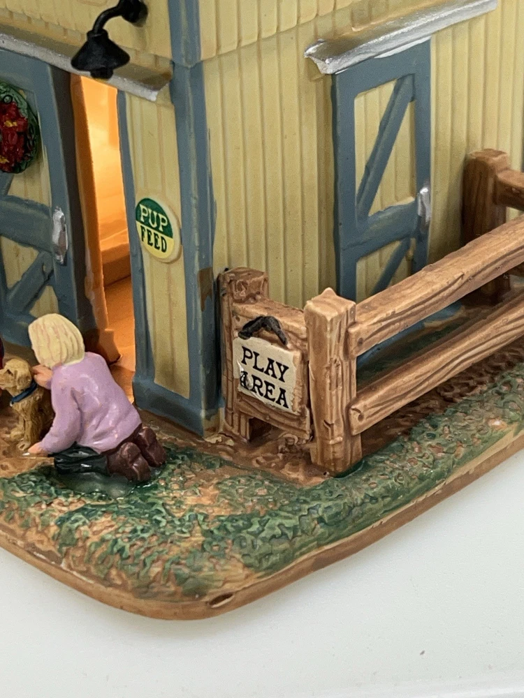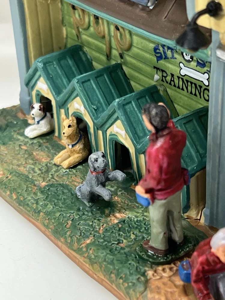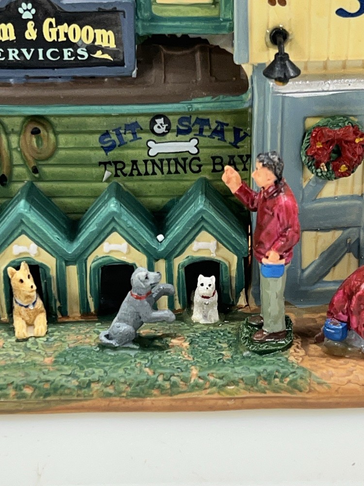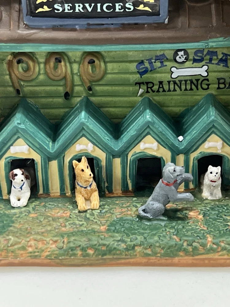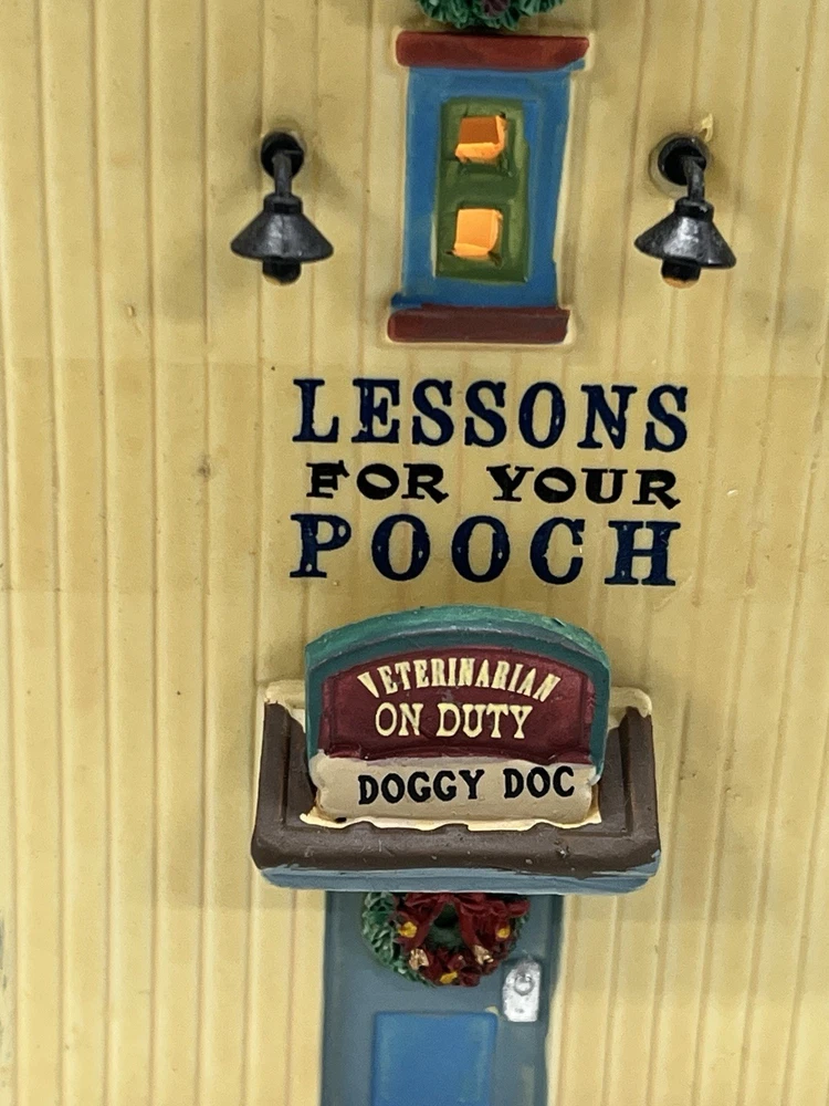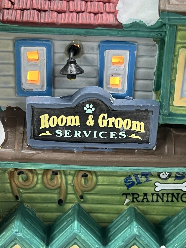 This rare and retired Lemax Christmas Village piece from 2016 features the whimsical "Rex and Spot Doggy School" pattern, perfect for any room and suitable for a village display. The medium-sized porcelain building measures 8 inches in length and height, and 6 inches in width, with intricate details and multicolor design. The item is an original and authentic Lemax product, part of the Carillon Decorative Products collection, and manufactured in China. It would make a great addition to any collection or a thoughtful gift for dog lovers. Absolutely incredible detail ! Pristine condition! RARE! Comes with all original packaging including cord & light .