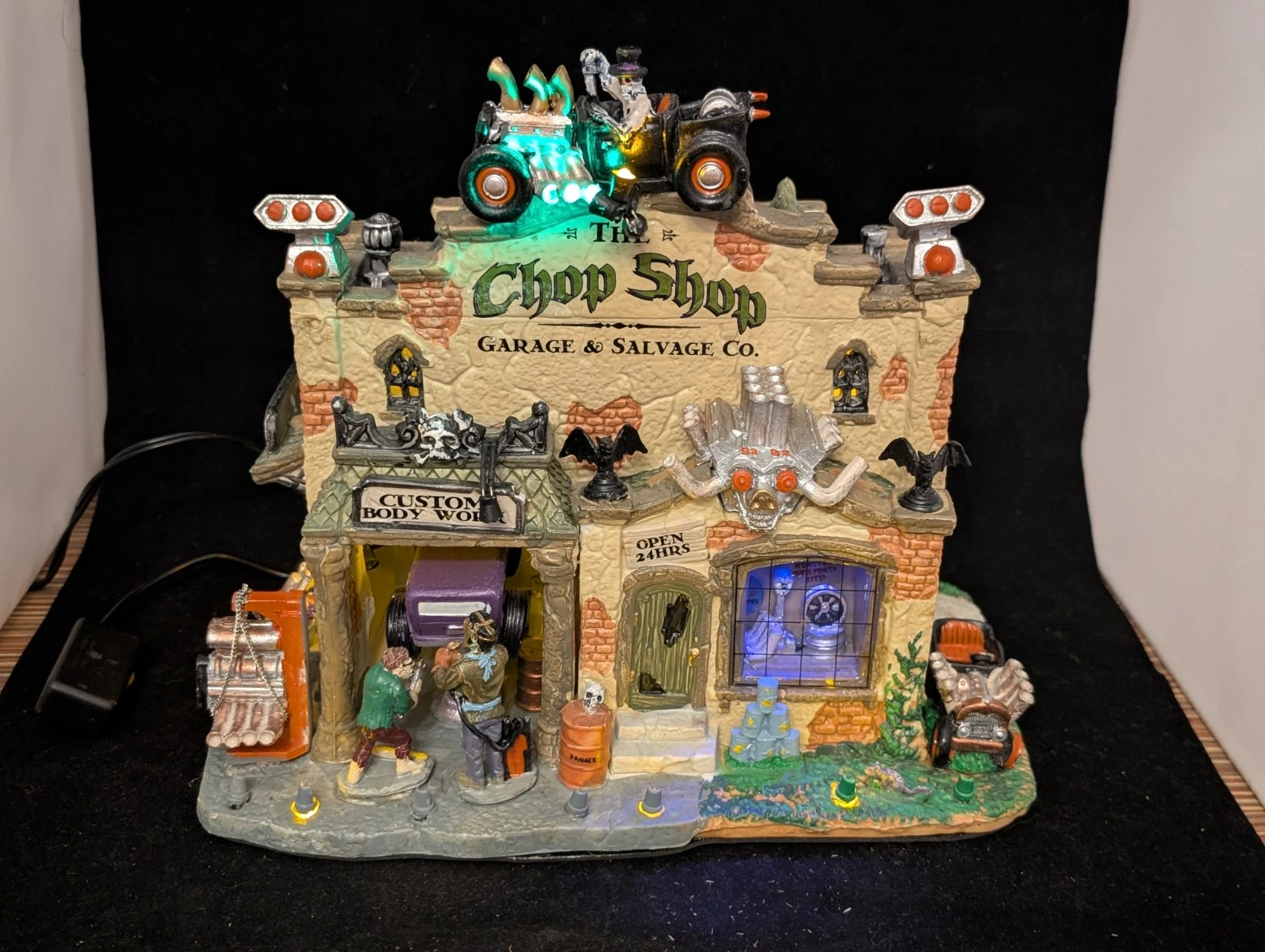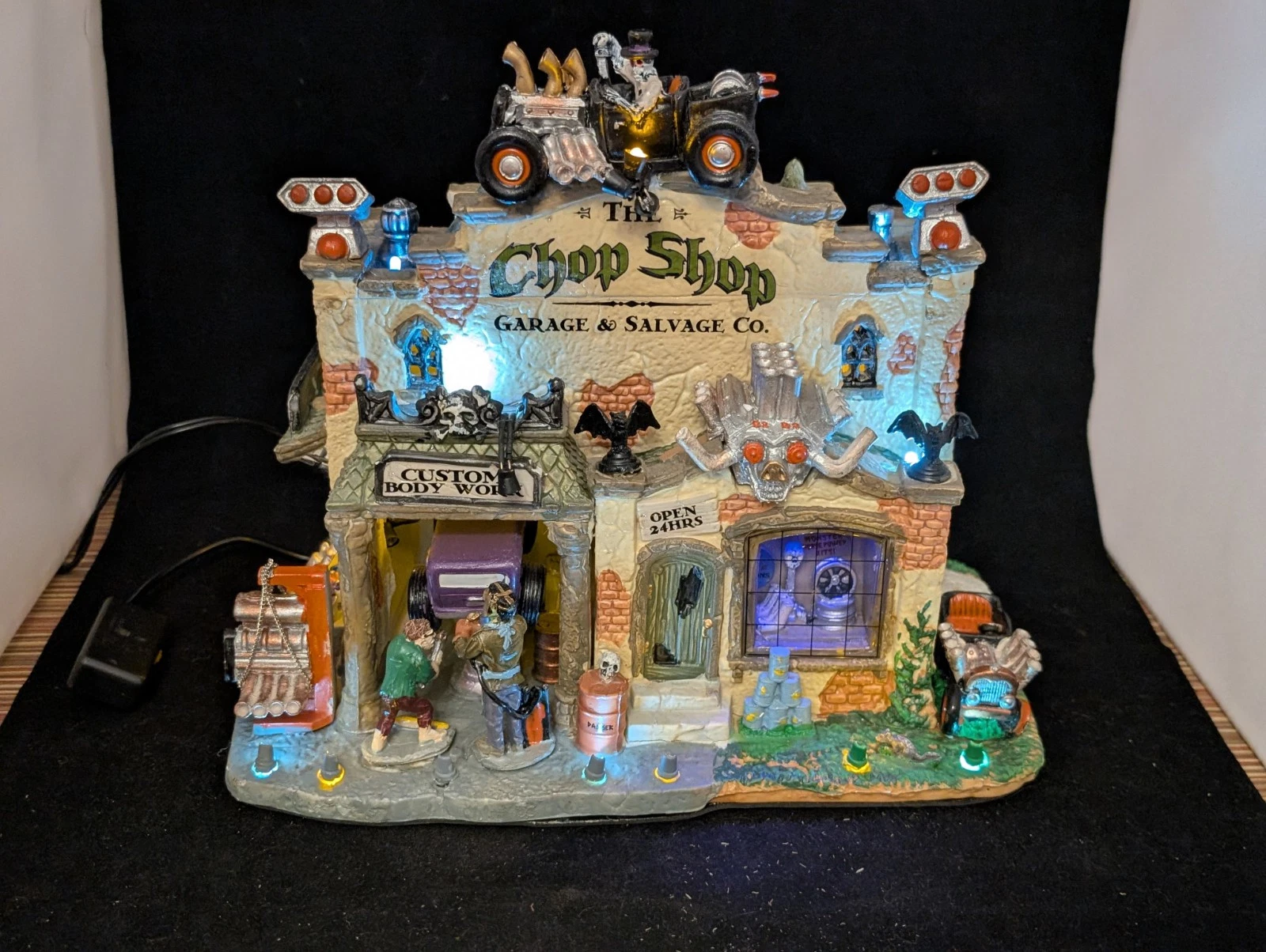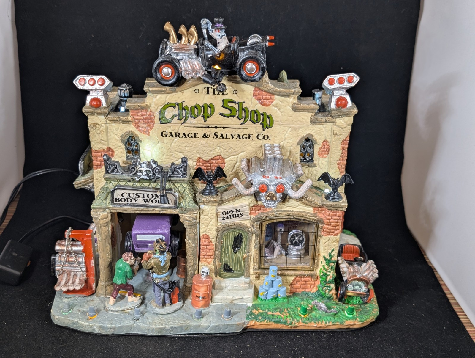 This is a Lemax figurine from the Spooky Village collection for Halloween. It features "The Chop Shop Garage & Salvage Co." with a spooky theme of monsters and skeletons. The figurine is made of porcelain and ceramics, and includes sounds and lights for added spookiness. It does not come in its original packaging. Perfect for decorating any room for Halloween.