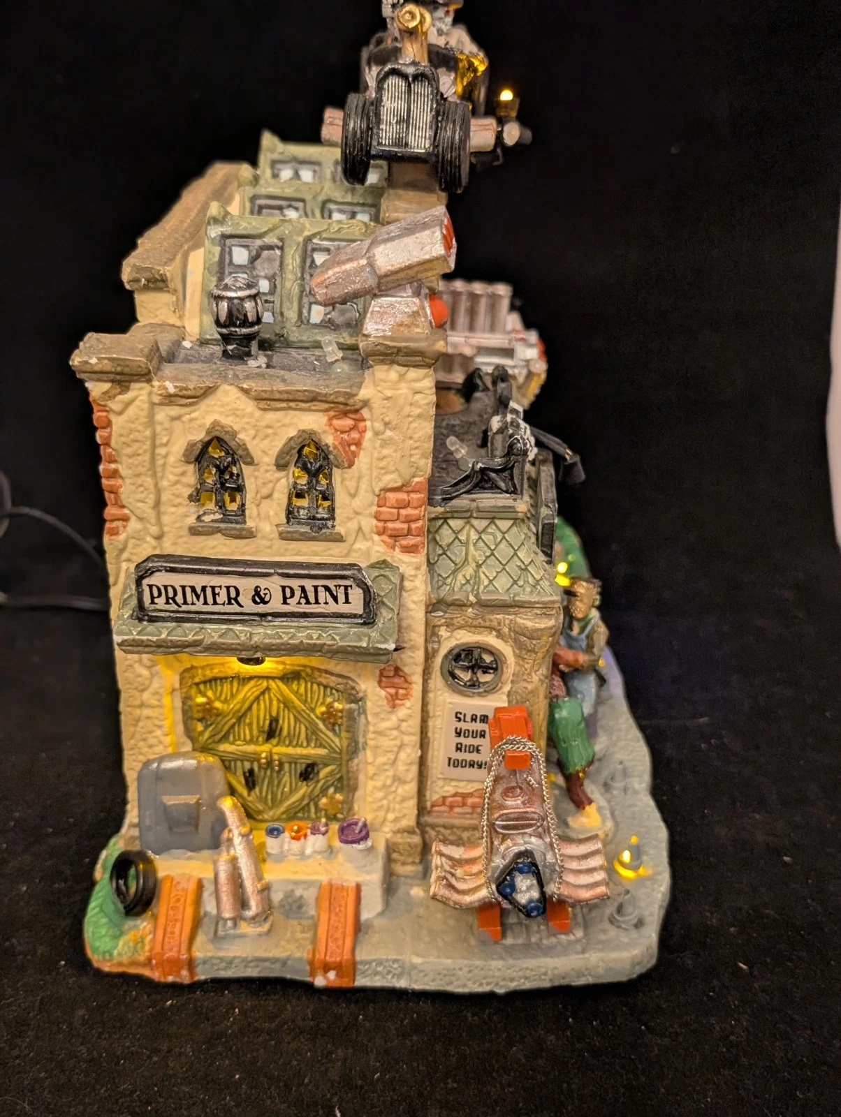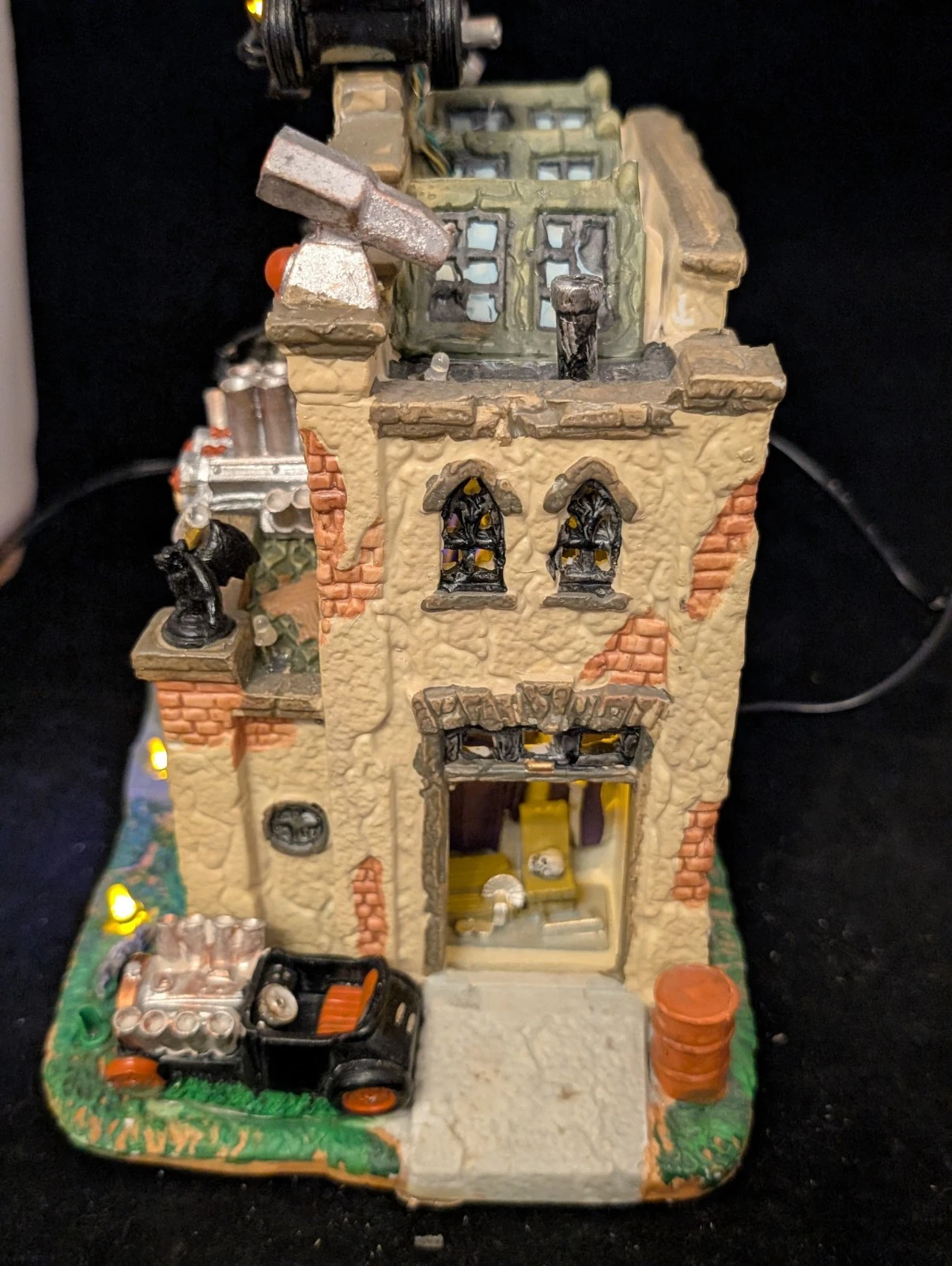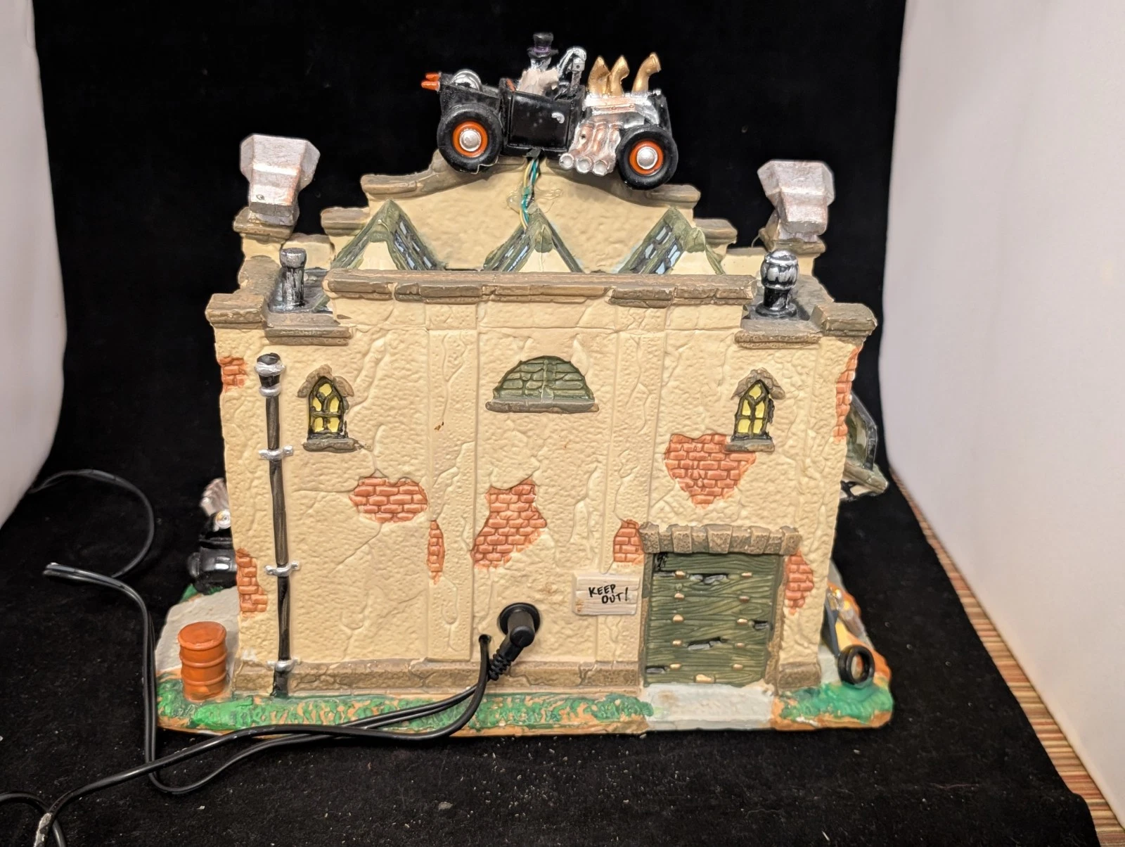 This is a Lemax figurine from the Spooky Village collection for Halloween. It features "The Chop Shop Garage & Salvage Co." with a spooky theme of monsters and skeletons. The figurine is made of porcelain and ceramics, and includes sounds and lights for added spookiness. It does not come in its original packaging. Perfect for decorating any room for Halloween.