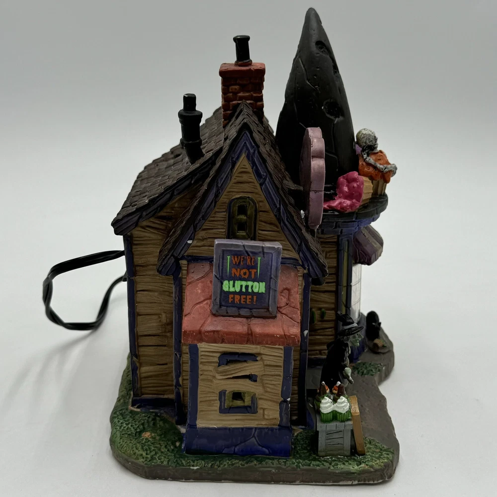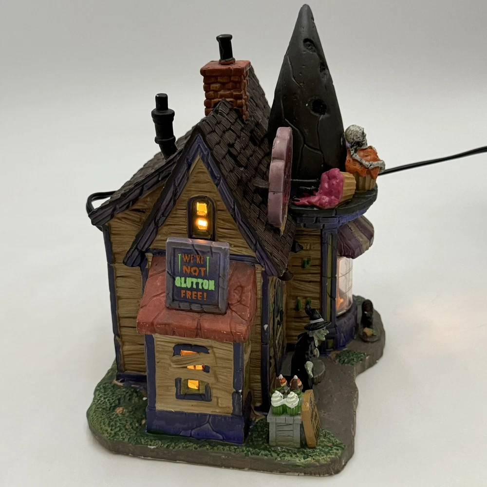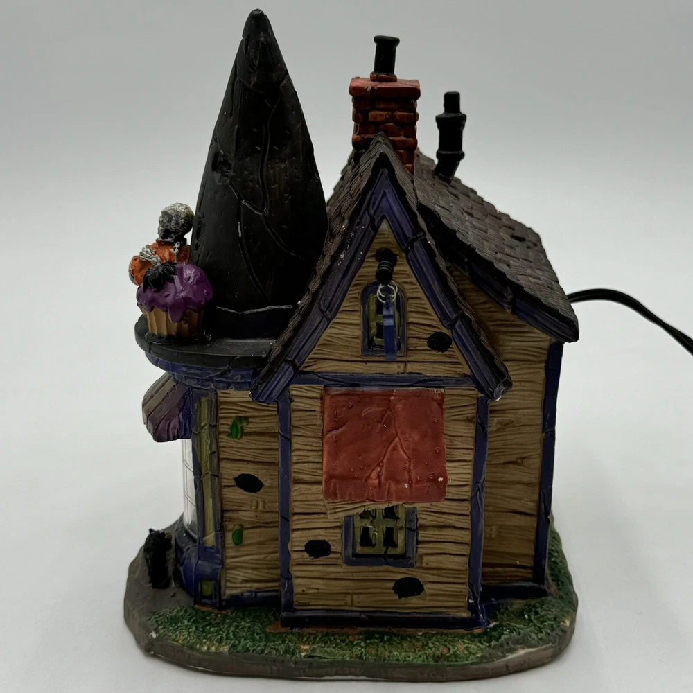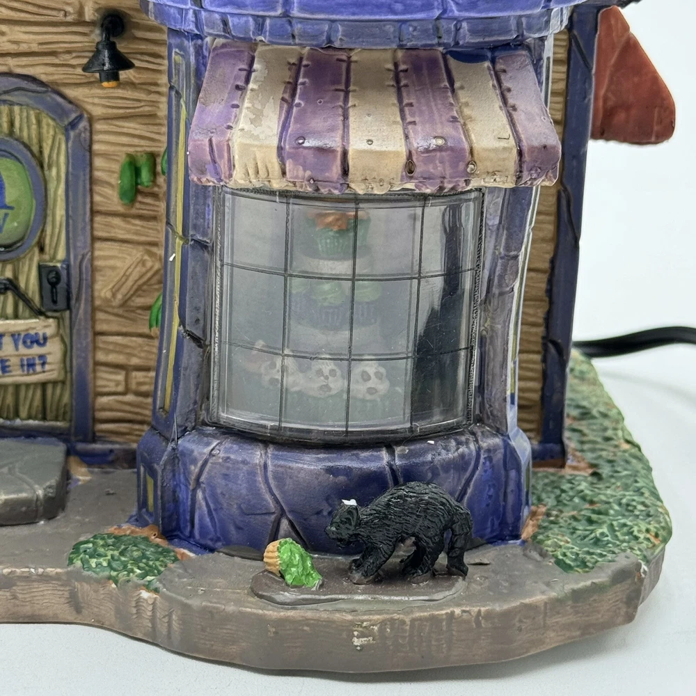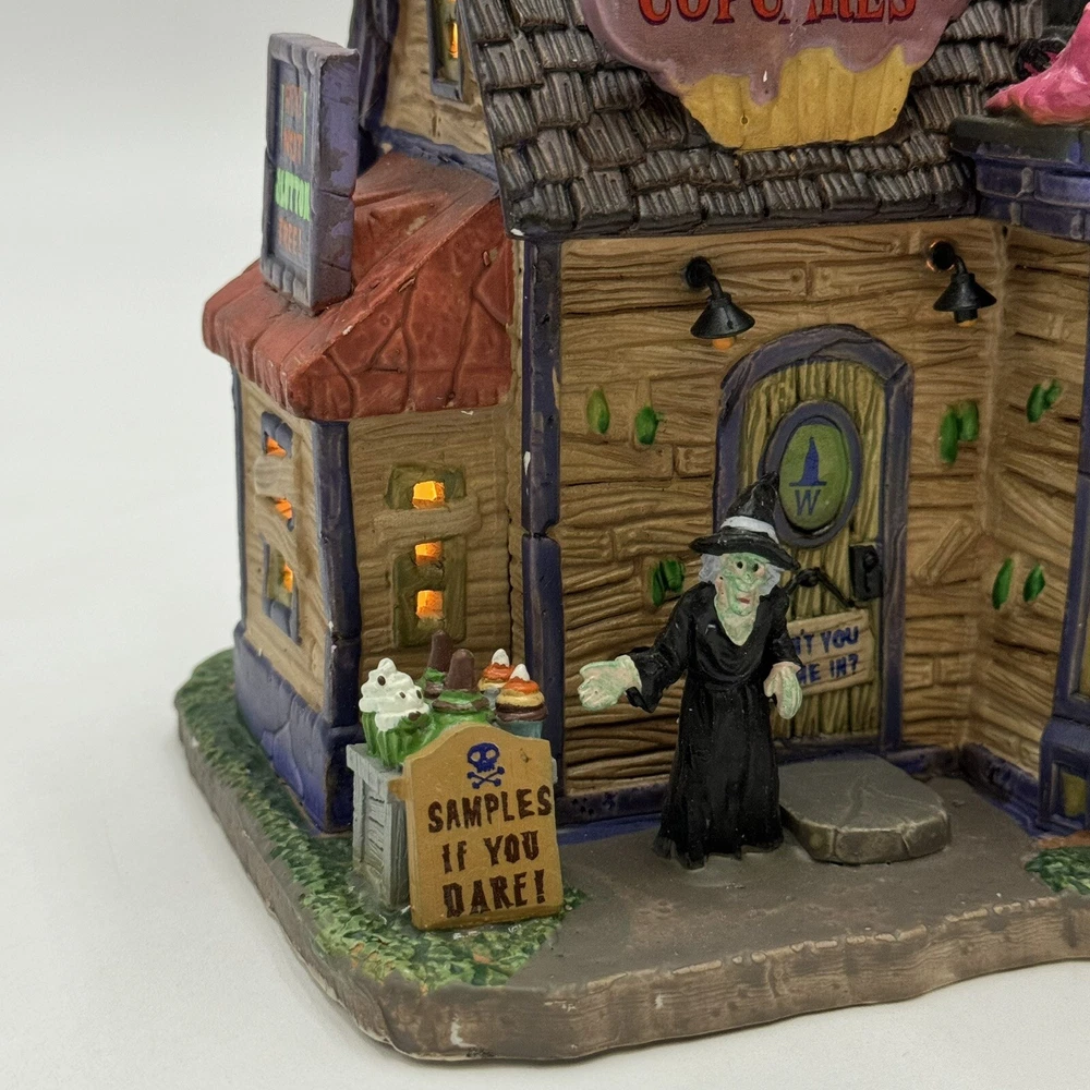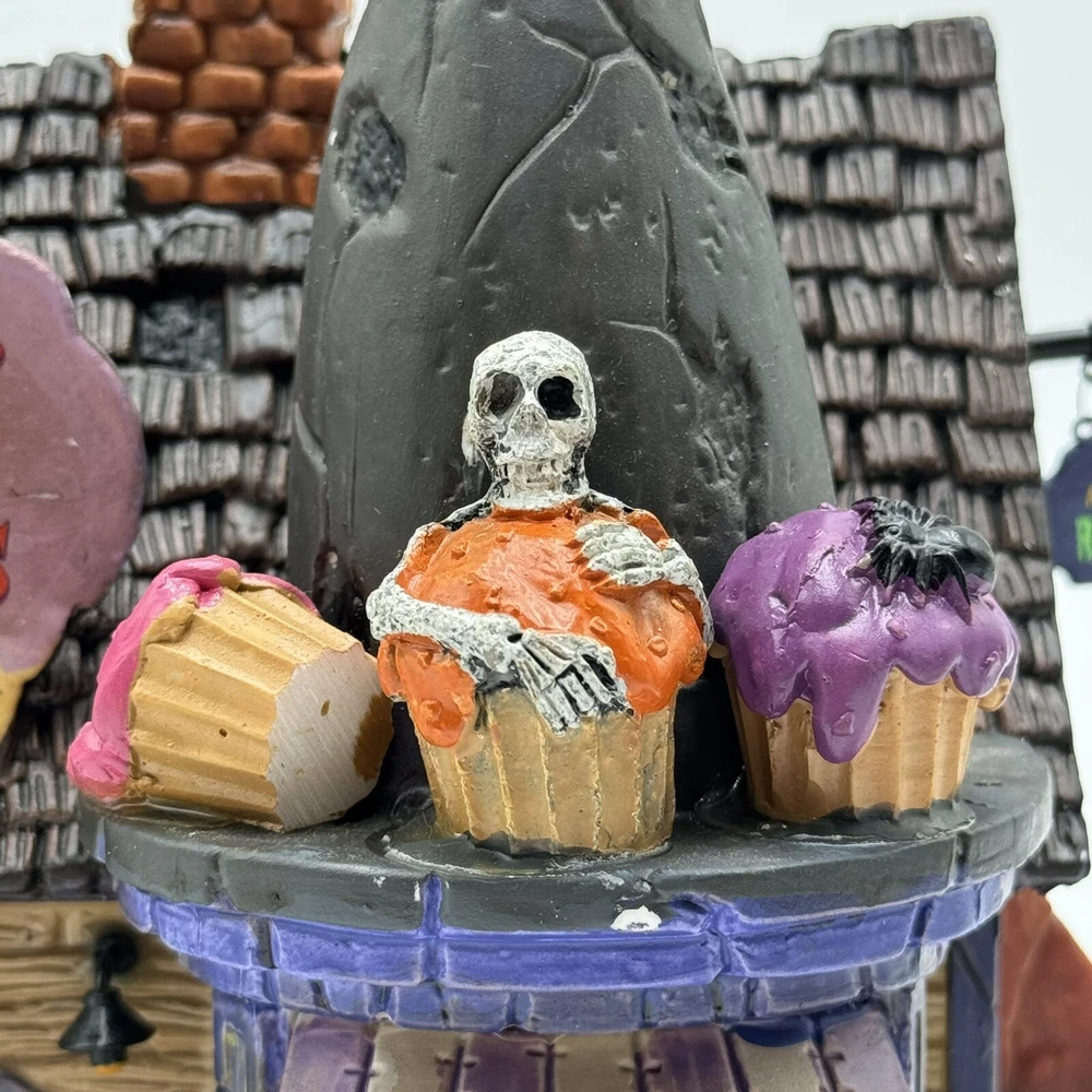 This Spooky Town cupcake set features Wanda's Wicked Cupcakes, perfect for Halloween celebrations. The set includes a box for easy gifting and storage. The multicolor designs and retired features make this a must-have for any Halloween collector. The Lemax brand is known for its quality and attention to detail, making this a great addition to any collection. The set is part of the Spooky Town collection and is perfect for seasonal and holiday decorations. This ceramic Halloween decoration has been glued back together multiple times. The item has also been chipped please look at all the pictures and video.