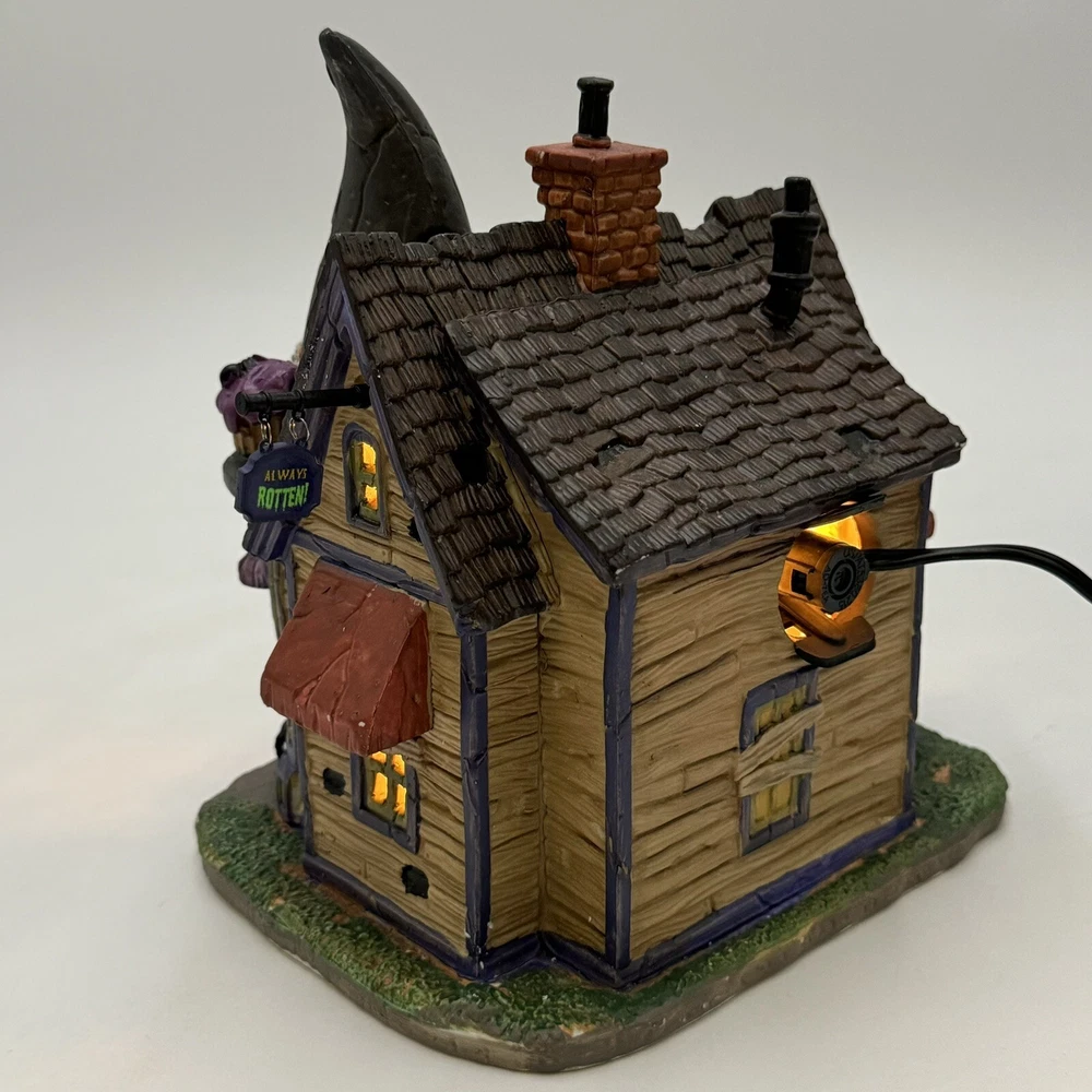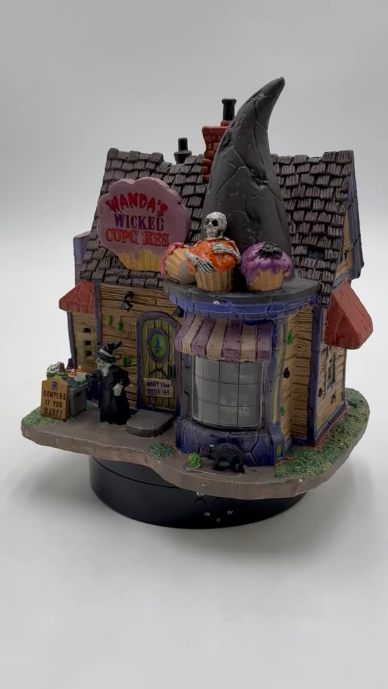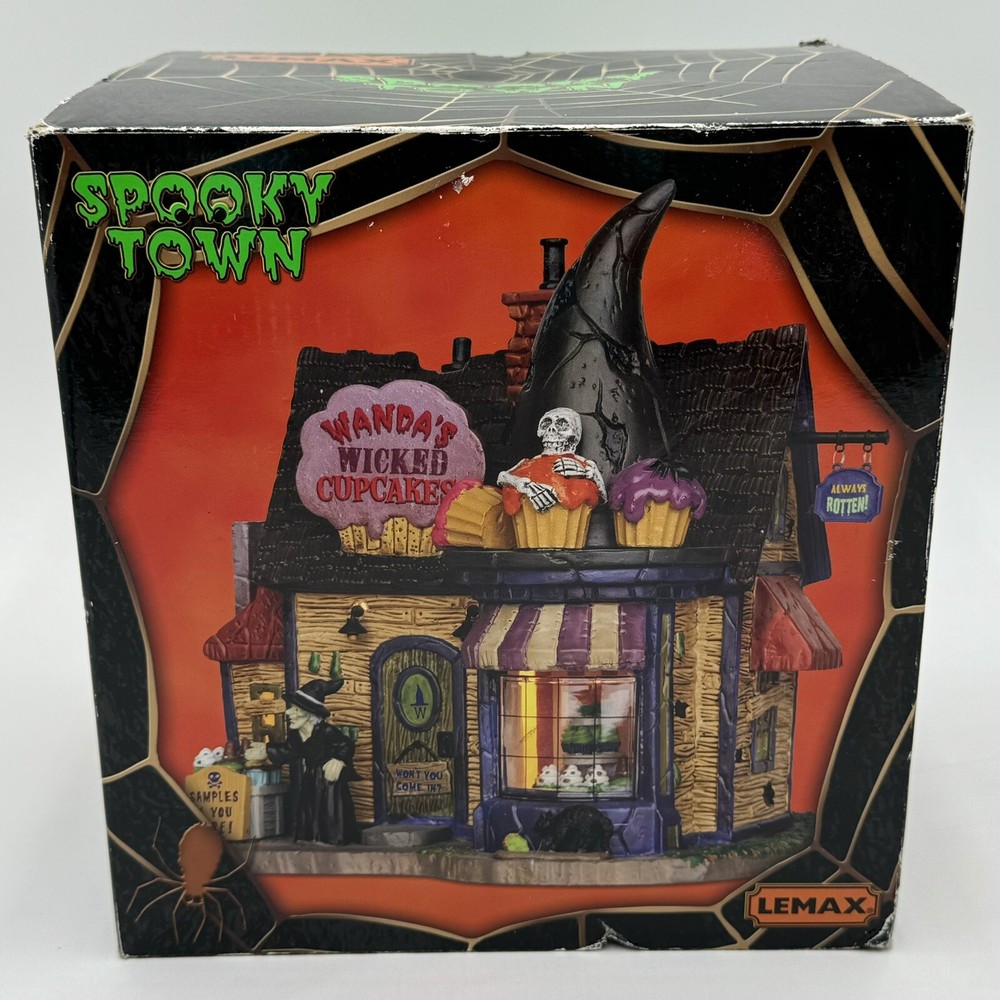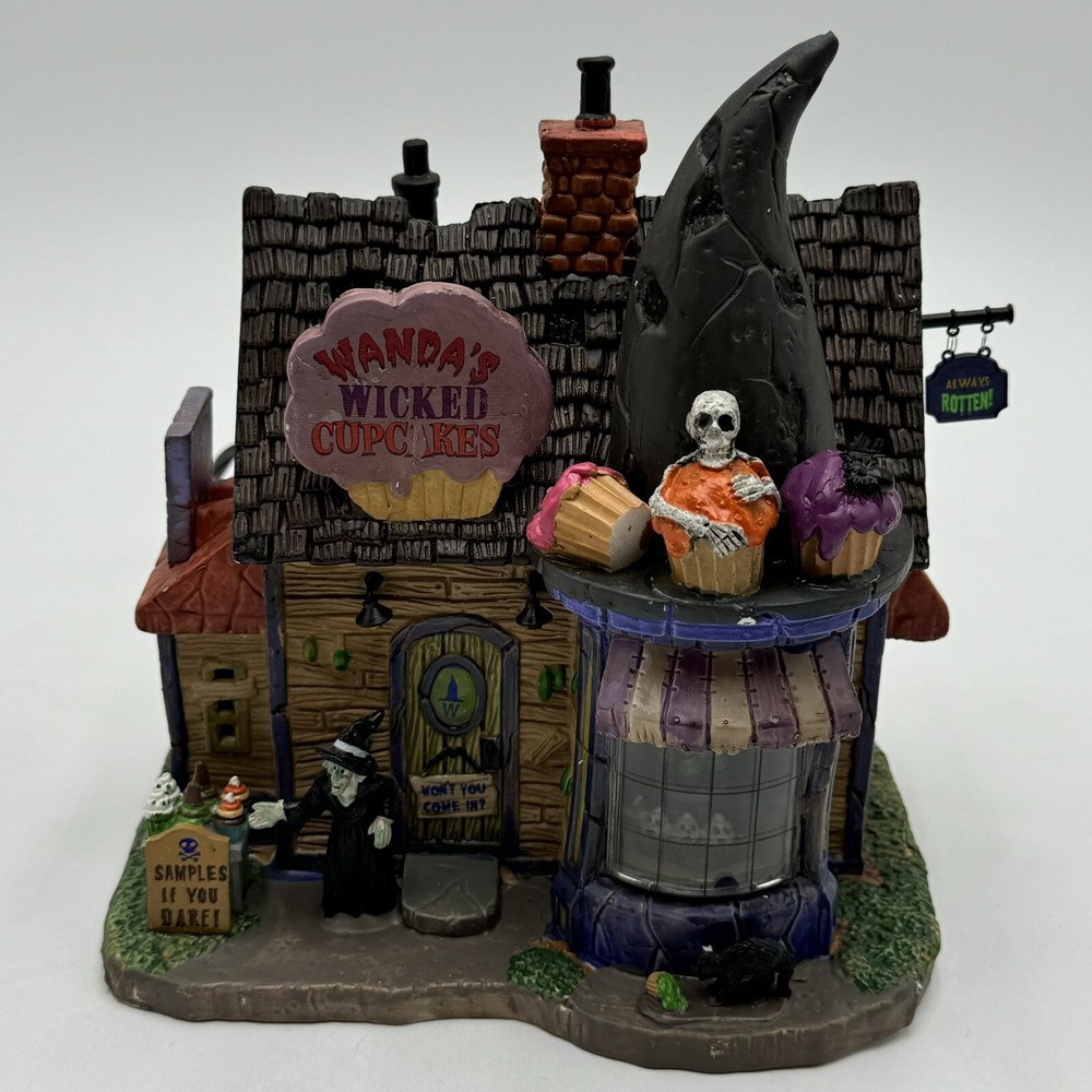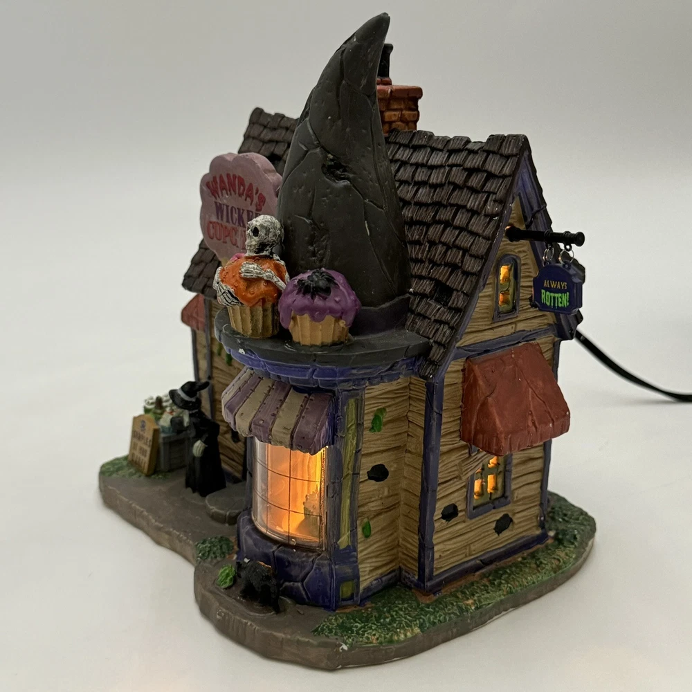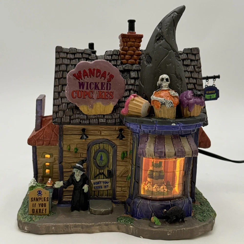 This Spooky Town cupcake set features Wanda's Wicked Cupcakes, perfect for Halloween celebrations. The set includes a box for easy gifting and storage. The multicolor designs and retired features make this a must-have for any Halloween collector. The Lemax brand is known for its quality and attention to detail, making this a great addition to any collection. The set is part of the Spooky Town collection and is perfect for seasonal and holiday decorations. This ceramic Halloween decoration has been glued back together multiple times. The item has also been chipped please look at all the pictures and video.