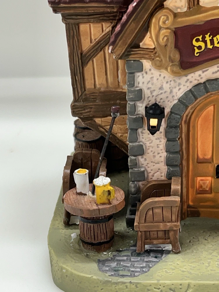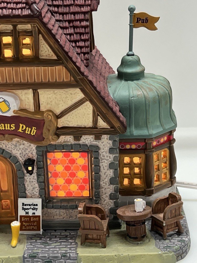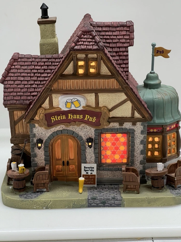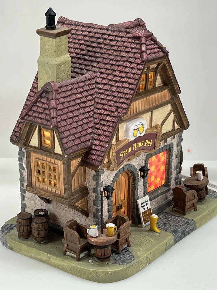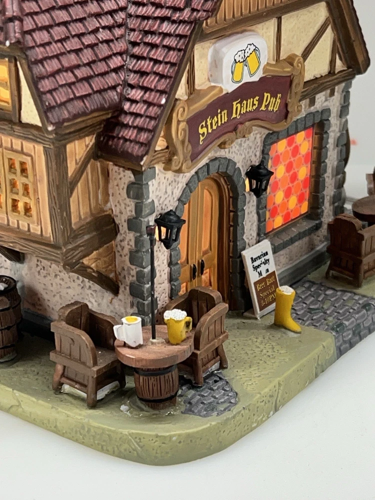 The Lemax Stein Haus Pub from Caddington Village is a medium-sized, hand-painted porcelain building featuring intricate Victorian-era architecture. This lighted Christmas village building is part of the Lemax Caddington Village Holidays & Seasons collection, with a colorful multicolor finish showcasing a beer boot and Bavarian specialty menu. Suitable for village display, this English-style building is perfect for adding a touch of mystery and romance to any room during the holiday season. With easy care instructions and a unique design, this collectible item is a must-have for Christmas decorations. Beautiful piece unfortunately missing umbrella over outside table . Comes with all original packaging including cord & light