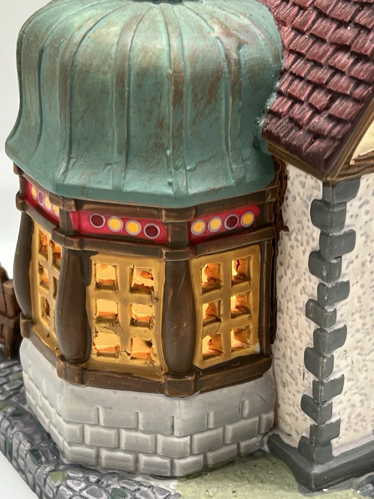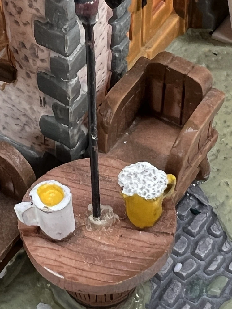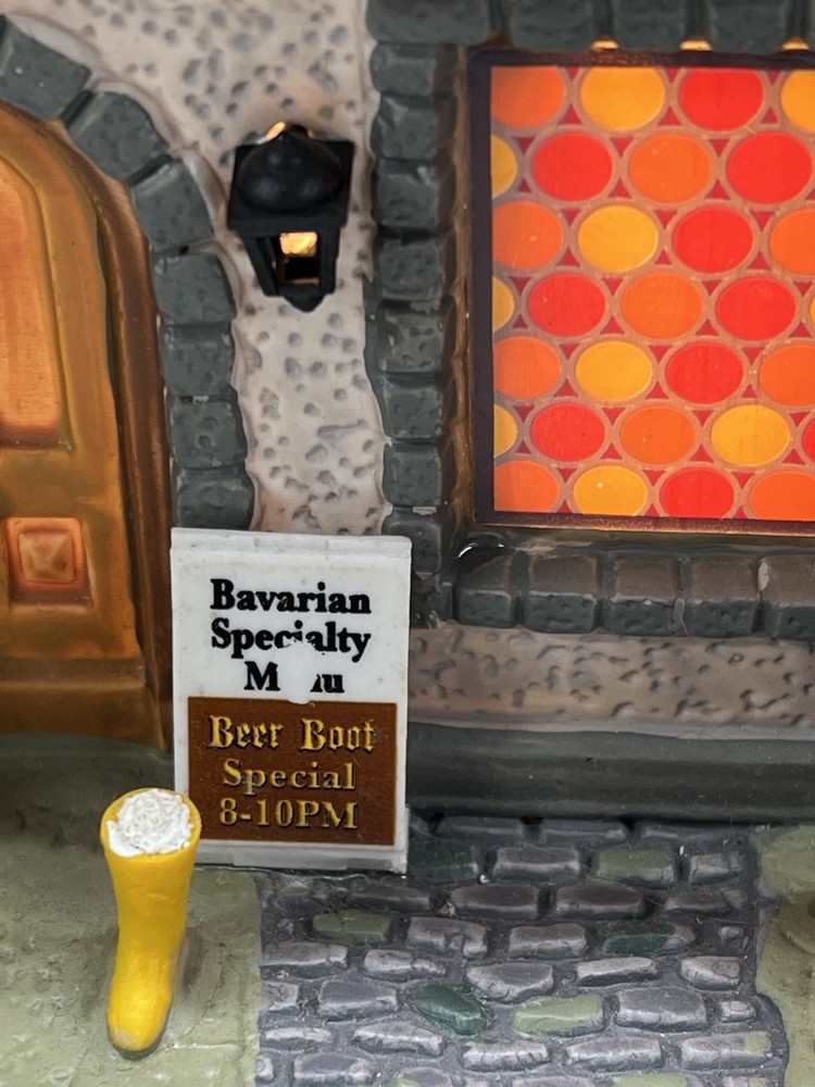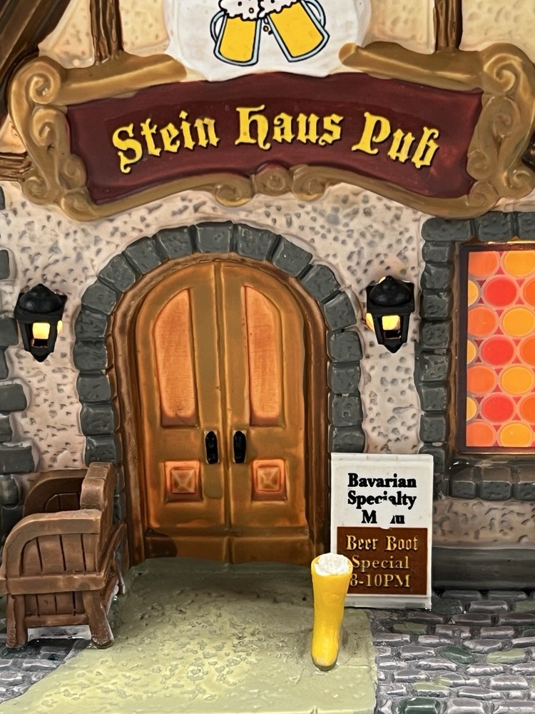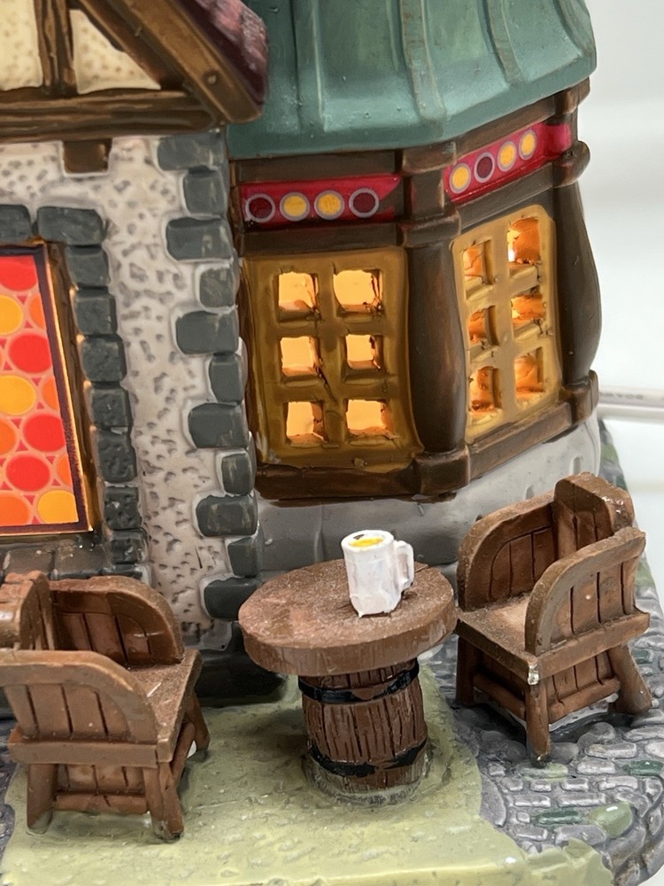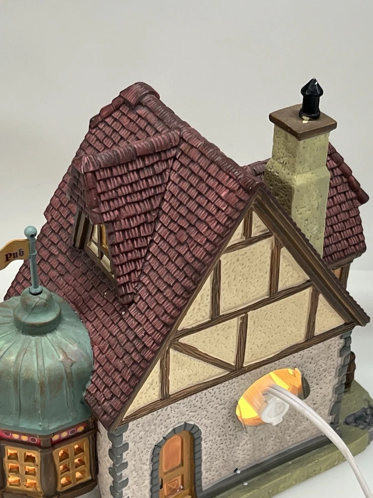 The Lemax Stein Haus Pub from Caddington Village is a medium-sized, hand-painted porcelain building featuring intricate Victorian-era architecture. This lighted Christmas village building is part of the Lemax Caddington Village Holidays & Seasons collection, with a colorful multicolor finish showcasing a beer boot and Bavarian specialty menu. Suitable for village display, this English-style building is perfect for adding a touch of mystery and romance to any room during the holiday season. With easy care instructions and a unique design, this collectible item is a must-have for Christmas decorations. Beautiful piece unfortunately missing umbrella over outside table . Comes with all original packaging including cord & light