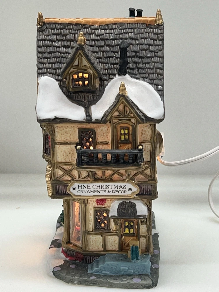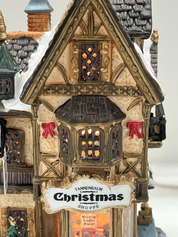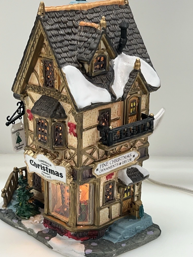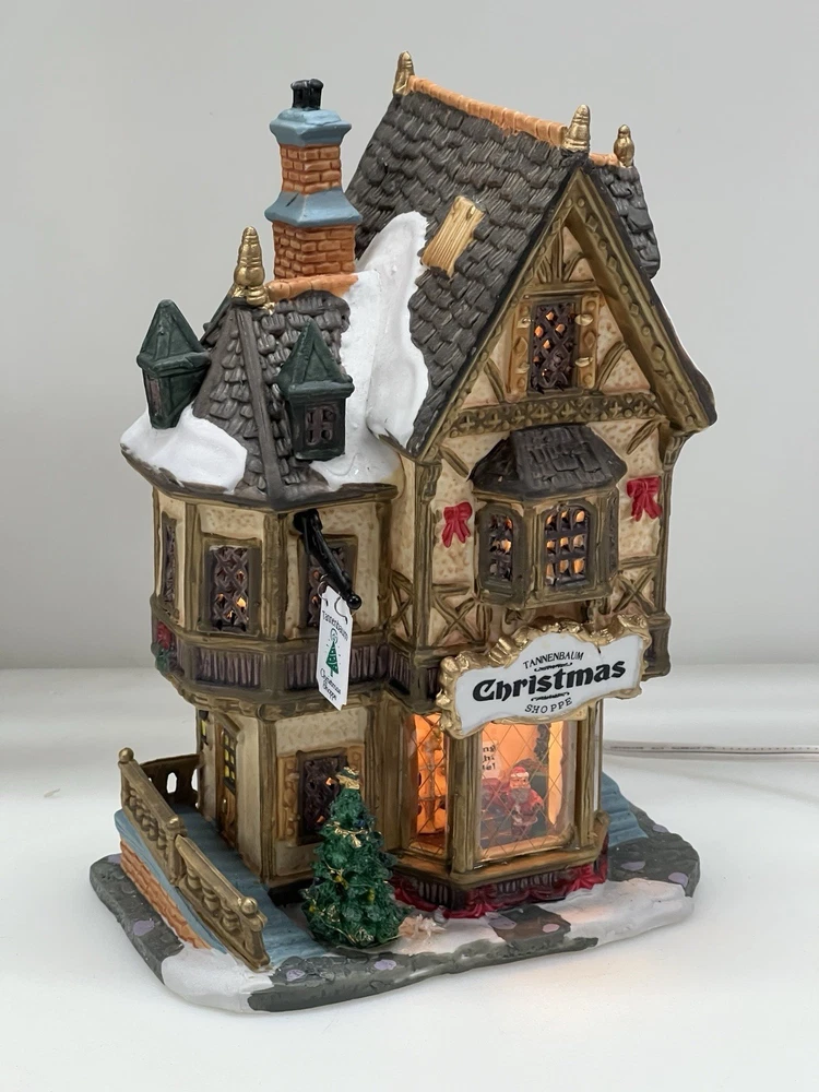 This is a rare and sought-after Lemax Christmas Village piece from the Carillon Decorative Products collection. The Tannenbaum Christmas Shoppe, manufactured in 2003, is a beautiful and intricate porcelain asymmetrical building with a whimsical pattern and multicolor finish. It measures 6 inches in length, 8-1/2 inches in height, and 4 inches in width and comes boxed with a light for easy display in any room. This piece is perfect for collectors of Christmas Shoppe-themed items and those looking to add a touch of Victorian style to their holiday decor. Absolutely incredible detail, design & color ! Perfect pristine condition! Includes all original packaging including cord & light !