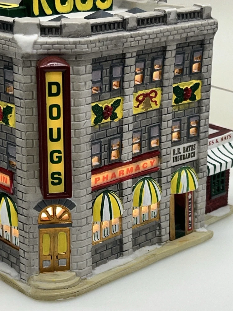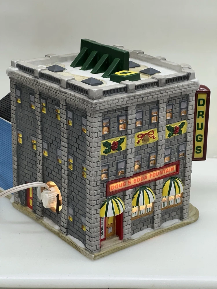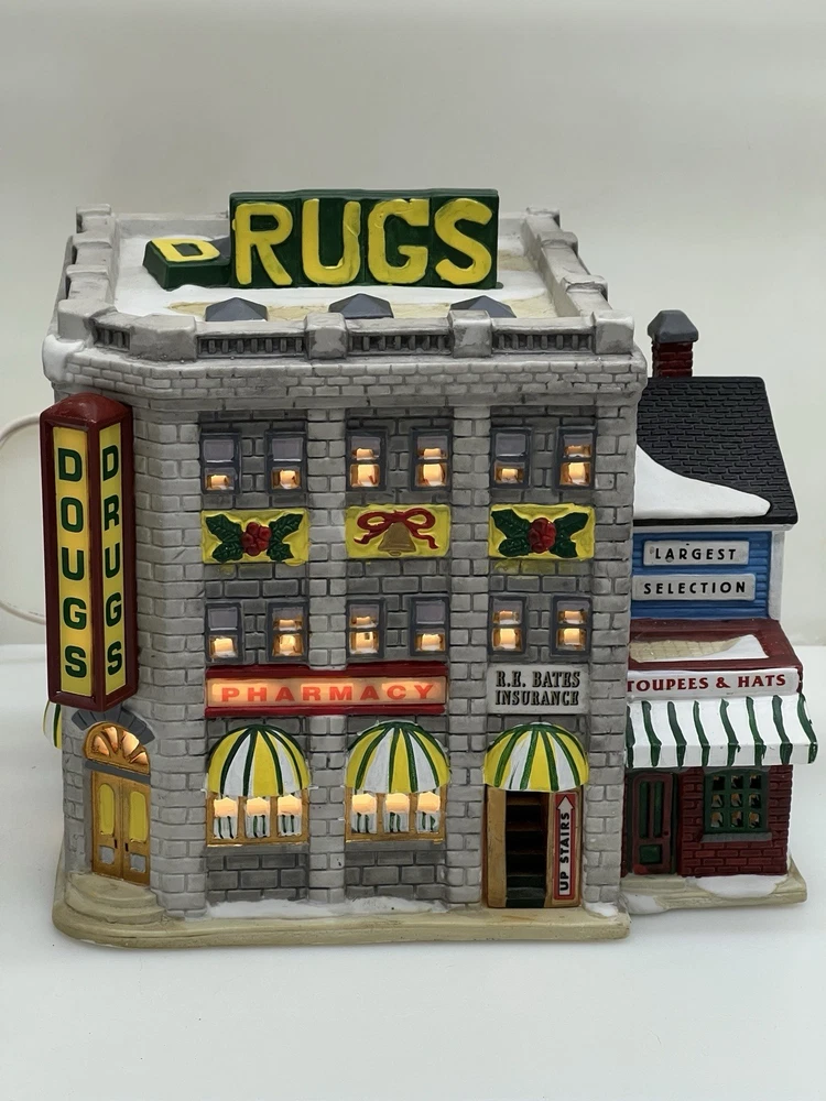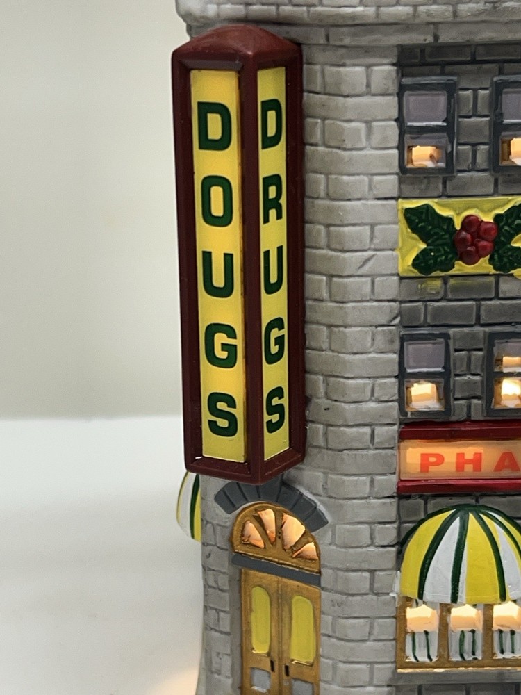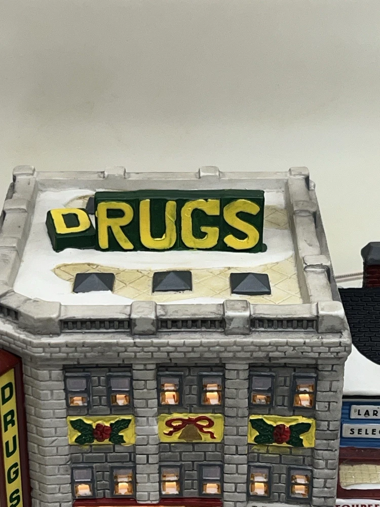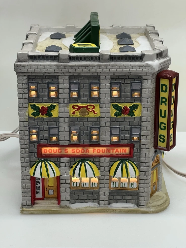 The Lemax Village Collection Jukebox Junction "Drug Store" is a medium-sized ceramic Christmas village piece from 1998. It features an asymmetrical shape and whimsical Drug Store & Pharmacy design, hand-painted with a multicolor finish. This illuminated, retired piece is part of the Village Collection Jukebox Junction series, ideal for seasonal village displays in any room. With intricate details and a 3D effect, this collectible item is a unique addition to any holiday and seasonal decor collection. Absolutely incredible detail and color ! Very whimsical piece in excellent condition! 1998 !! Comes with all clean original packaging including the cord and light . Rare piece seldom seen or sold in amazing condition. The letter “D” on the roof is designed that way , not broken. SouthCt