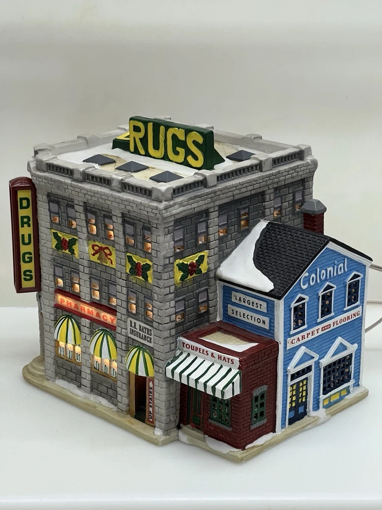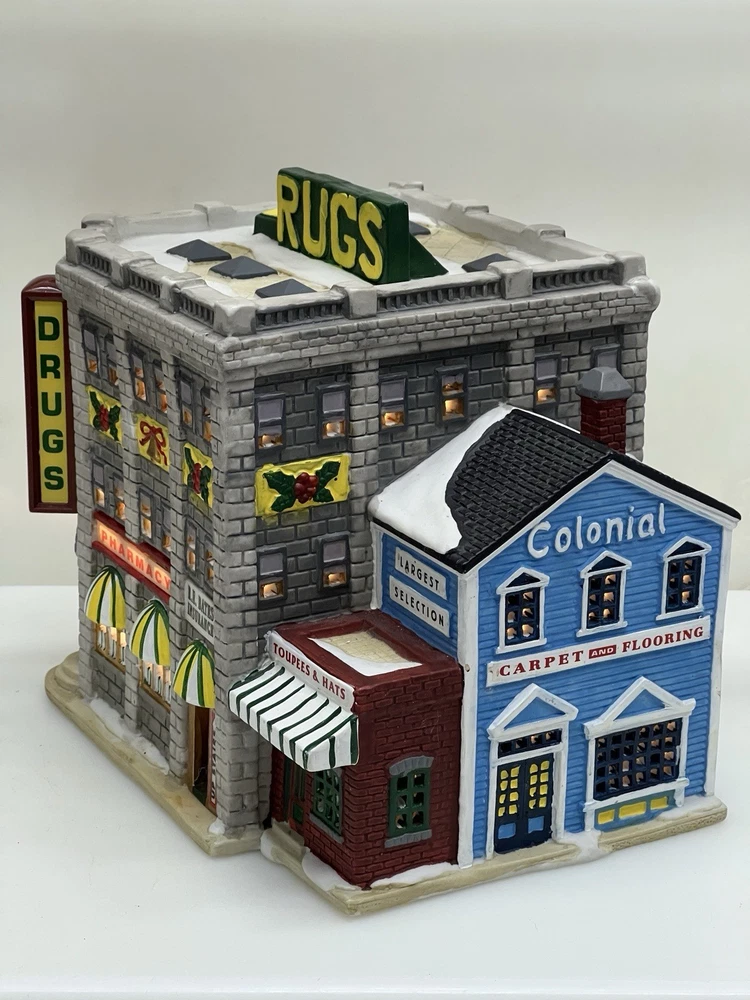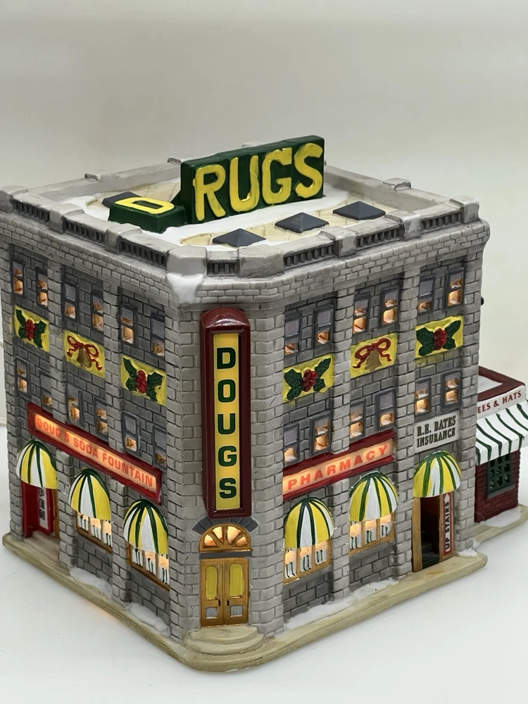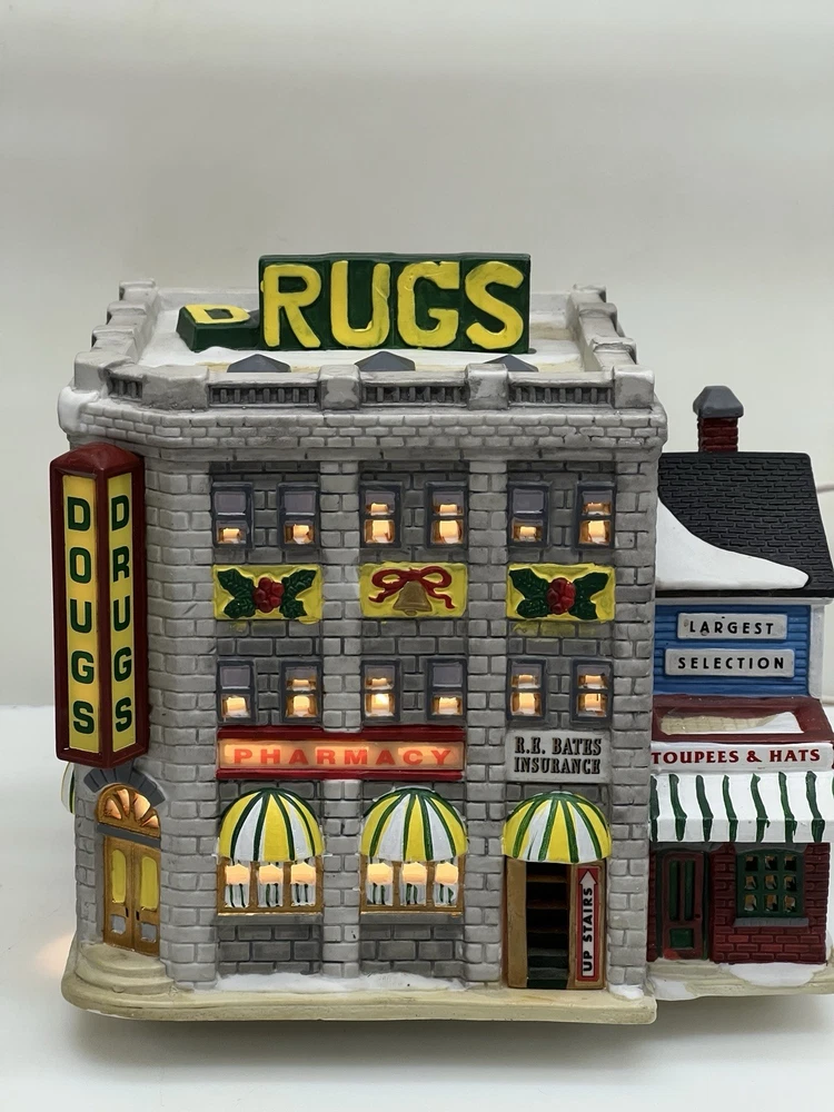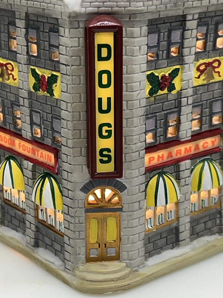 The Lemax Village Collection Jukebox Junction "Drug Store" is a medium-sized ceramic Christmas village piece from 1998. It features an asymmetrical shape and whimsical Drug Store & Pharmacy design, hand-painted with a multicolor finish. This illuminated, retired piece is part of the Village Collection Jukebox Junction series, ideal for seasonal village displays in any room. With intricate details and a 3D effect, this collectible item is a unique addition to any holiday and seasonal decor collection. Absolutely incredible detail and color ! Very whimsical piece in excellent condition! 1998 !! Comes with all clean original packaging including the cord and light . Rare piece seldom seen or sold in amazing condition. The letter “D” on the roof is designed that way , not broken. SouthCt