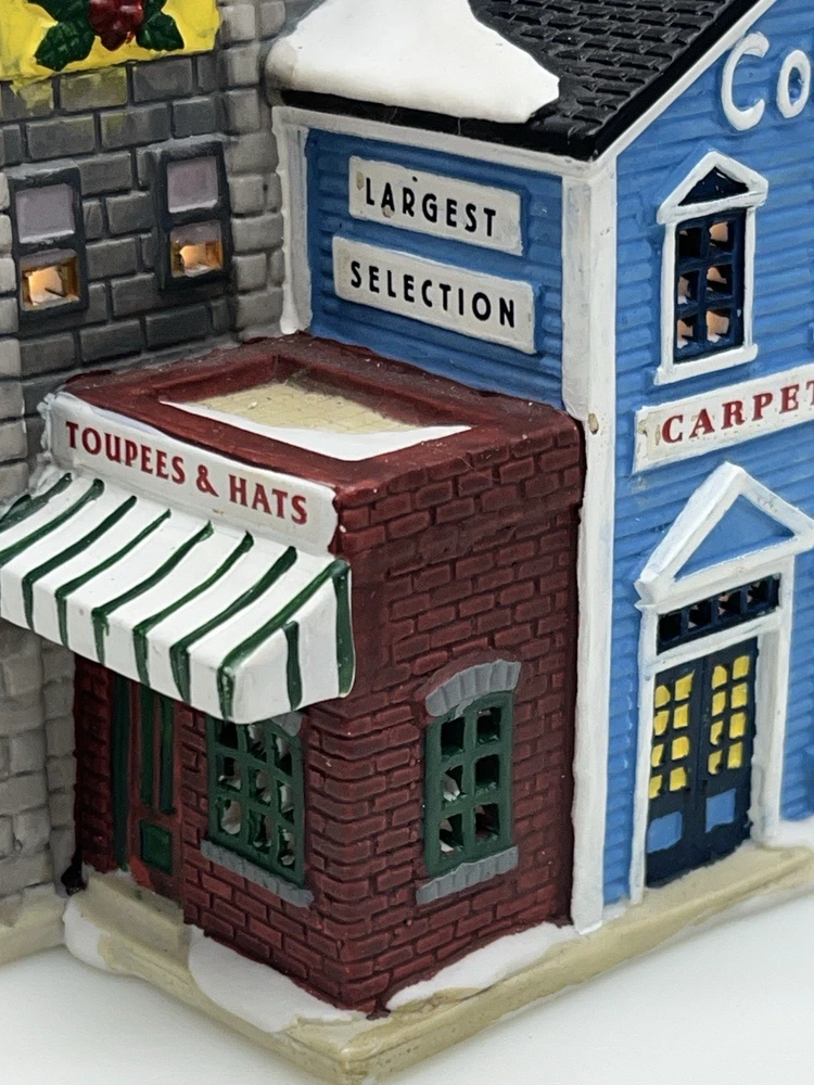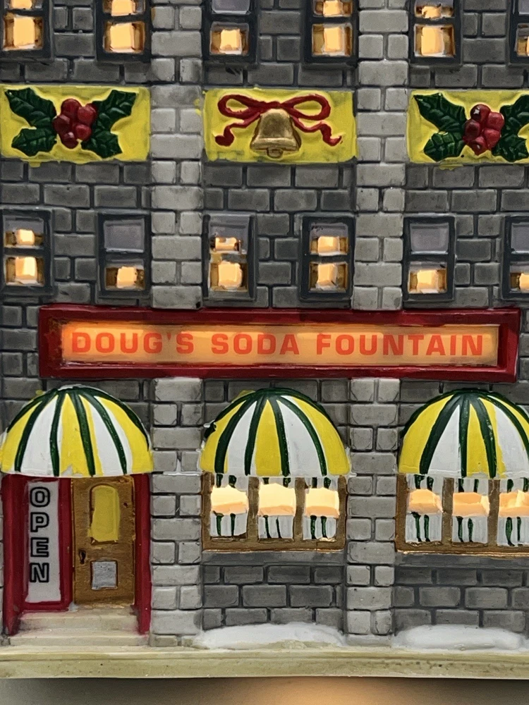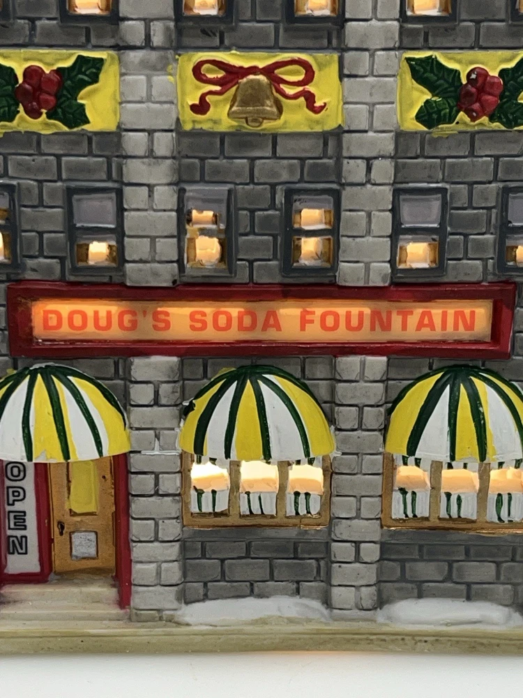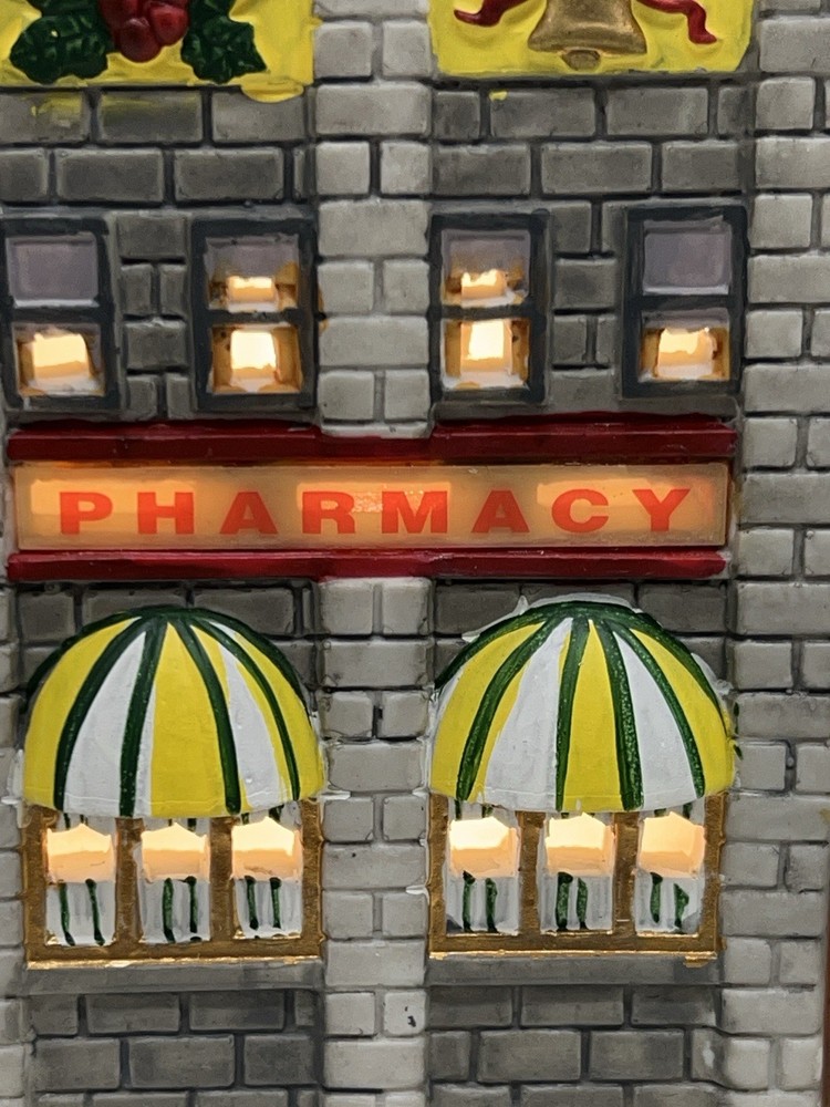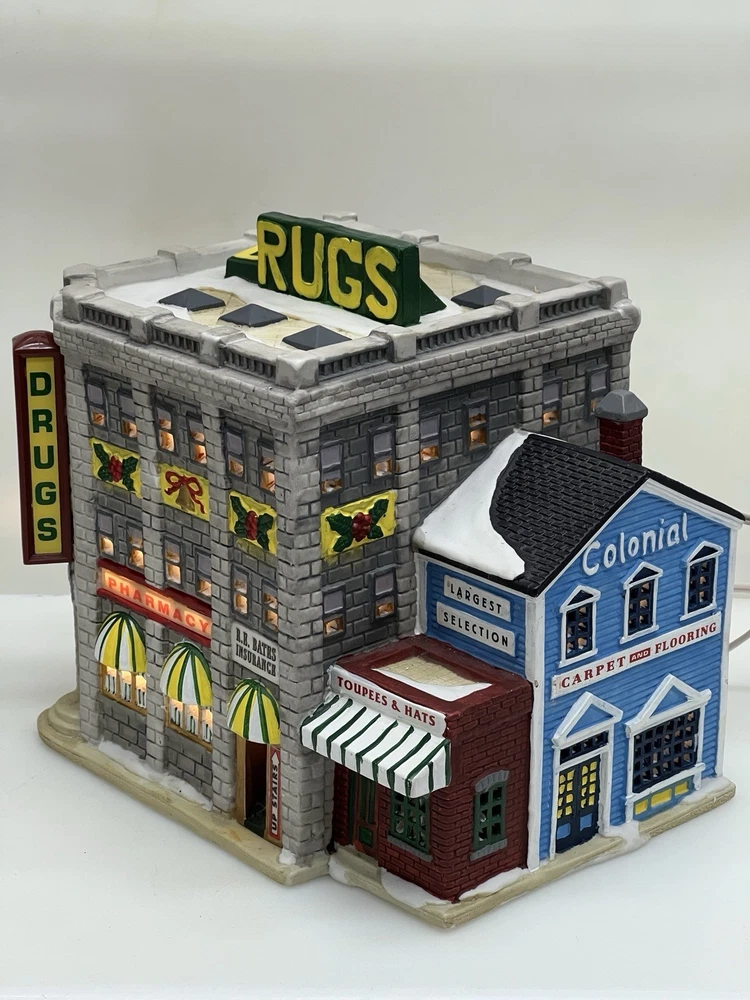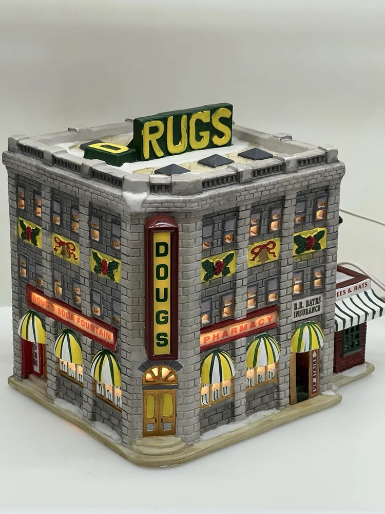 The Lemax Village Collection Jukebox Junction "Drug Store" is a medium-sized ceramic Christmas village piece from 1998. It features an asymmetrical shape and whimsical Drug Store & Pharmacy design, hand-painted with a multicolor finish. This illuminated, retired piece is part of the Village Collection Jukebox Junction series, ideal for seasonal village displays in any room. With intricate details and a 3D effect, this collectible item is a unique addition to any holiday and seasonal decor collection. Absolutely incredible detail and color ! Very whimsical piece in excellent condition! 1998 !! Comes with all clean original packaging including the cord and light . Rare piece seldom seen or sold in amazing condition. The letter “D” on the roof is designed that way , not broken. SouthCt