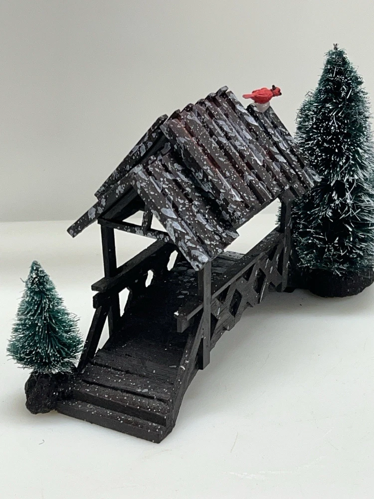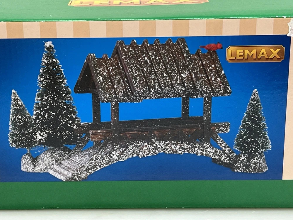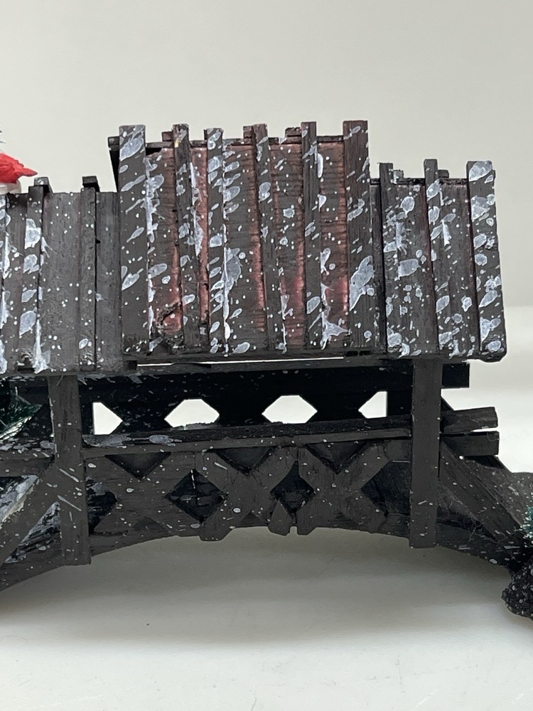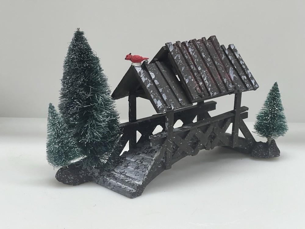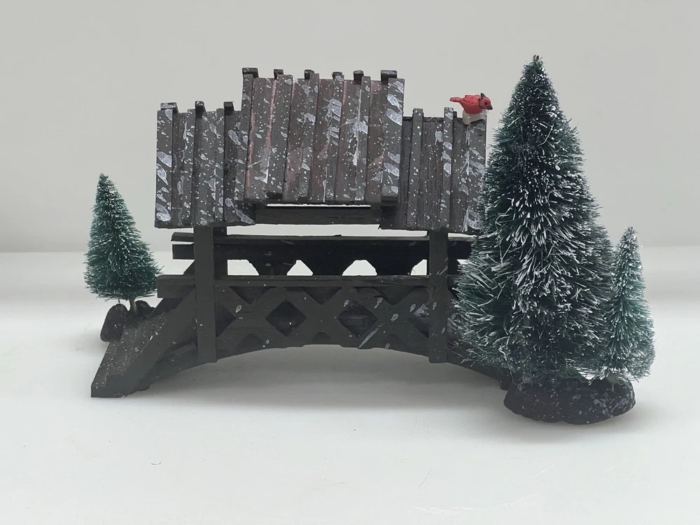 The Lemax Wooden Bridge With Trees from the Village Collection Holiday Scene 2001 is a small asymmetrical Christmas village accessory made of mixed materials. This rustic-style piece features a footbridge design with trees, perfect for adding a festive touch to any room during the holiday season. The Lemax Table Accent Foot Bridge comes boxed and is part of the Lemax brand's seasonal collection, making it a charming addition to any Christmas decor ensemble. Made of polystyrene.