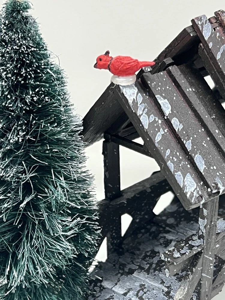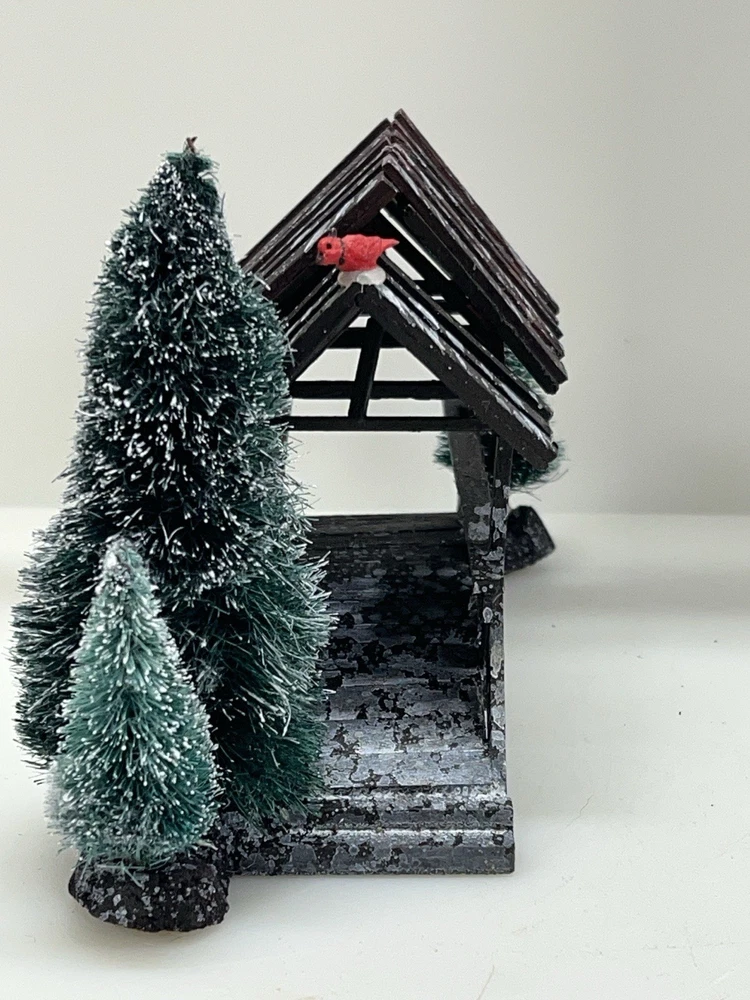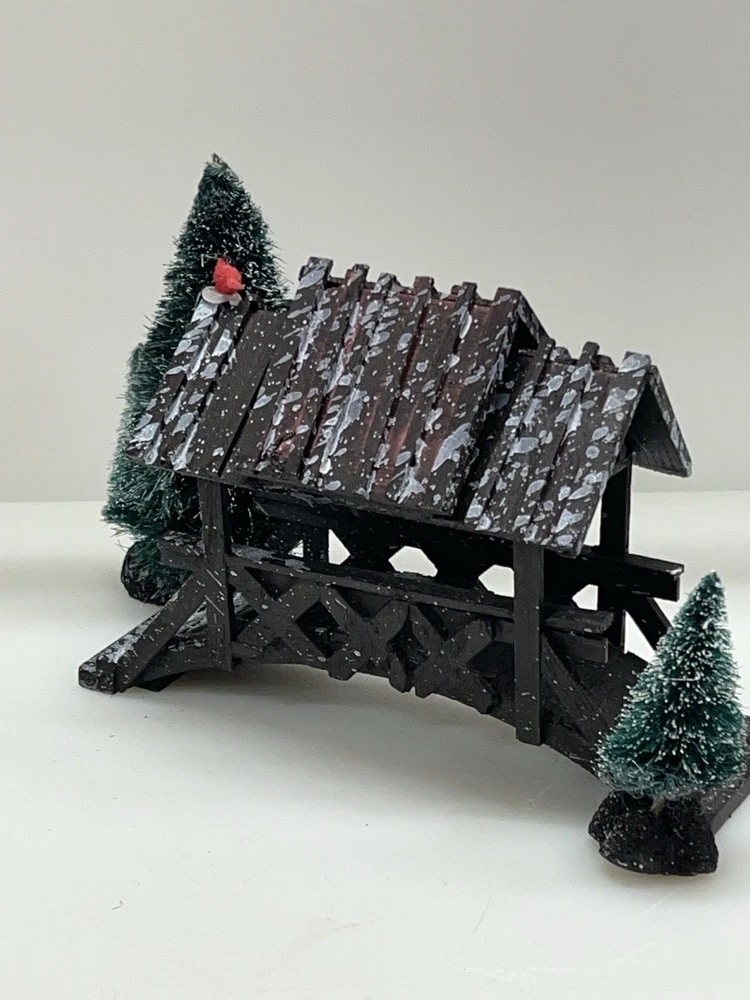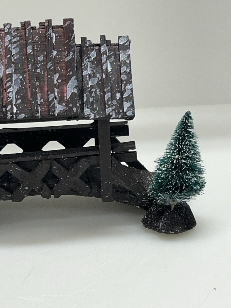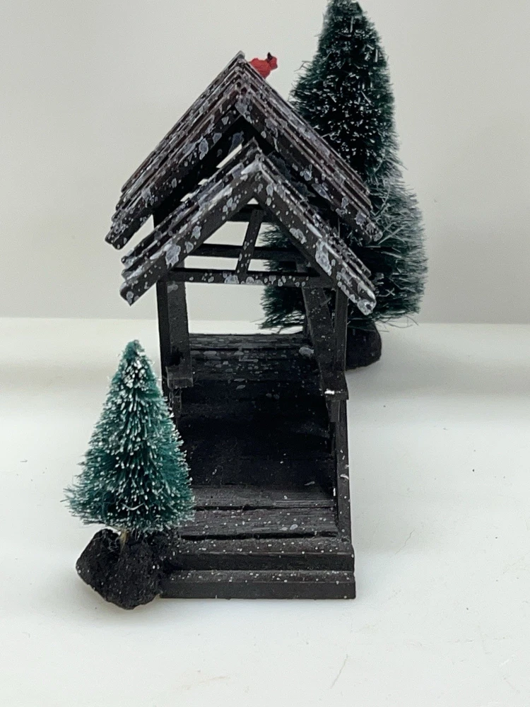 The Lemax Wooden Bridge With Trees from the Village Collection Holiday Scene 2001 is a small asymmetrical Christmas village accessory made of mixed materials. This rustic-style piece features a footbridge design with trees, perfect for adding a festive touch to any room during the holiday season. The Lemax Table Accent Foot Bridge comes boxed and is part of the Lemax brand's seasonal collection, making it a charming addition to any Christmas decor ensemble. Made of polystyrene.