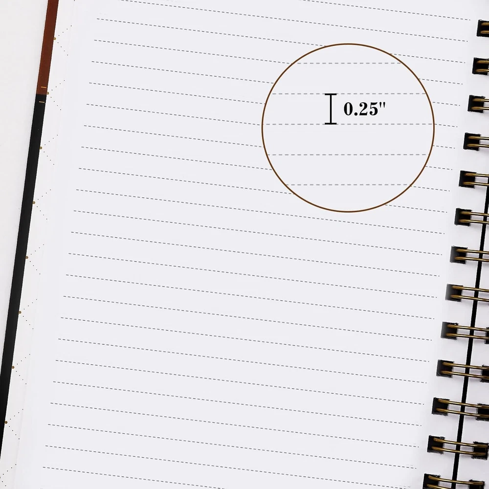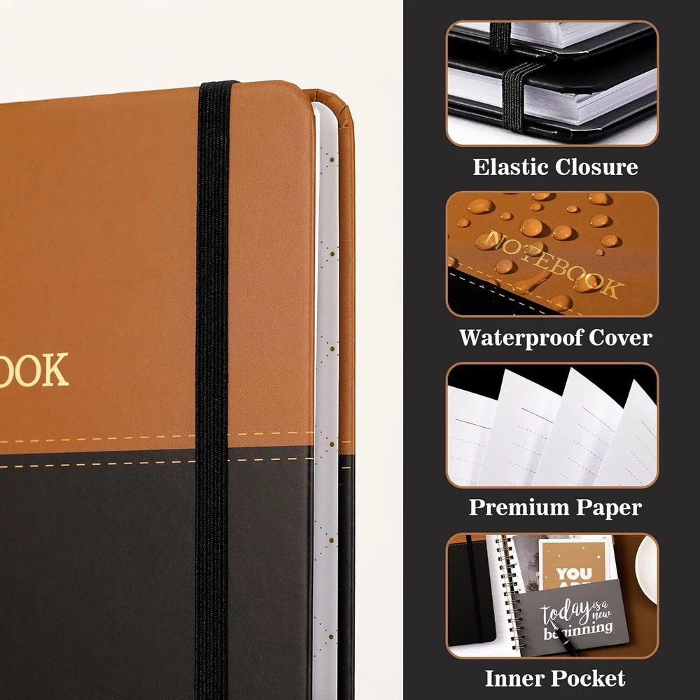 📙RULED JOURNAL NOTEBOOK - The college ruled journal is 6.2'' x 8.4'' with premium white pages. It features round corner for easier carrying, sturdy back pocket for small items, and a elastic closure band to keep your notebook close. The gorgeous cover makes it more individualized. 📙WATERPROOF COVER – The Cover of this spiral notebook is gorgeous and water-resistant. Sturdy and water-resistant cover protects interior pages while journal or traveling. Keep you covered for all occasions as a writing, meeting, or school notebook. 📙PREMIUM THICK PAPER - Premium thick paper of this ruled notebook effectively prevents ink-through for better clean writing space and the paper is thicker than other journals. College rules in 0.25", wide enough to keep handwriting neatly. Also, smooth touch of this lined notebook will provide a good writing experience. 📙LAY-FLAT NOTEBOOK - Let you reading more easy and note-taking efficiency. The notebook journal with elastic closure keeps it securely closed. And the spiral bound of this notebbok ensures pages not get peeled away from the cover. Enjoy your writing by hand with no distractions. 📙VERSATILITY – A special shares with your friends and family. Ideal for notebooks. It is also a great decoration for your desktop. A gift for festivals or anniversaries. Excellent for journey, school, college, office, writing workshop, etc. Product Description Lemome Series Notebooks - Ruled Notebook - 6.2'' x 8.4'' Jouranl for Writing ( 1 pcs ) - Brown Version A5 Ruled Notebook with Stylish Desgin Its compact size and lightweight design allows you to carry it everywhere. makes you get more done and feel better, everyday! Size: 6.2" x 8.4" Weight: 11 oz Elastic closure Inner pocket Premium thick white paper Six Defferent Color Notebook with Personalized Desig- You Can Choose One Which All Down to Personal Taste More Information About The Spiral Notebooks Stylish Journal Notebook The stylish spiral noteboook series with different color design for you to choose. The classic color combinations give you a better visual experience A5 sized notebooks are suitable for most bags and most scenarios Functional Design Dual color design Elastic Closure Waterproof Hard Cover Premium Thick Paper Back Inner Pocket Round Corner Design Twin-Wire Binding ✔ Sturdy Keeping ✔ Easy Cleaning ✔ Better Writing ✔ Portable Carrying ✔ Edge Without Folding ✔ Lay Flat Easily Inner Page Details of This Lined Notebook / Journal General-Purpose You can use this notebook to take notes, painting, do accounts and so on. Moderately Sized Spacing The spacing between the writing lines in this notebook is 0.25 inches, suitable for most writing styles. Enough writing pages This notebook with126 Pages for long term writing. Classic Notebook / Business Notebooks - Good for School & Office & Home