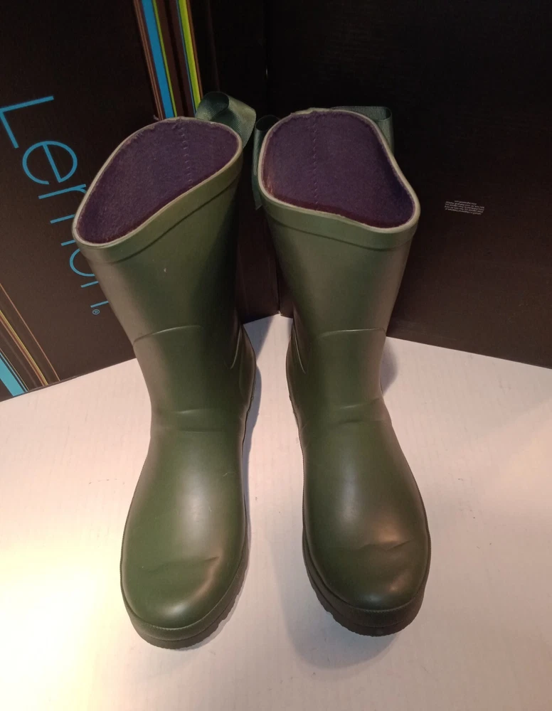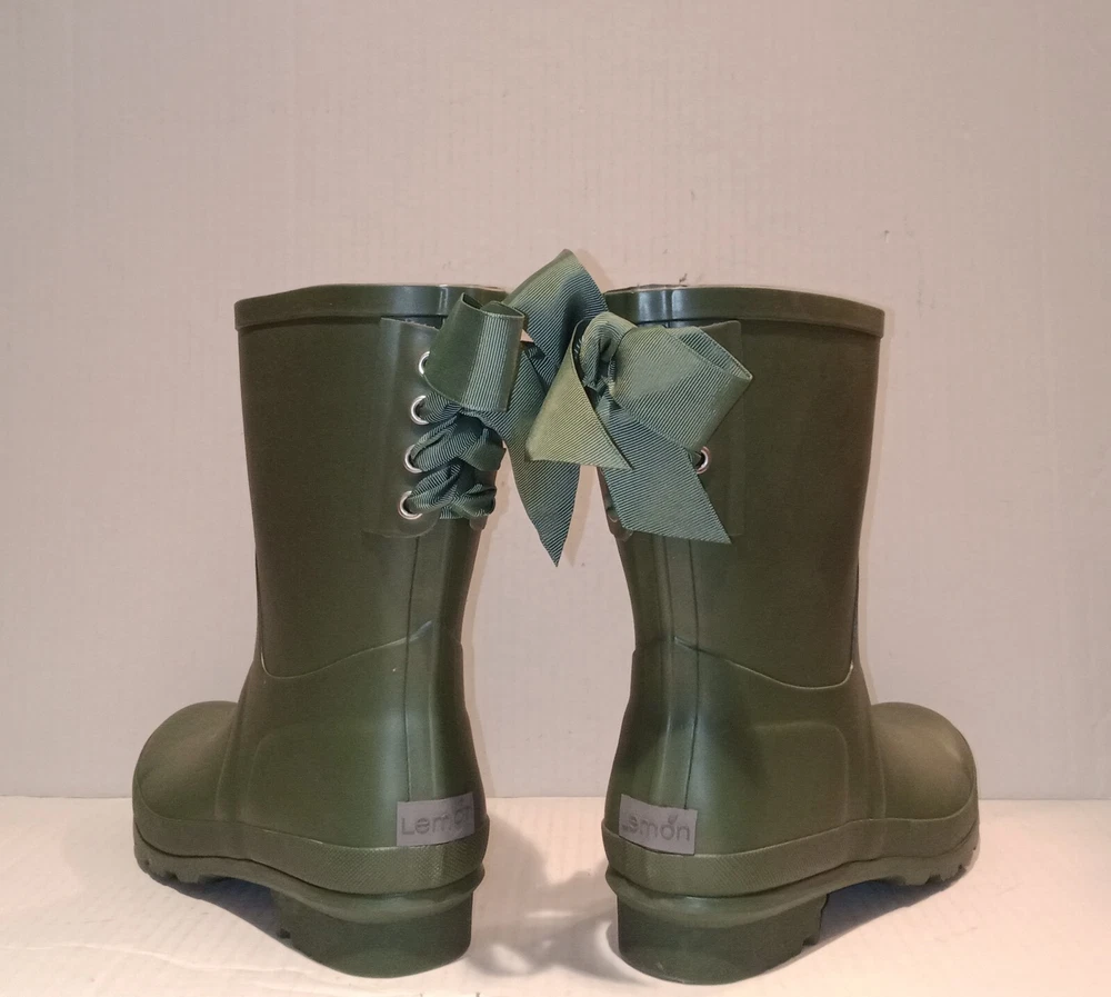 Lemon Lace-Up Rubber Rain Boots, LMBRT-3607, Duck Green Women's Size 10 $99 NIB. Stylish fisherman design with a feminine gros grain ribbon lace-up in the back. Utilitarian. Pull-On construction. The ribbon is only decorative. They don't open at the back. Excellent condition, never worn, just stored in the box with no major flaws, damage, etc noted. Zoom in. See pics. Smoke free,pet free household.... Please see my other quality items including designer handbags, designer shoes, designer, vintage, semi-precious jewelry, Swiss watches, apparel, and home goods, etc. Thanks for looking.