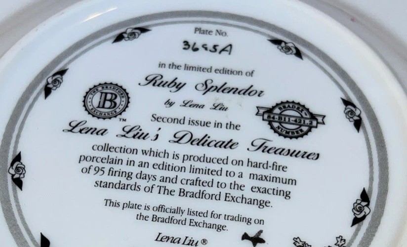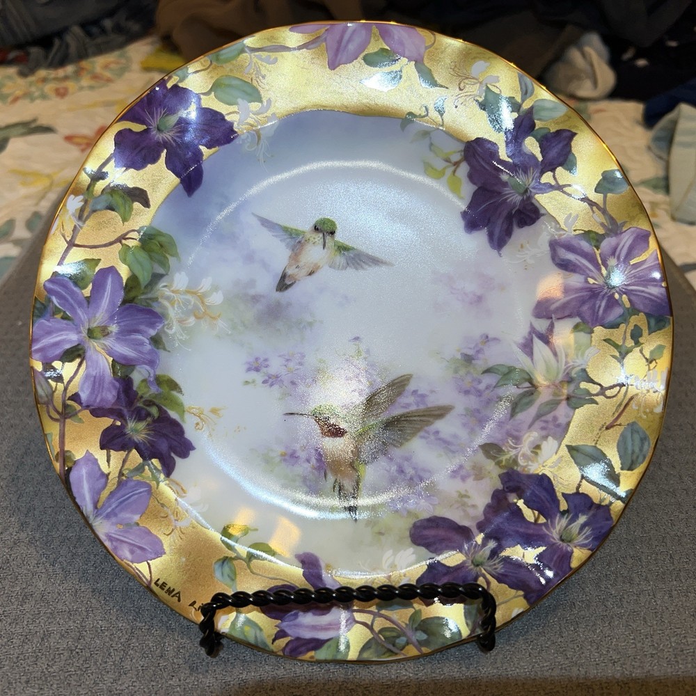 Plate no. 3685A in the limited edition of Ruby Splendor by Lena Liu, this exquisite Crown Jewels Hummingbirds Lilac Floral Plate is a testament to the artistry of the late 20th century. Part of the esteemed Bradford Exchange collection, "Lena Liu’s Delicate Treasures," this collector's item features a vibrant multicolored floral pattern with delicate hummingbird details, embodying the elegance of American art pottery tradition. The porcelain plate measures 8 1/8 inches in diameter, perfectly round, and is suitable for display on any occasion. Rooted in a rich culture of craftsmanship, this piece combines the timeless appeal of decorative style with the skilled pottery techniques of the 1990 era. It is a true vintage gem for both enthusiasts and discerning collectors alike.