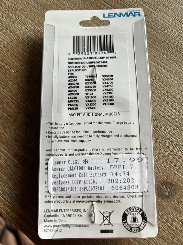 Lenmar CLLG1000 Cell Phone Battery Lithium Ion 3.7V 900mAh New Sealed. Condition is New. Shipped with USPS Ground Advantage.