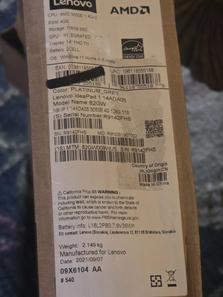 Lenovo IdeaPad 1, 14" Notebook, Full HD(1920 x 1080), AMD Athlon Silver 3050e Dual-core (2 Core) 1.40 GHz, 4 GB RAM, 128 GB SSD, Windows 11 Home, HDMI, Platinum Gray, EAT 64GB SD Card BrandLenovo Model NameAMD Athlon Screen Size14 Inches ColorGray Hard Disk Size128 GB CPU ModelAMD R Series Fueled by the AMD Athlon Silver 3050e processor, this IdeaPad 1 laptop delivers powerful performance. It's the new standard for performance in innovative, thin, and light laptops. 14" FHD (1920 x 1080) Anti-glare Business Laptop. Radeon Graphics, AMD Radeon Graphics. 4GB DDR4 SDRAM 2400 MHz and 128GB SSD NVMe M.2 PCI Express. 802.11a, 802.11b, 802.11g, Wi-Fi 4 (802.11n), Wi-Fi 5 (802.11ac),Bluetooth 4.2,2x USB Ports; 2xUSB 3.2 Gen 1 Ports. 1x HDMI 1.4b. Windows 11 Home, it is a laptop that's perfect for your everyday tasks and satisfy your various demand. Bundle with EAT 64GB SD card. Color Gray Hard-Drive Size 128 GB Operating System Windows 11 Home Graphics Description Integrated Graphics Coprocessor AMD Radeon Graphics Hard Disk Description SSD Item Weight 3.09 Pounds Video Processor AMD Webcam Capability Yes Automatic Backup Software Included Windows 11 Home Form Factor Notebook Hard Disk Interface Solid State Graphics Ram Type Shared PROCESSOR Processor Series AMD R Series Processor Speed 1.4 GHz Processor Count 2 Processor Brand AMD CPU Model Number 3050e CPU Model Generation 3rd Gen CPU Codename 3050e DISPLAY Screen Size: 14 Inches Resolution: 1080p Native Resolution: 1920 x 1080 pixels Display Type: LED Display Resolution Maximum: 1920x1080 Pixels Display Technology: LED Supported Monitor Maximum Quantity: 1 Screen Finish: Anti-glare MEMORY RAM Memory Installed 4 GB RAM Memory Technology DDR4 Memory Clock Speed 2400 MHz Ram Memory Maximum Size 4 GB Memory Speed 2400 MHz RAM Type DDR4 SDRAM RAM Memory Slot Total Count 1 CONNECTIVITY Technology : Bluetooth, Ethernet, USB, Wi-Fi Wireless Technology: Wi-Fi Wireless Compability: 802.11a, 802.11ac, 802.11b, 802.11g 108 Mbps, 802.11n Bluetooth Version: 4.2 Bluetooth support? Yes