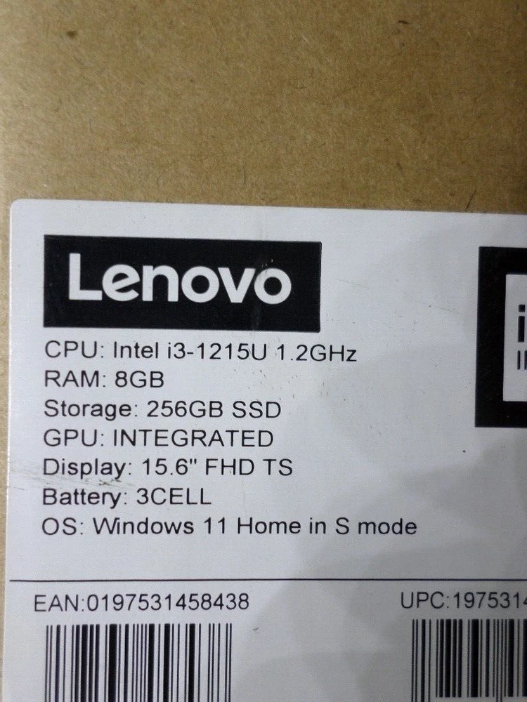 BRAND NEW LENOVO LAPTOP BOX DAMAGED BUT PRODUCT INSIDE IS IN PERFECT CONDITIO MODEL 82QD00DHUS CPU INTEL i3 1215u RMA 8GB STORAGE 256GB SSD WINDOWS 11 HOME S MODE DISPLAY 15.6"