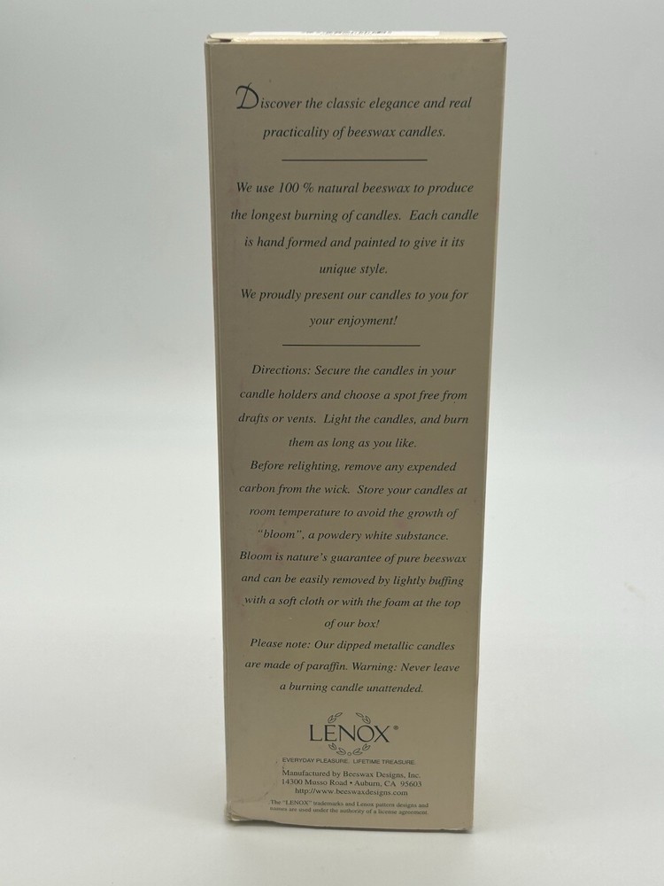 Material:BeeswaxColor:Redgtin13:Does not applyNumber in Pack:2UPC:Does not applyFeatures:SpiralStyle:ContemporaryShape:TaperBrand:LenoxPersonalize:NoHandmade:YesType:Taper/Dinner CandleItem Height:12 inScent:UnscentedCountry/Region of Manufacture:United States