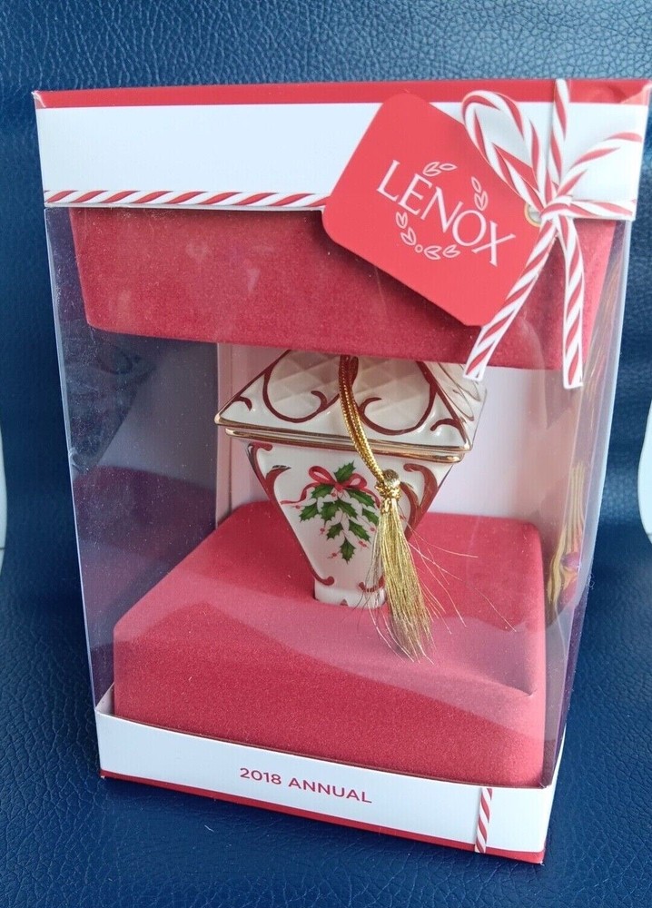 Lenox 2018 Annual Christmas Lantern Ornament Porcelian Ceramic In Box. I s crafted of hand painted ivory fine china, accented with gold. The Ornament bears the Lenox hallmark. It is about 4 inches tall. Consists of "Gold Like" Strand Tassel Box - worn at corners, scotch tape holds one side edge in back (see picture) Ornament in GREAT condition but date tags is loose (included in box)