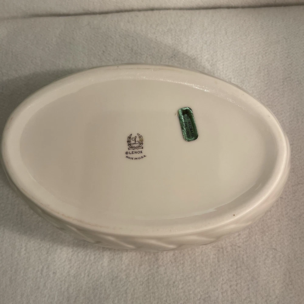 This Lenox serving bowl features an elegant design with a basket weave lattice pattern and a scalloped rim, making it suitable for all occasions. Crafted from ivory bone china, the oval bowl measures 8 inches in length and 2 1/8 inches in height. It is adorned with 24k gold trim, adding a touch of luxury to its vintage design from the 1980s. Made in the United States, this original Lenox piece is a timeless addition to any dining collection. Excellent condition. No chips or cracks.
