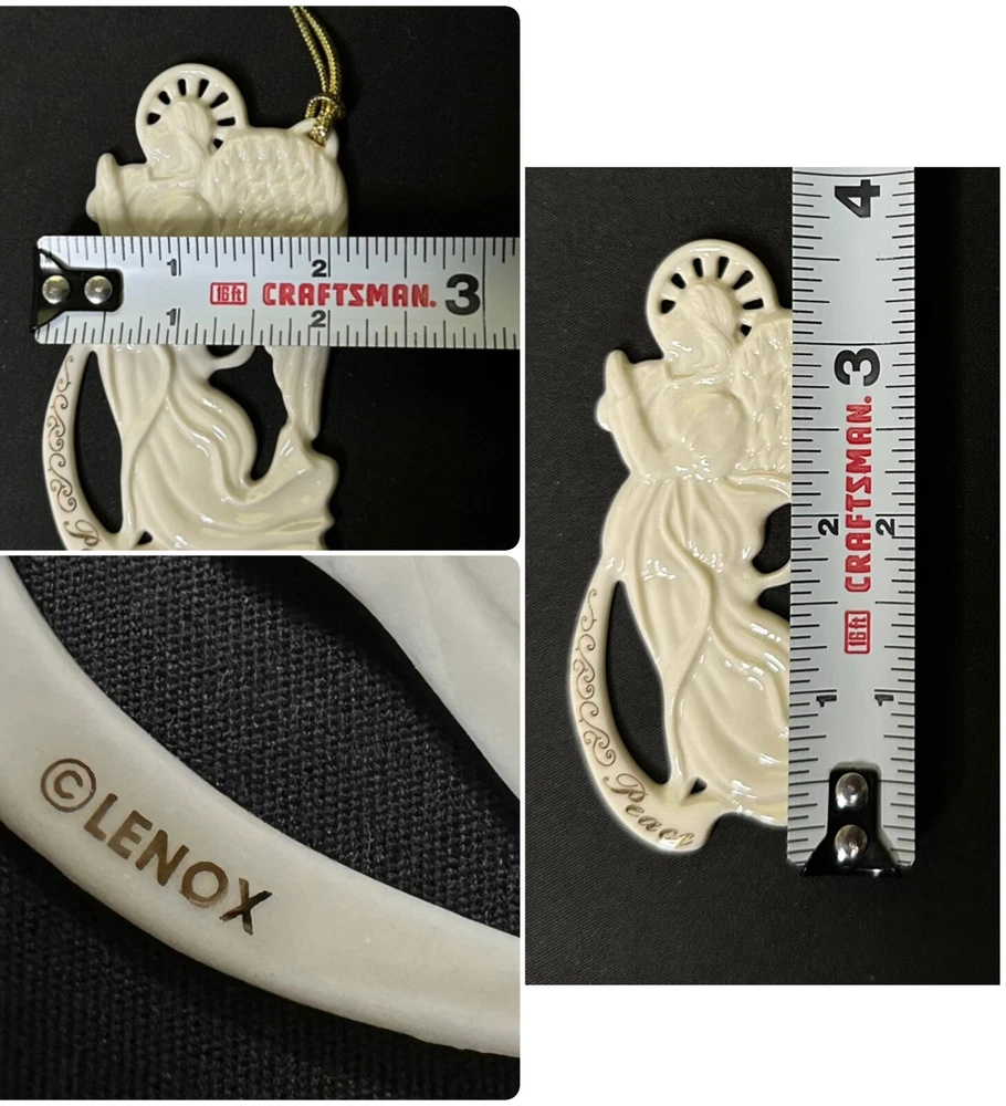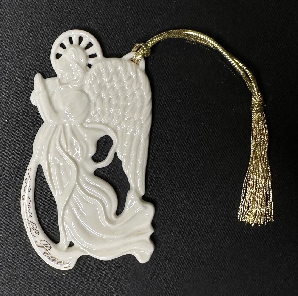 Lenox Angel of Peace Ornament with Box. Approximately 3 5/8” by 2 1/8” wide. Condition is Used. Please note imperfection on the angel’s backside hand (appears glazed over). Original Box Condition: The felt on the box has separated from the foam and material is flaking (small red particles).