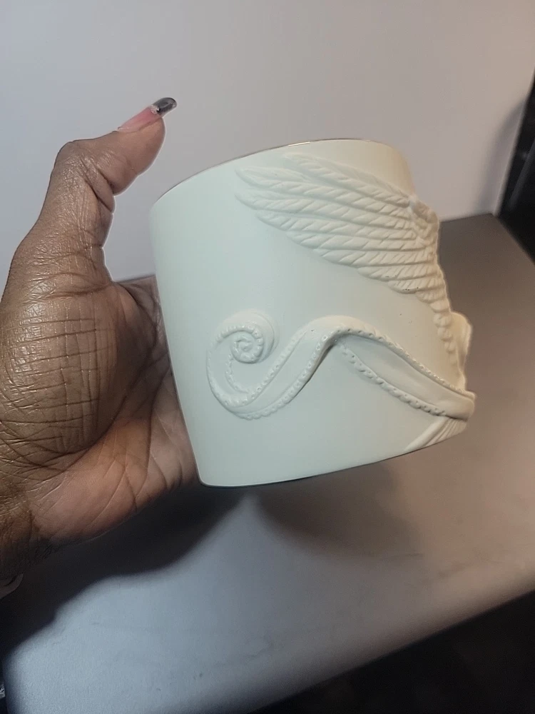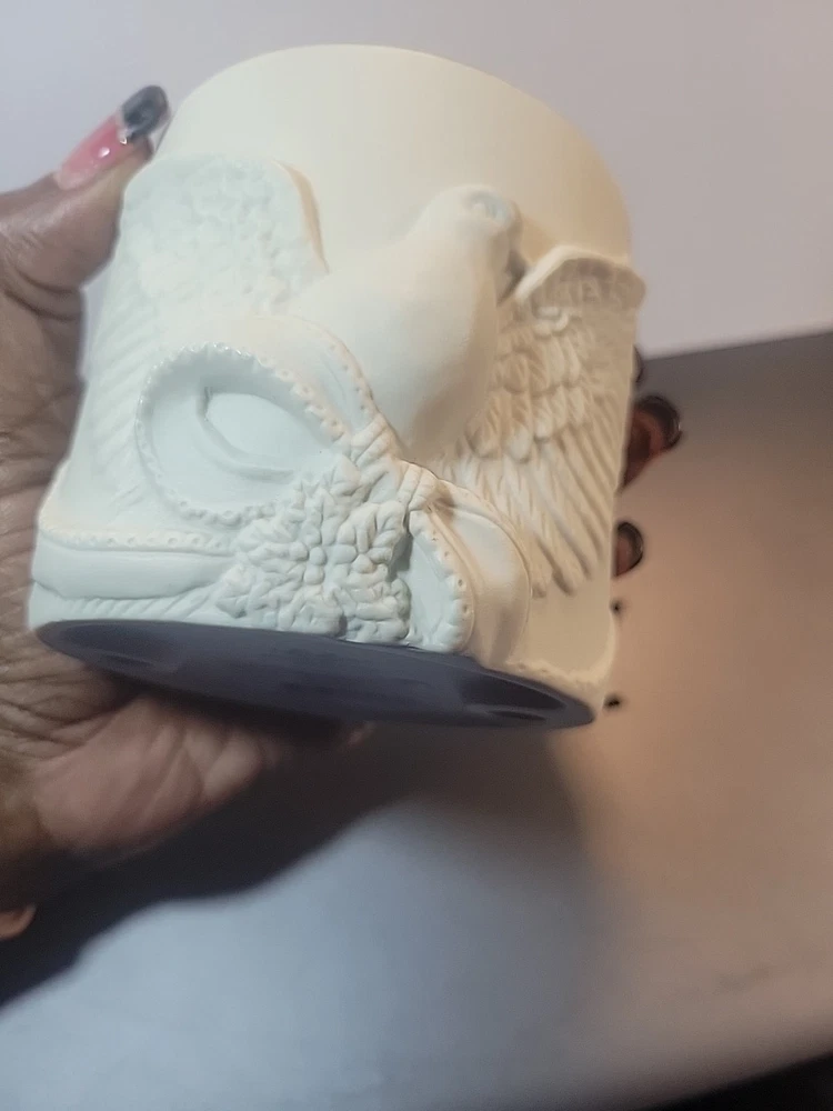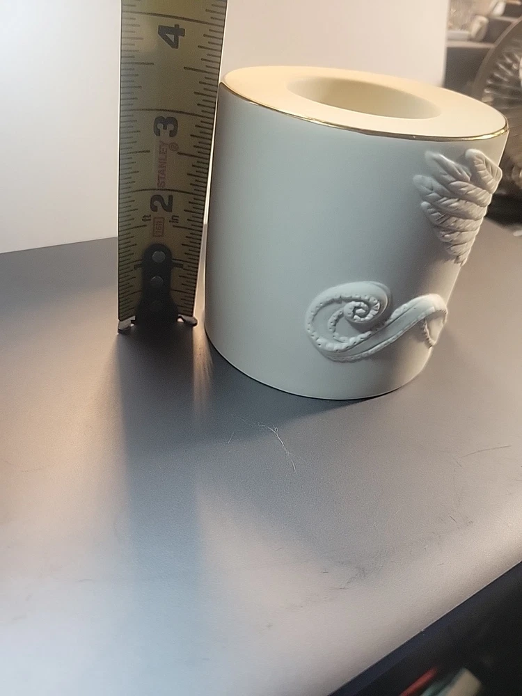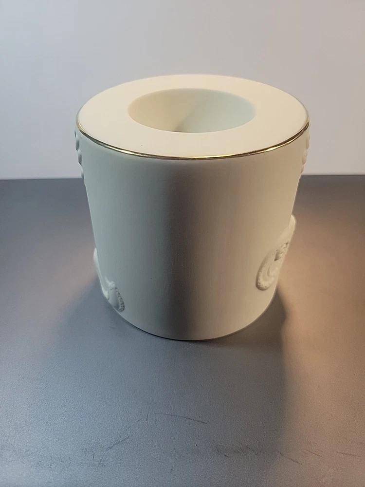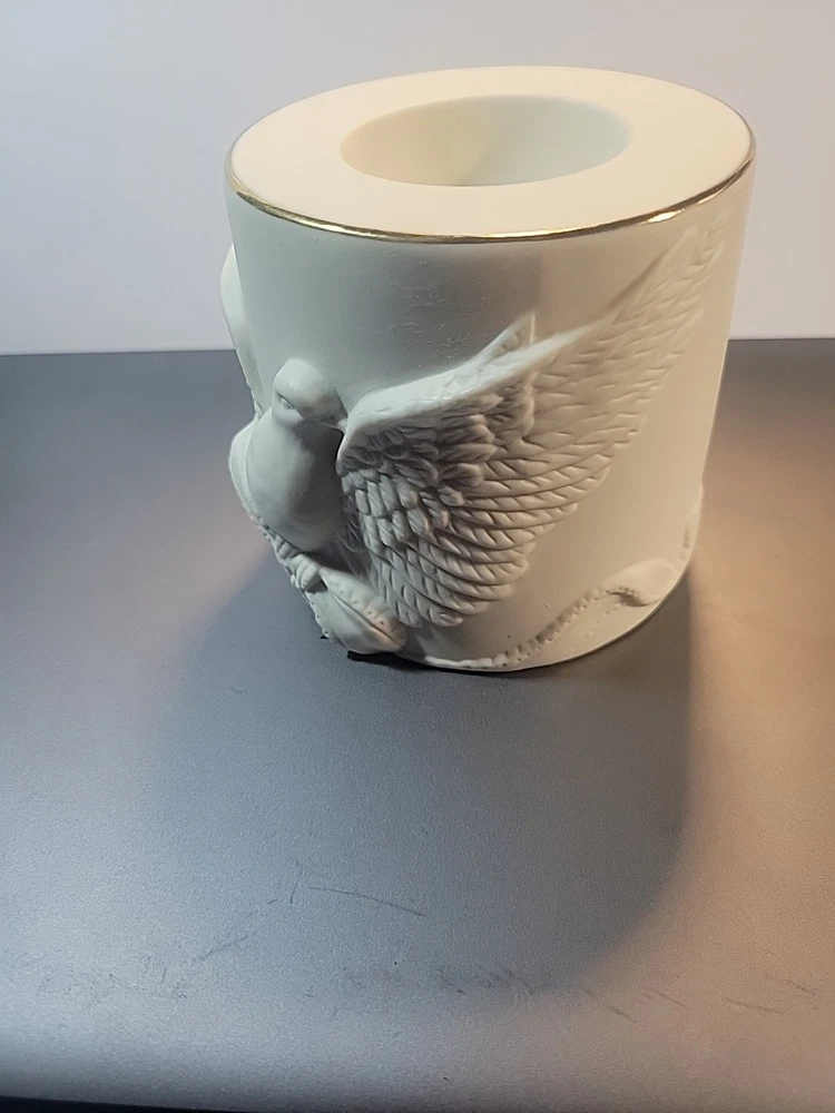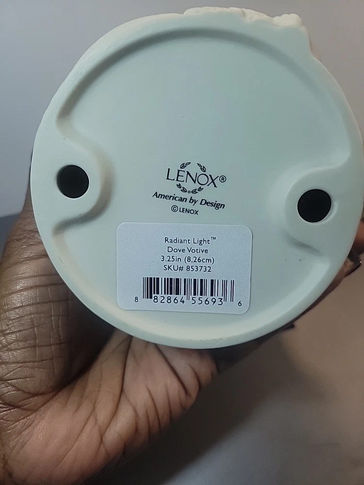This is a Lenox American by Design "Radiant Light" Dove Votive Candle Holder. It features an all-over design with a dove motif, made of white ceramic with a matte finish. The candle holder is round in shape and suitable for seasonal use. It is a single piece, ideal for decorative collecting. See all photos for wear and condition.