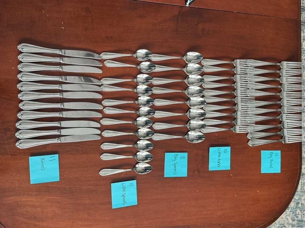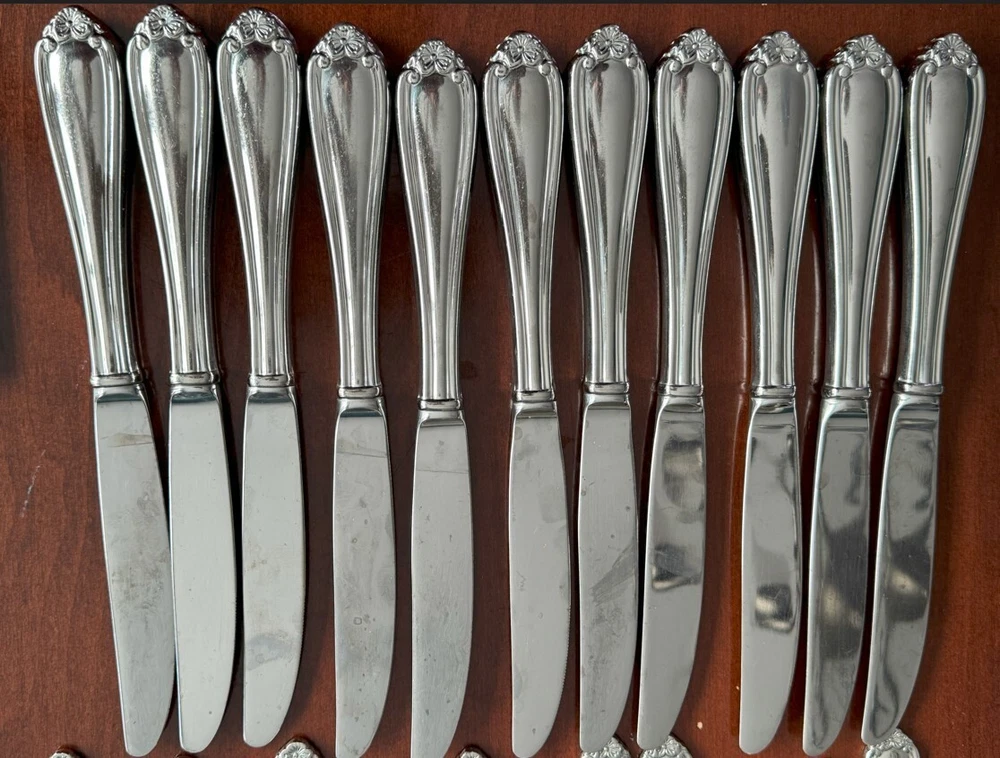 Lenox Bellina flatware. Purchased in 2008. Used. Minor scratches from use but these are in great condition otherwise - very sturdy and strong. This posting is for the knives, but I have the forks and spoons as well. Totals: 11 knives 11 smaller spoons 8 larger spoons 10 salad forks 11 dinner forks Manufacturer descriptions and dimensions: Bellina is made in a very heavy weight (one of the heaviest patterns we offer with a floral accent). Shiny finish, premium 18/10 stainless steel alloy, and a hollow handle knife, which features a premium cutting blade. This beautiful set of Lenox Flatware Bellina is perfect for adding a touch of elegance to your dining table. Crafted with precision and care, they feature a high-quality stainless steel construction that ensures durability and longevity. Whether you're hosting a formal dinner party or simply enjoying a casual meal with family and friends, these are sure to impress. With their stunning design and superior craftsmanship, they're the perfect addition to any flatware collection. Flatware lengths Salad Fork: 7 1/4" Place Fork: 8" Place Knife: 9 1/8" Soup Spoon: 6 7/8" Teaspoon: 6 1/4"