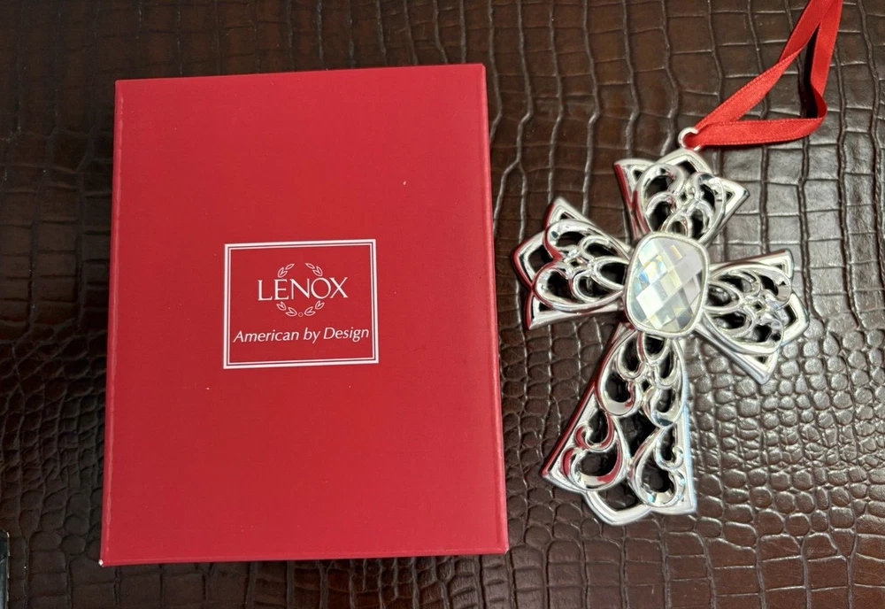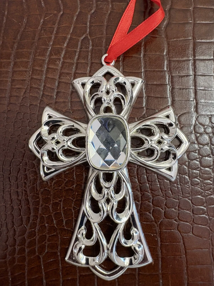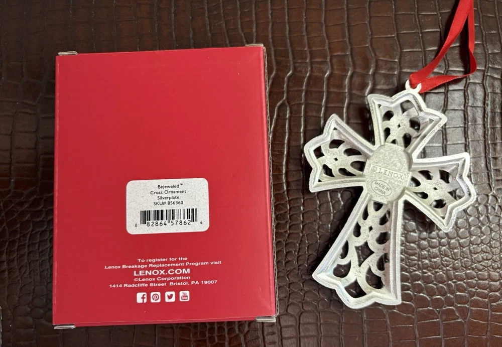 Add some sparkle to your Christmas tree with this Lenox Bejeweled Cross Silverplated Crystal Ornament. The ornament features a beautiful cross shape adorned with a shimmering crystal, making it a perfect addition to your ornament collection. This original piece comes in its original packaging and is sure to impress. Crafted with high-quality materials, this ornament is not only stunning but also durable. Measuring 3.5 inches in length and 4.75 inches in height.