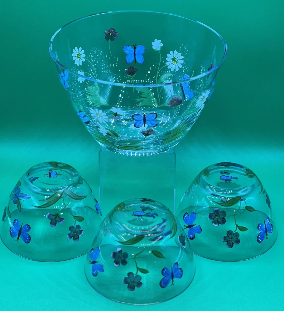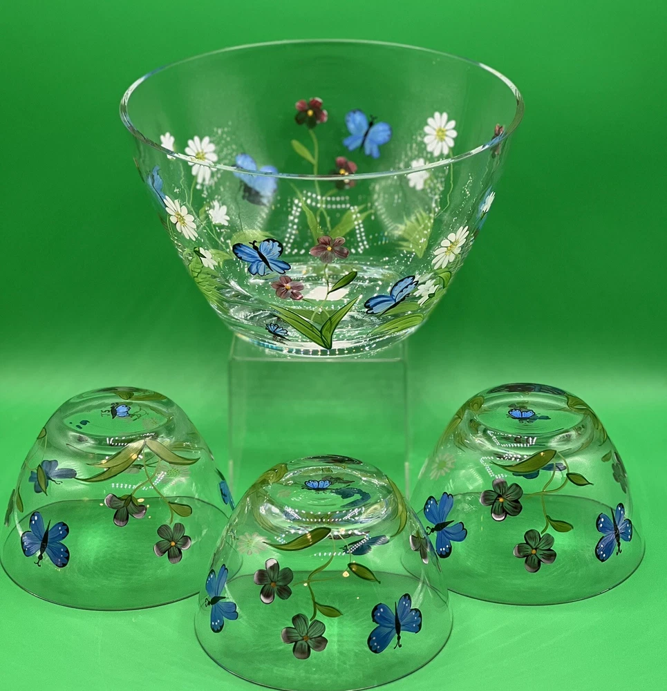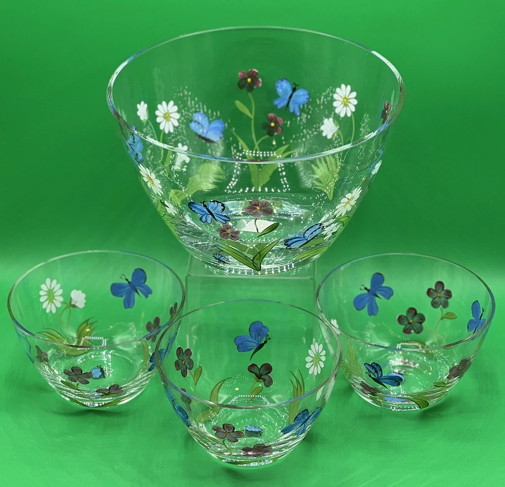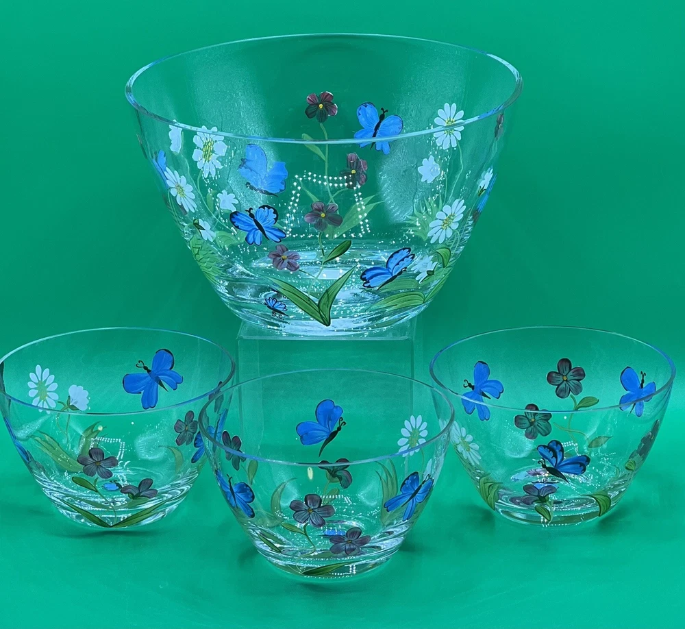 The Lenox Butterflies and Blossoms Salad Glass Bowl set includes a 9-inch hand-painted signed by artist salad bowl along with three additional 5.5” serving bowls. The design features a multicolor pattern of flowers and butterflies, creating a vibrant and elegant look. Made of glass, this round bowl set is perfect for serving salads or other dishes, adding a touch of beauty to any dining table. The hand-painted details give the set a unique and artistic appeal, making it a charming addition to any collection.